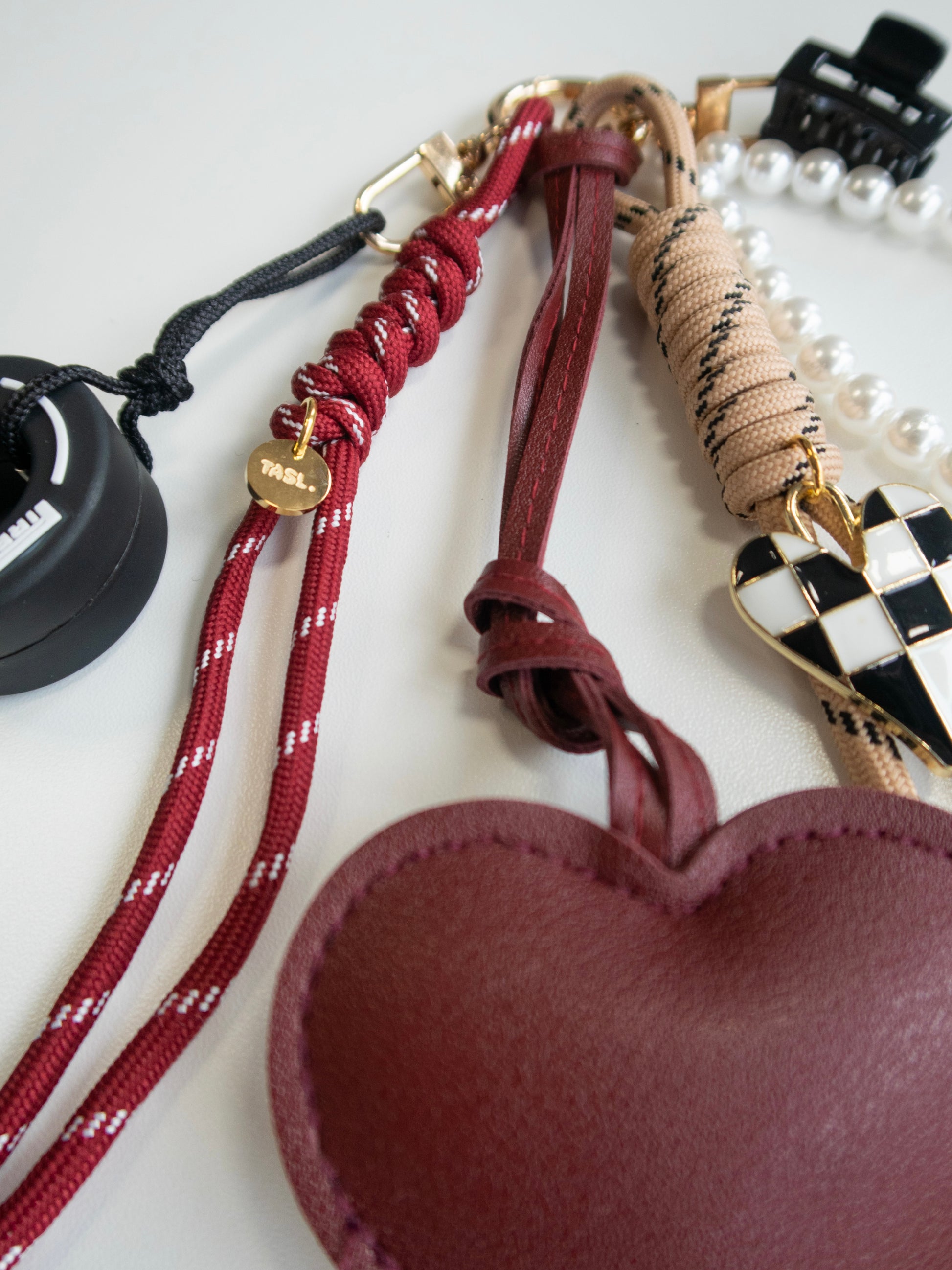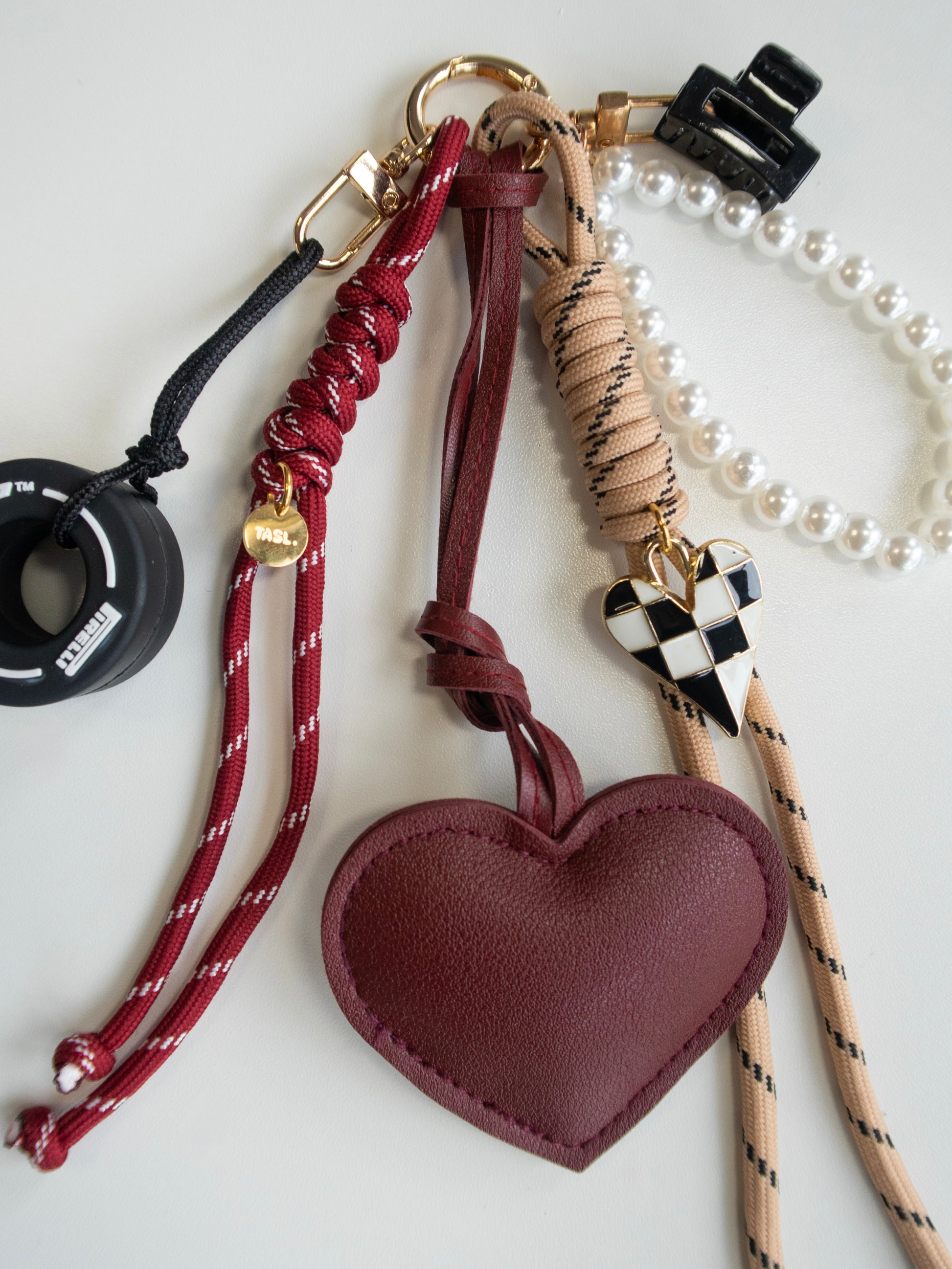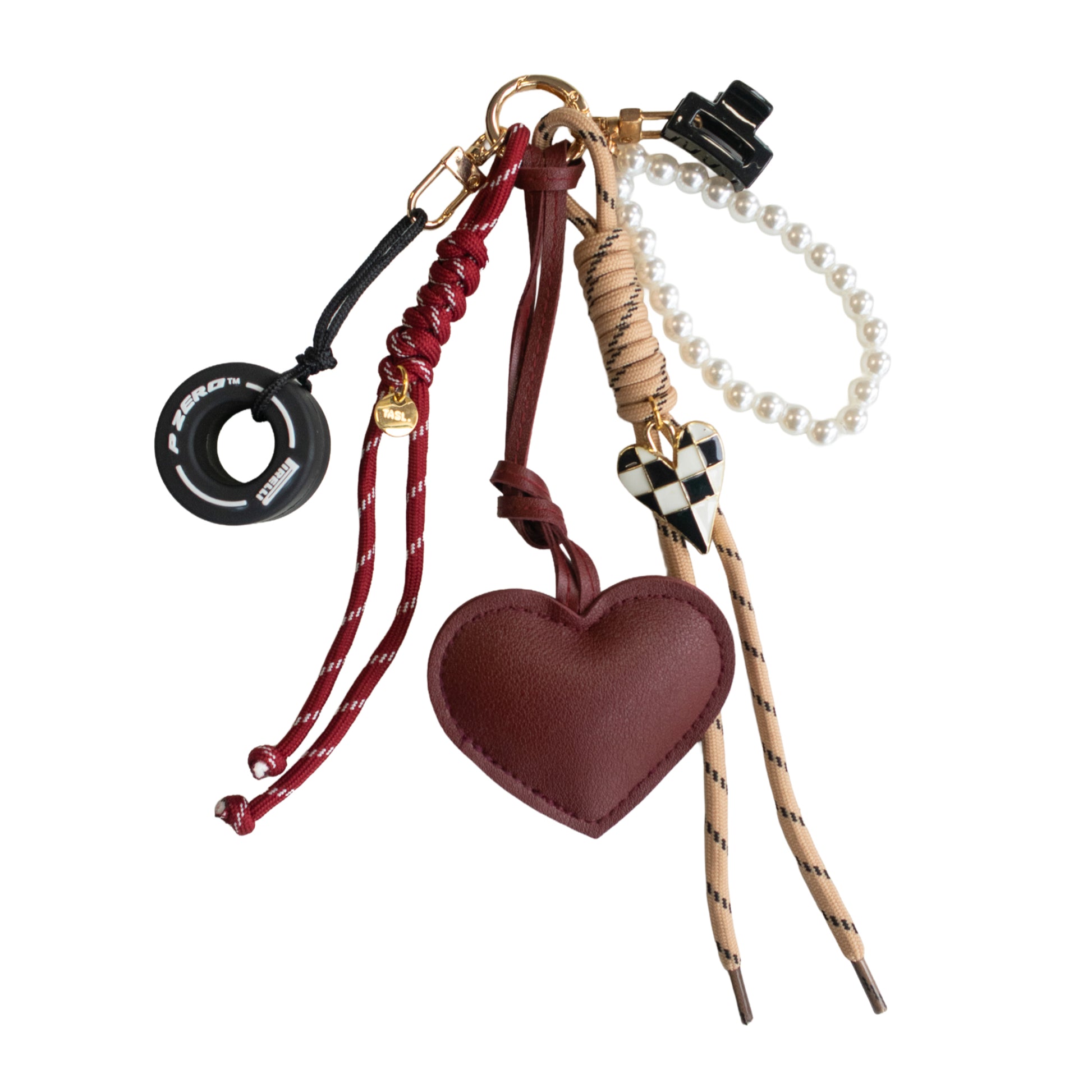 Gold-toned hardware, PU leather heart, miniature tyre, pearl-effect detail and tiny claw clip.