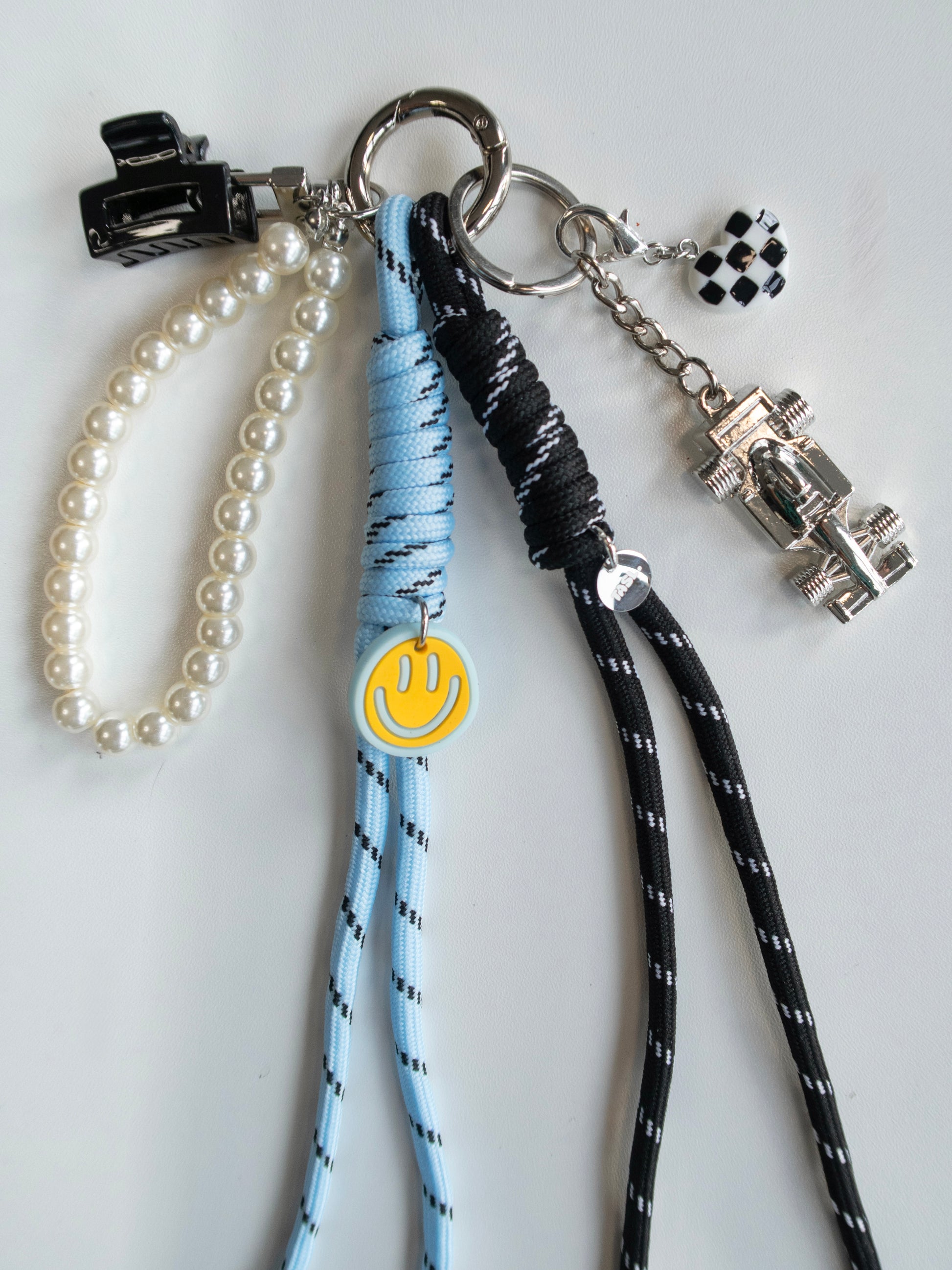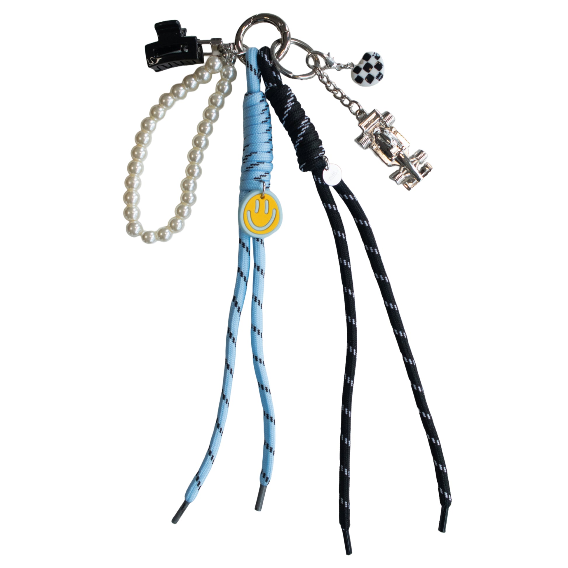 Silver-toned hardware, pocket-sized race car, checkered heart and pearl-effect detail.
