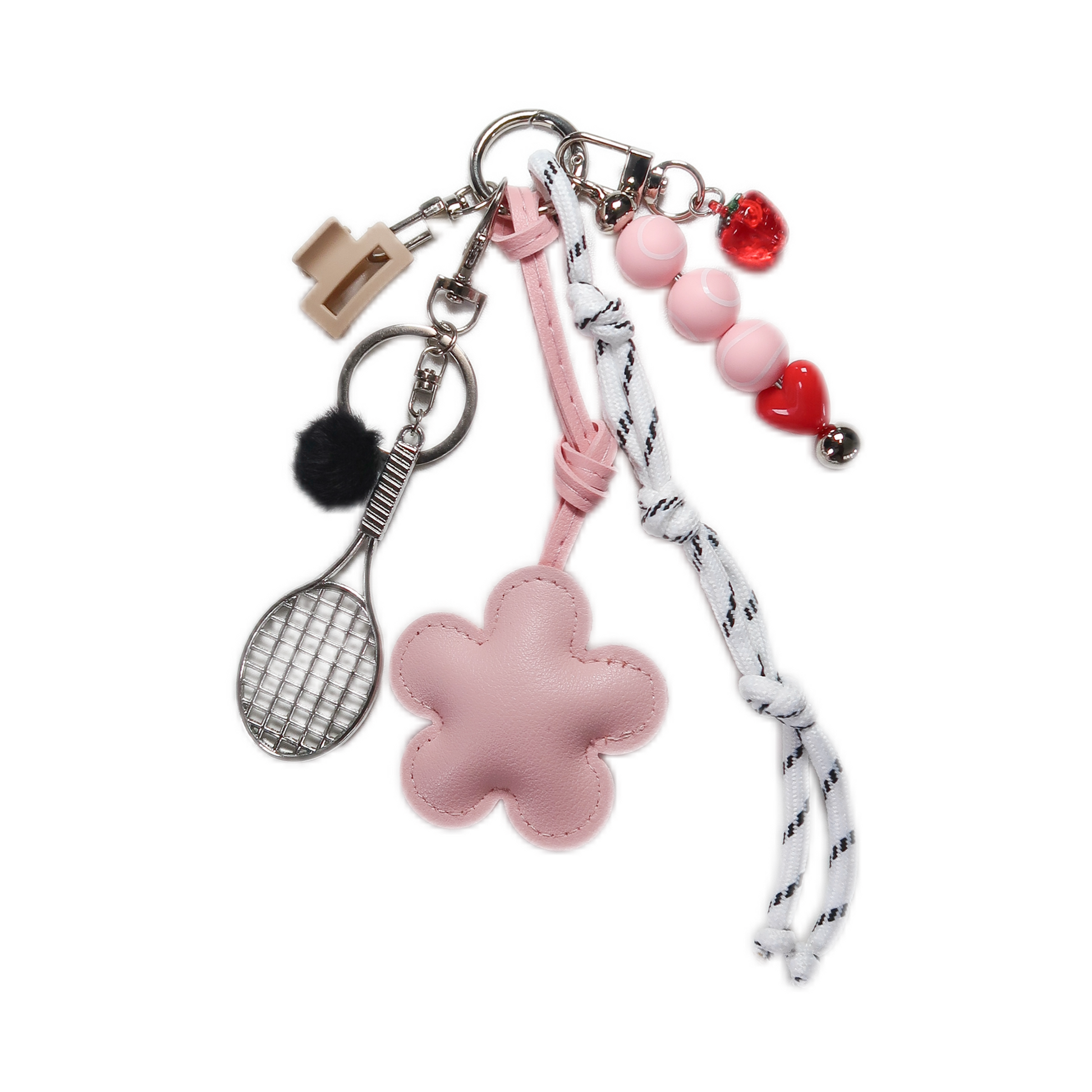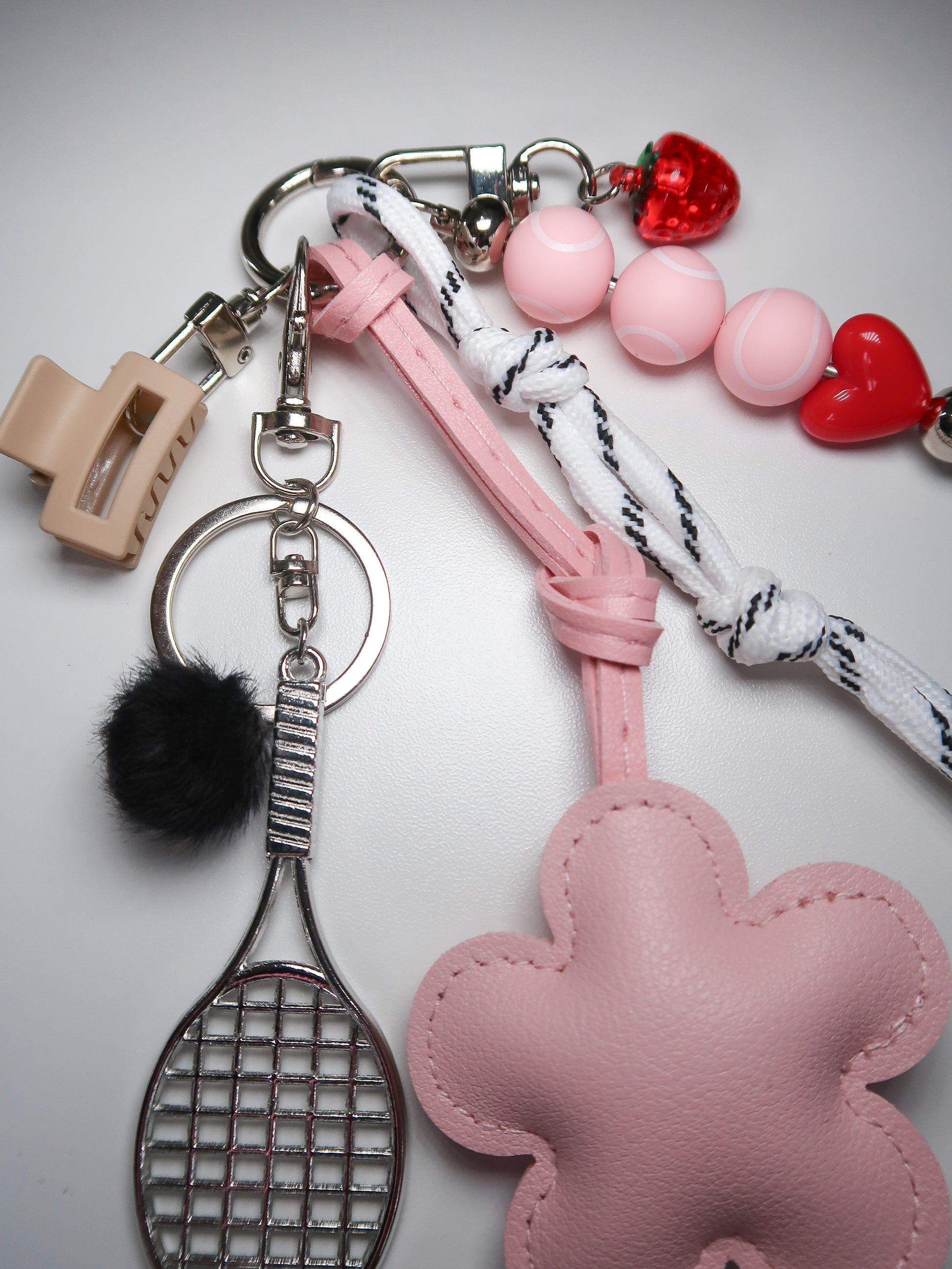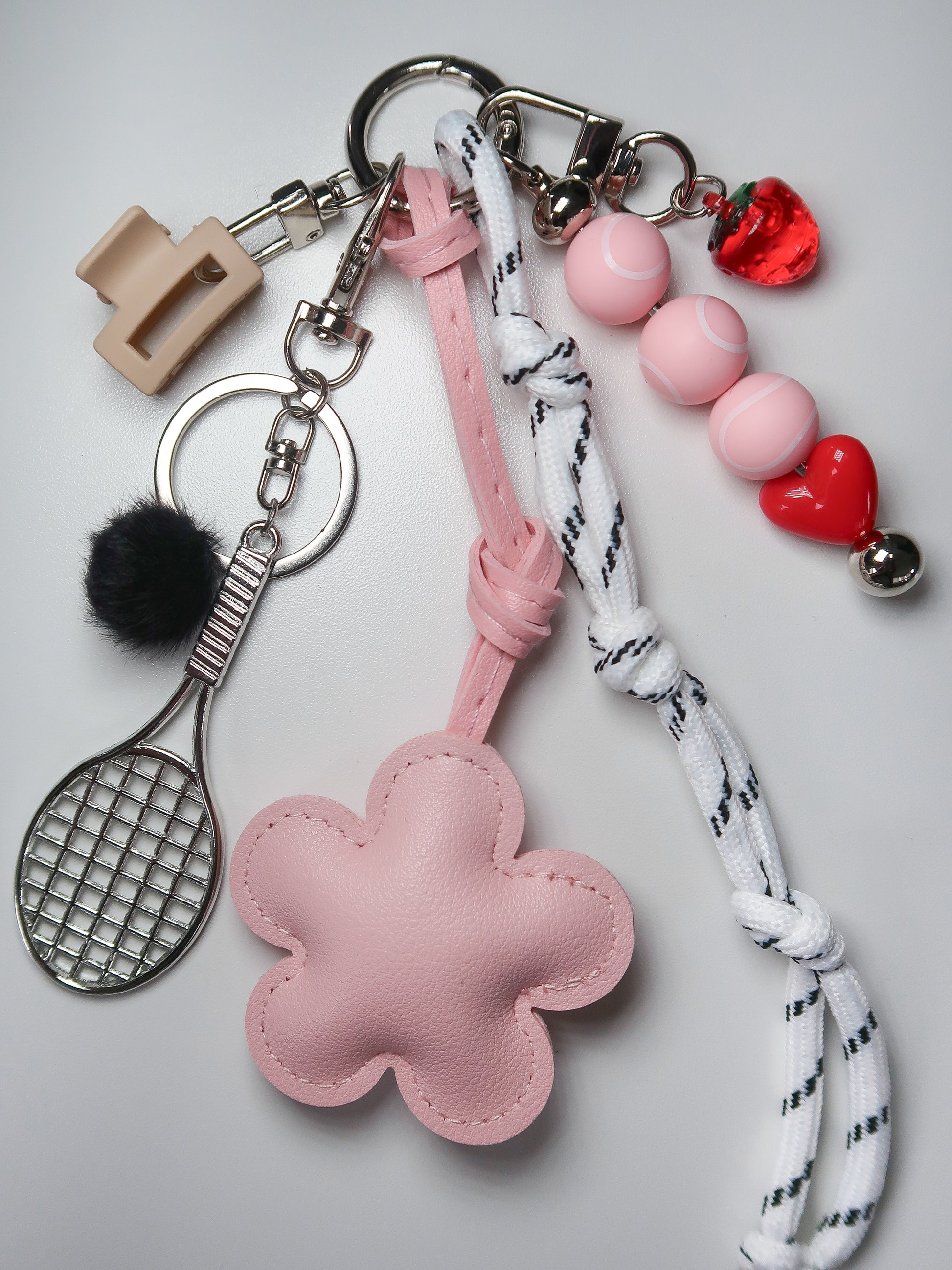 Hand-curated charm with PU leather flower, silicone tennis ball beads, miniature strawberry and your very own pocket-sized tennis racket.