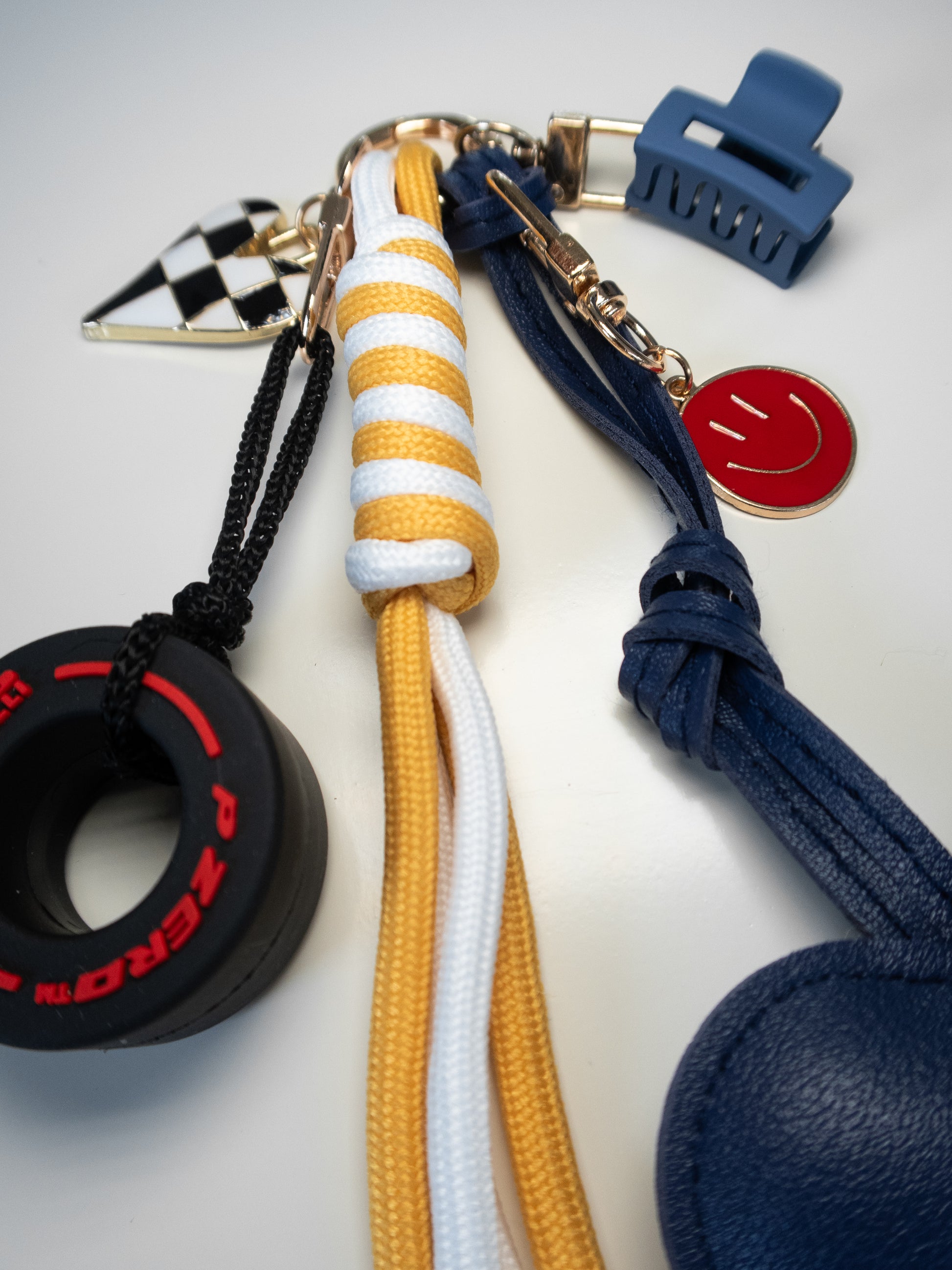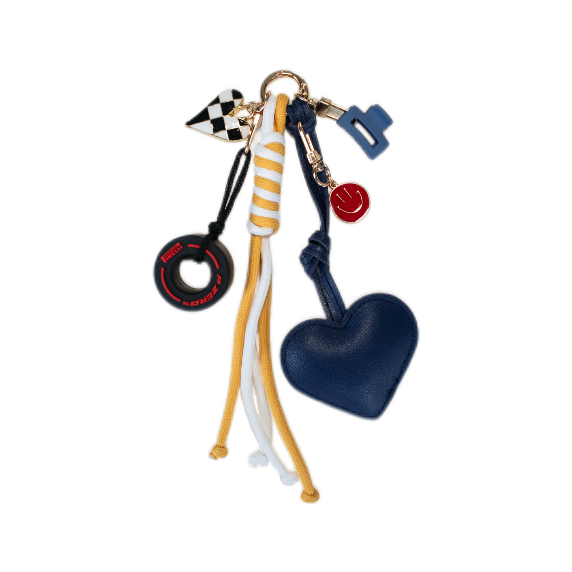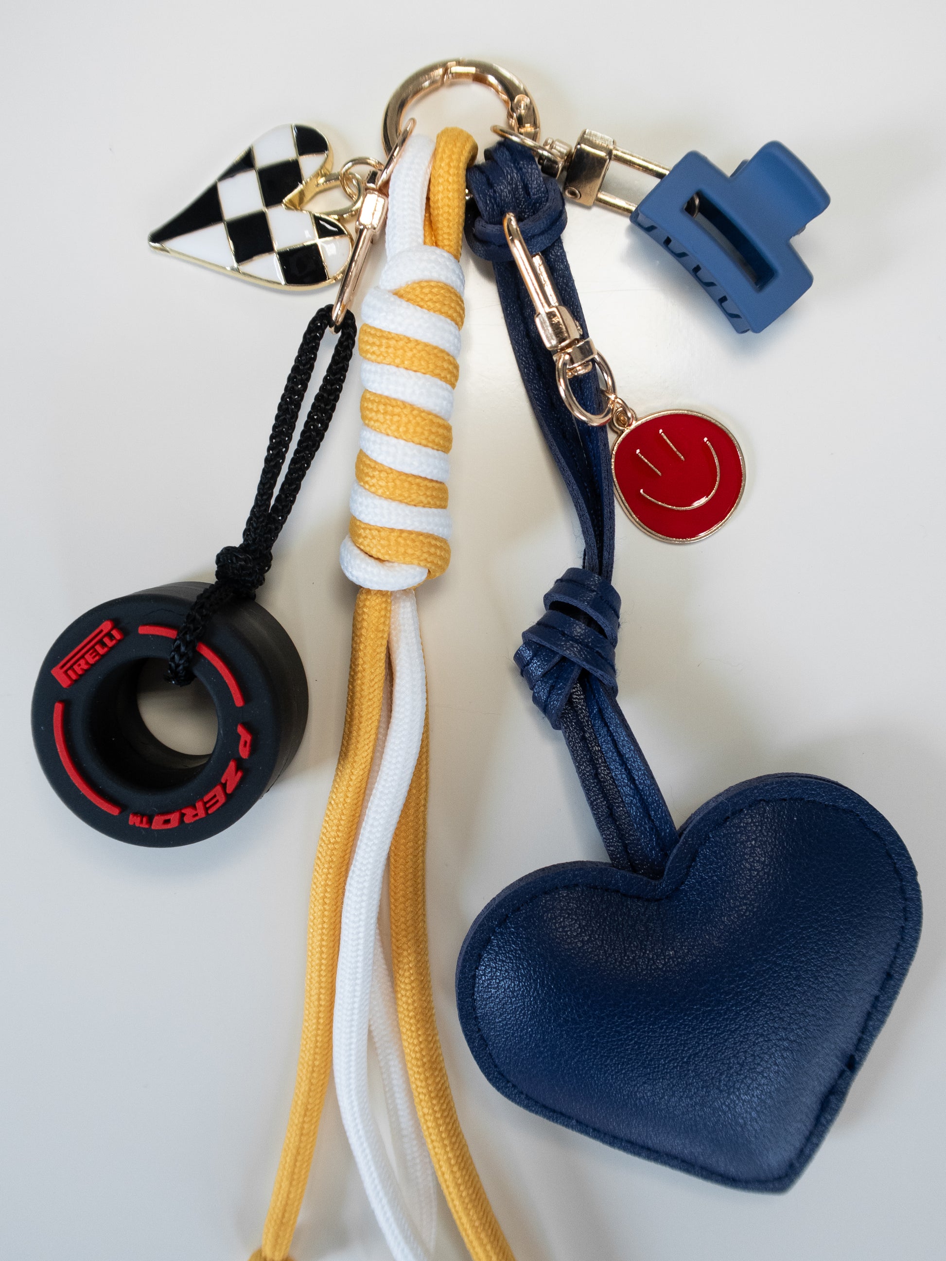 Hand-curated charm with chequered heart, PU leather heart, twisted nylon rope tassel and your very own miniature tyre.