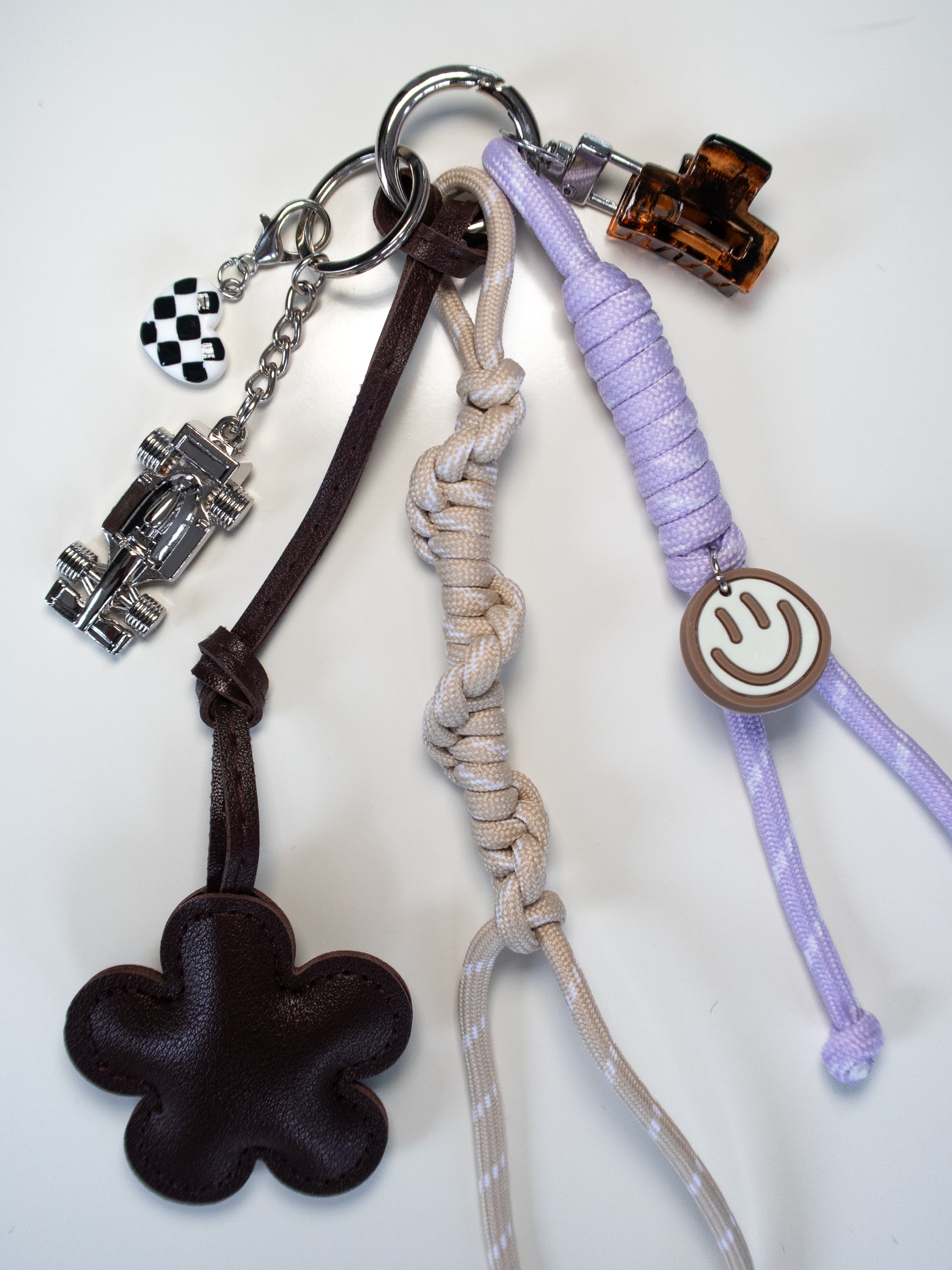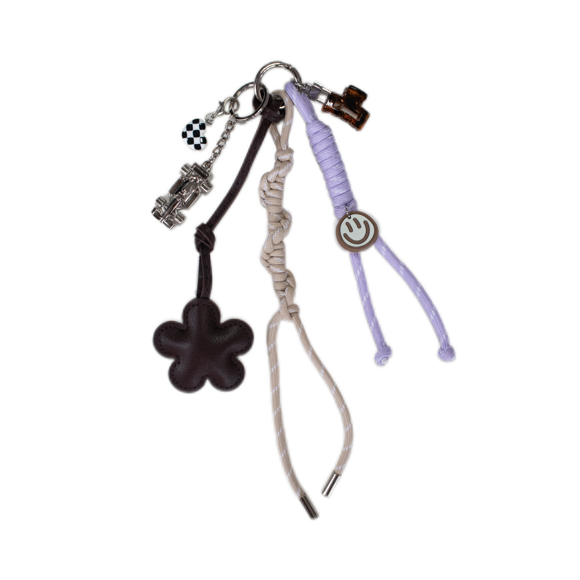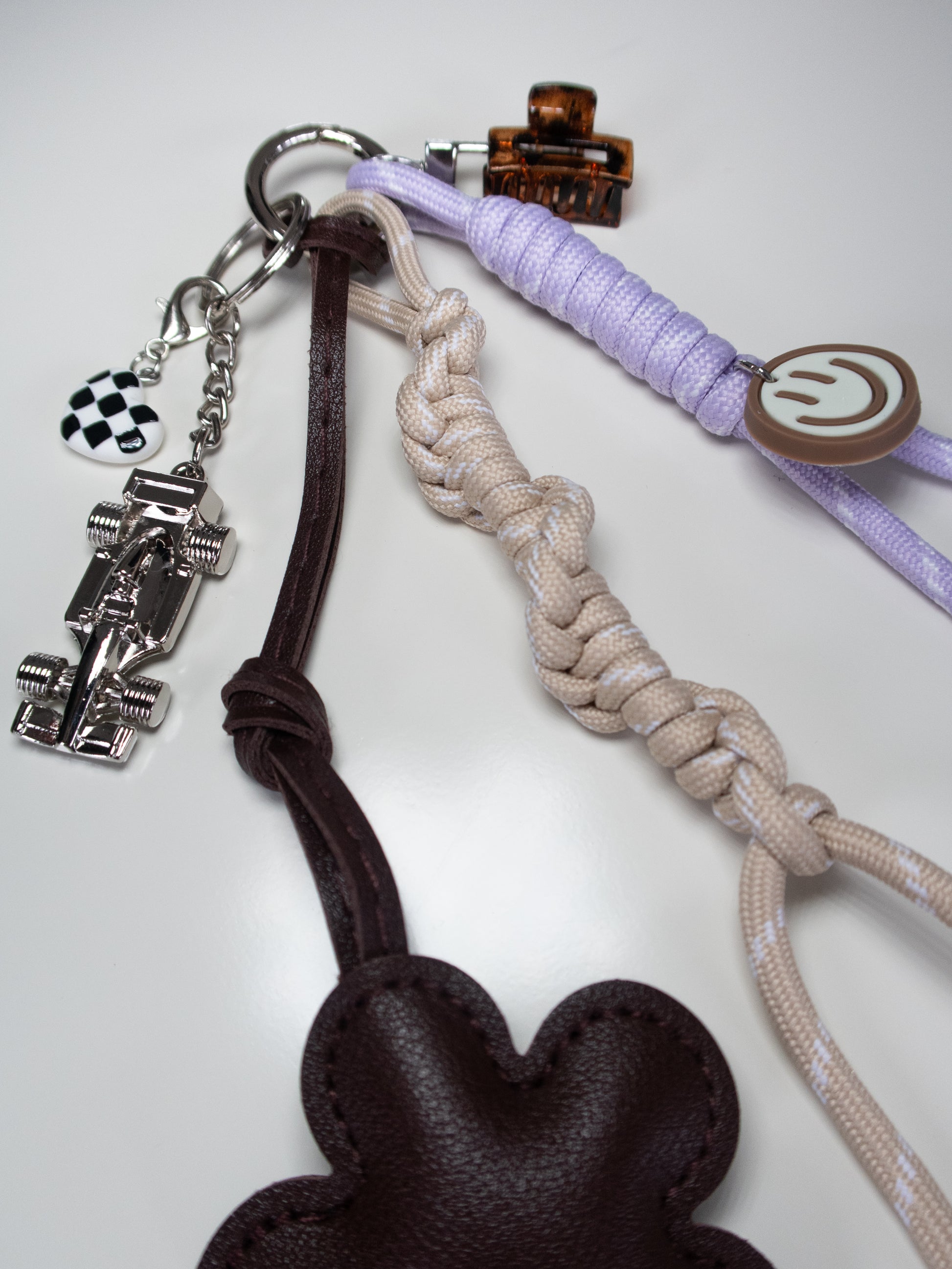 Hand-curated charm with chequered heart, PU leather flower, twisted nylon rope tassel and your very own pocket-sized race car.
