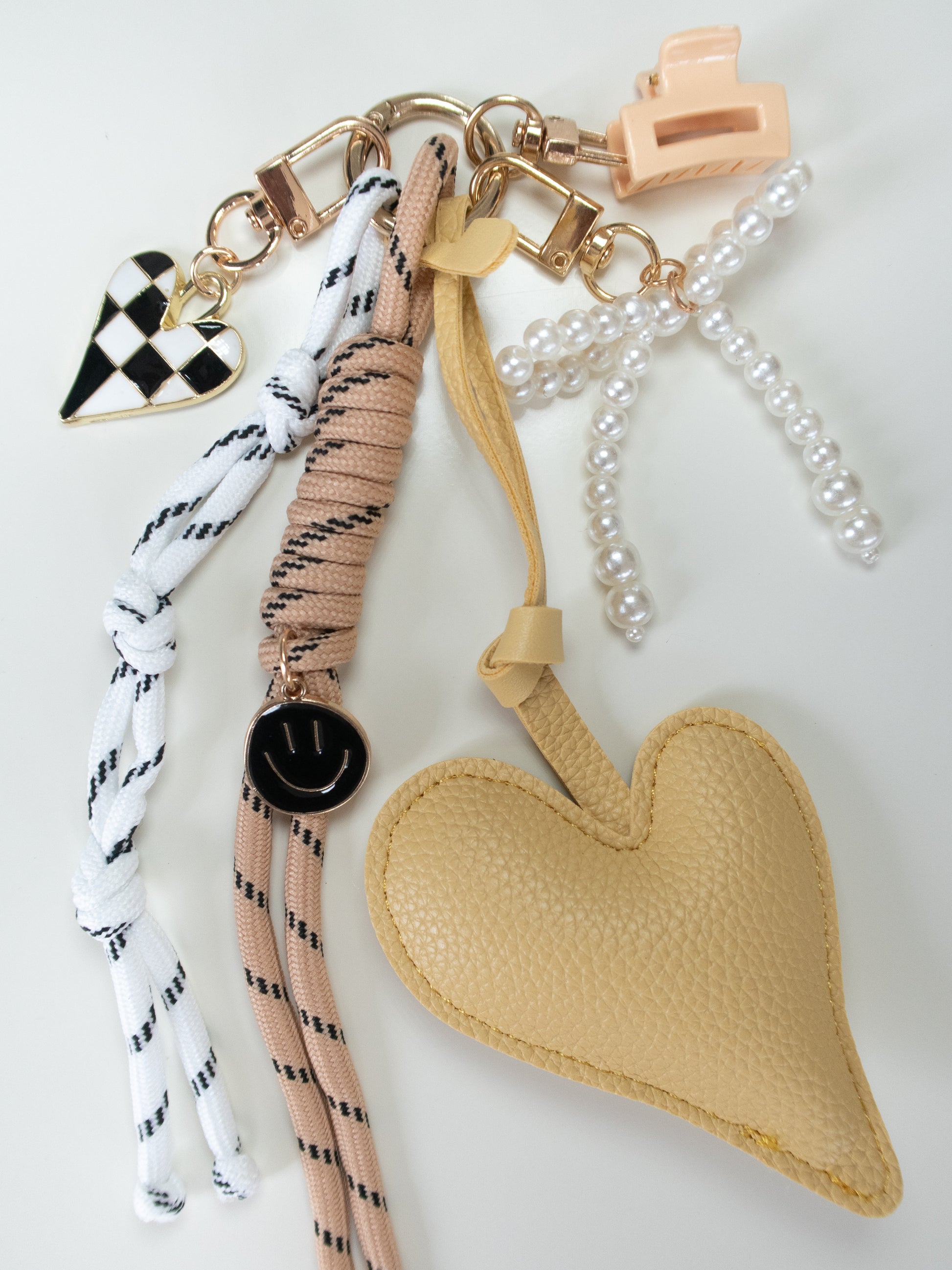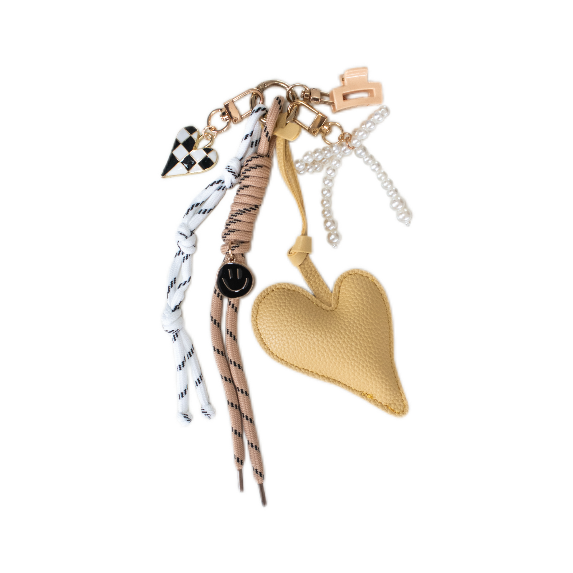 Hand-curated charm with chequered heart, irregular PU leather heart, pearl-effect beads and miniature claw clip.