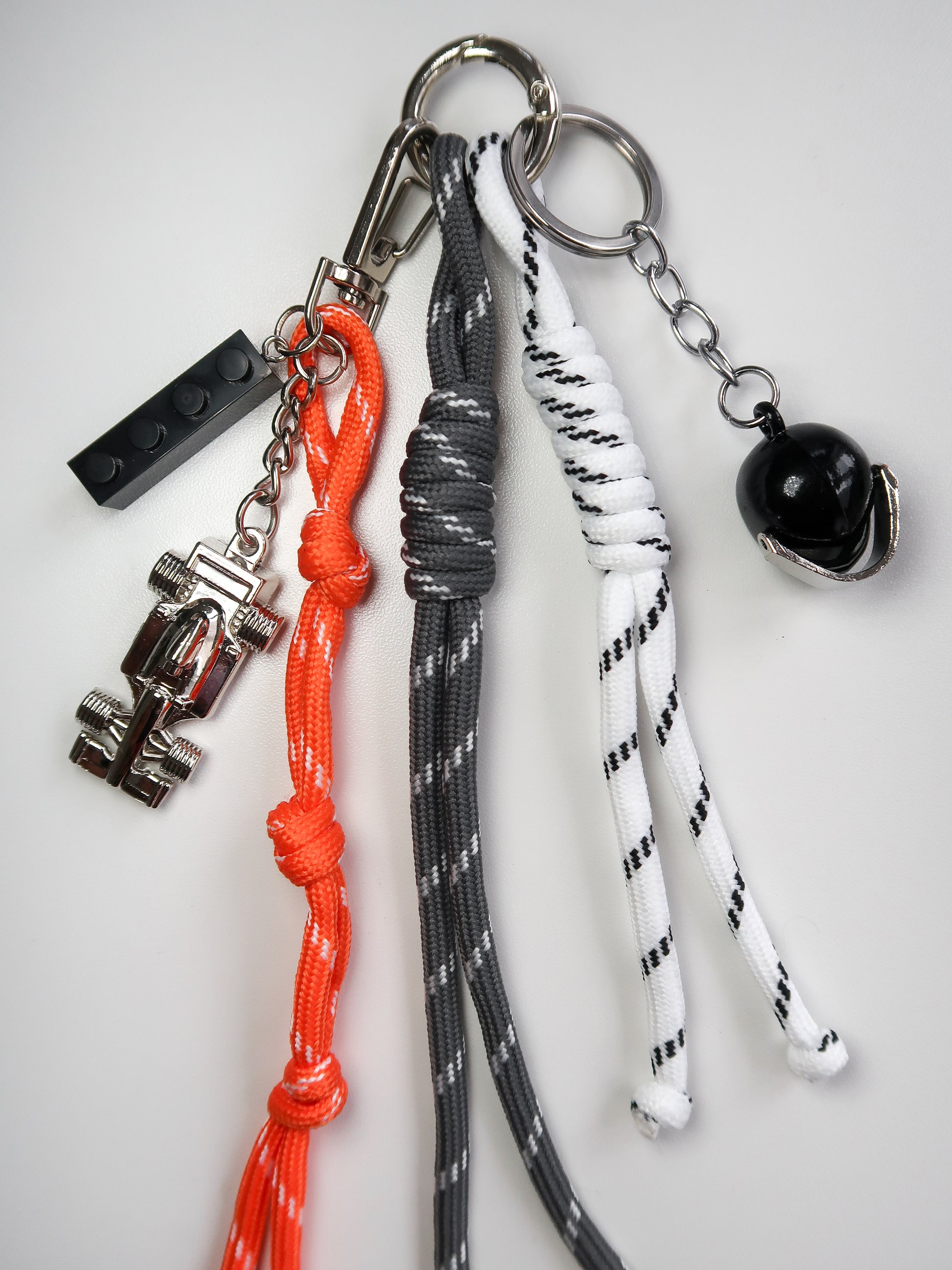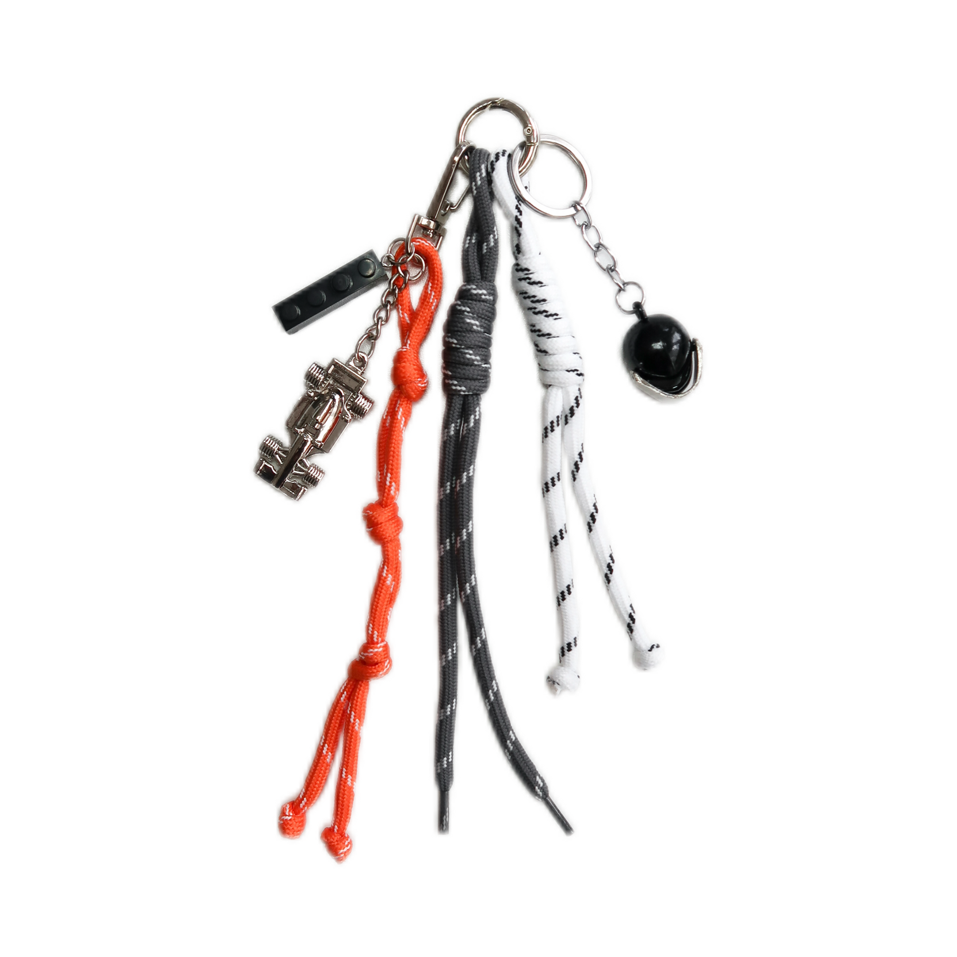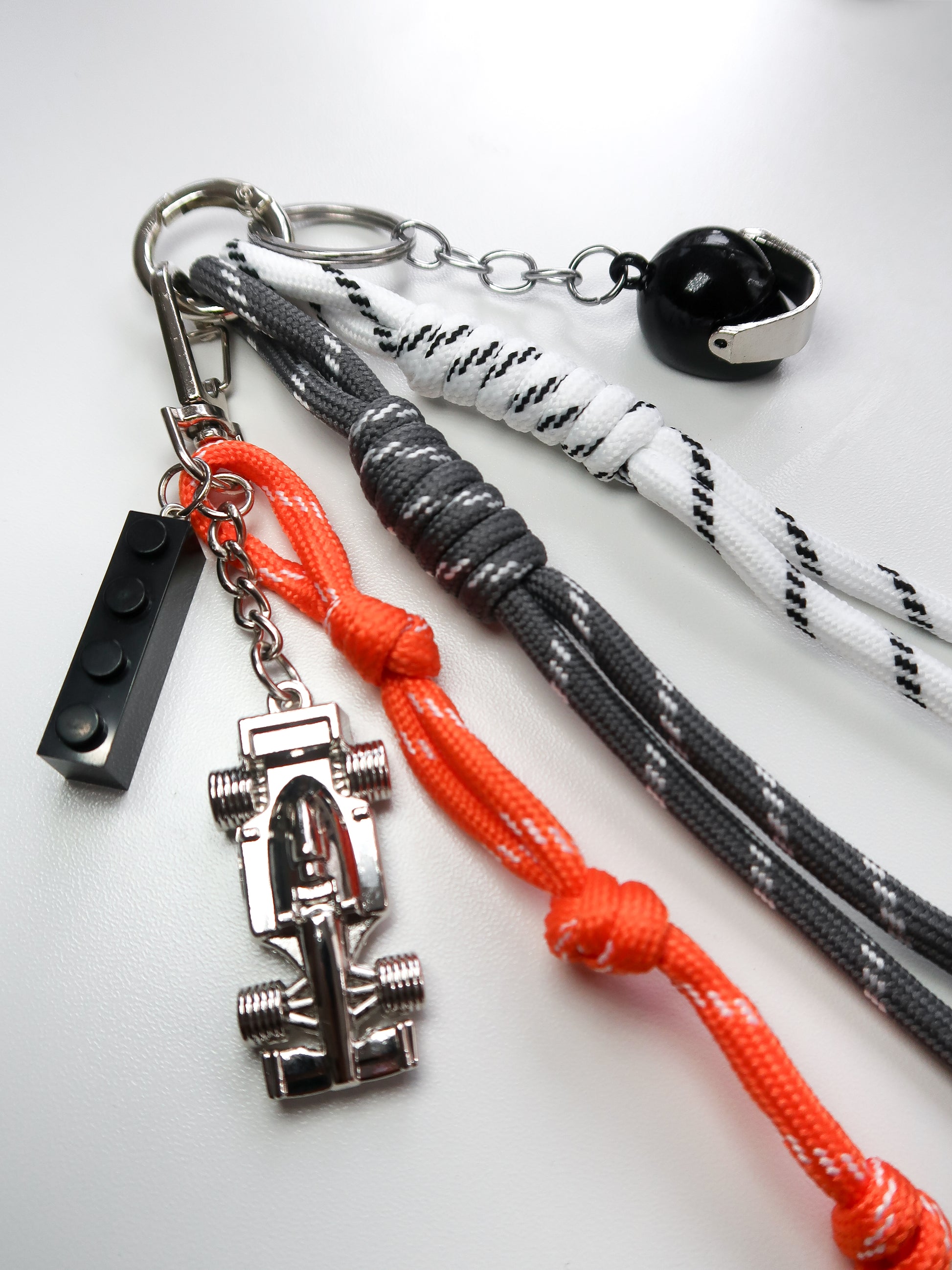 Hand-curated charm with miniature helmet, nylon rope tassels, building block and your very own pocket-size racecar.