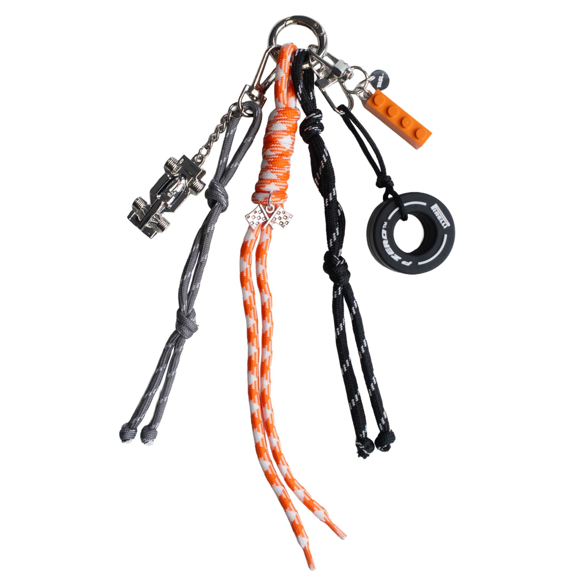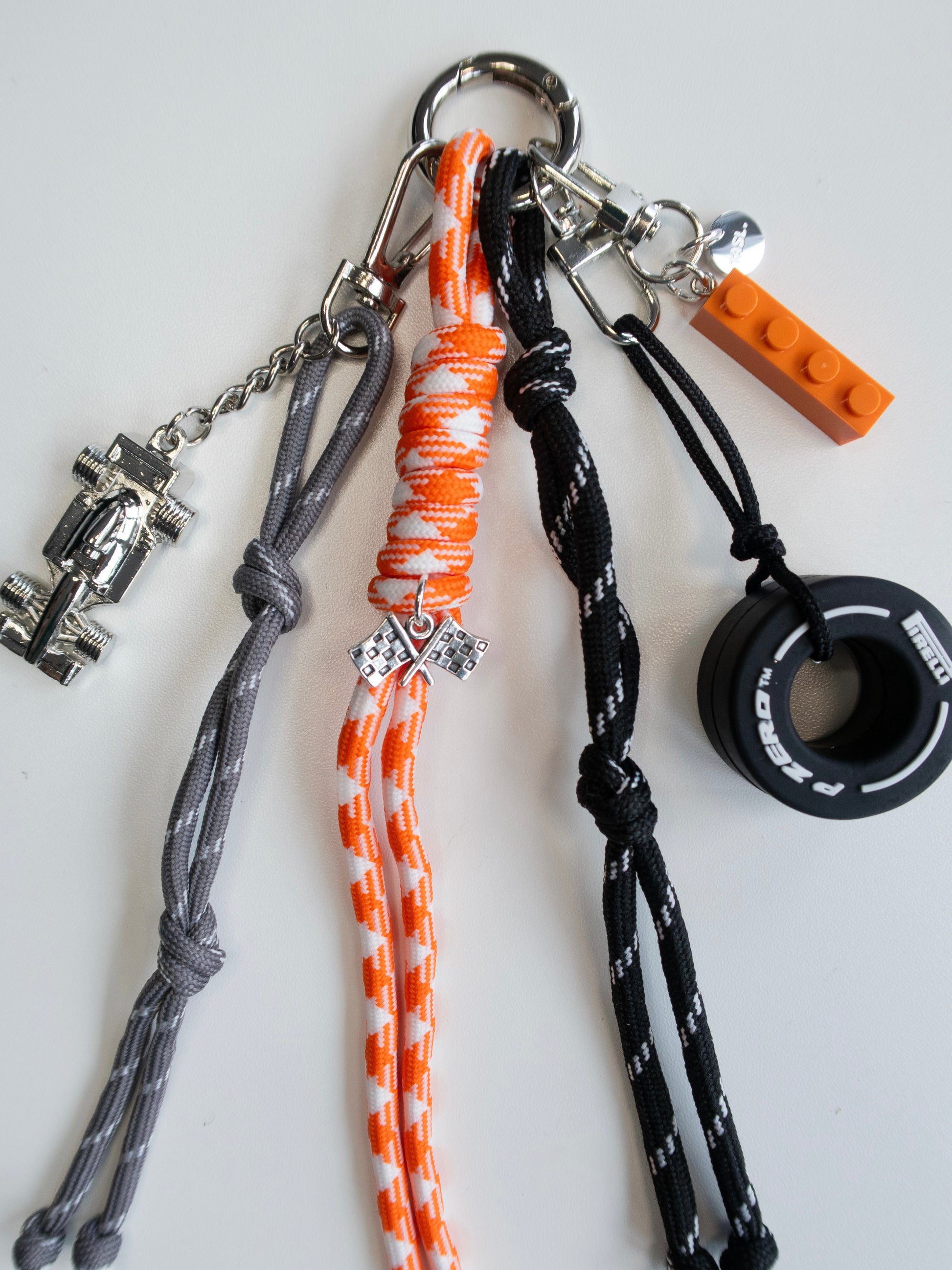 Silver-toned hardware, miniature tyre, pocket-sized race car and checkered flag detail.