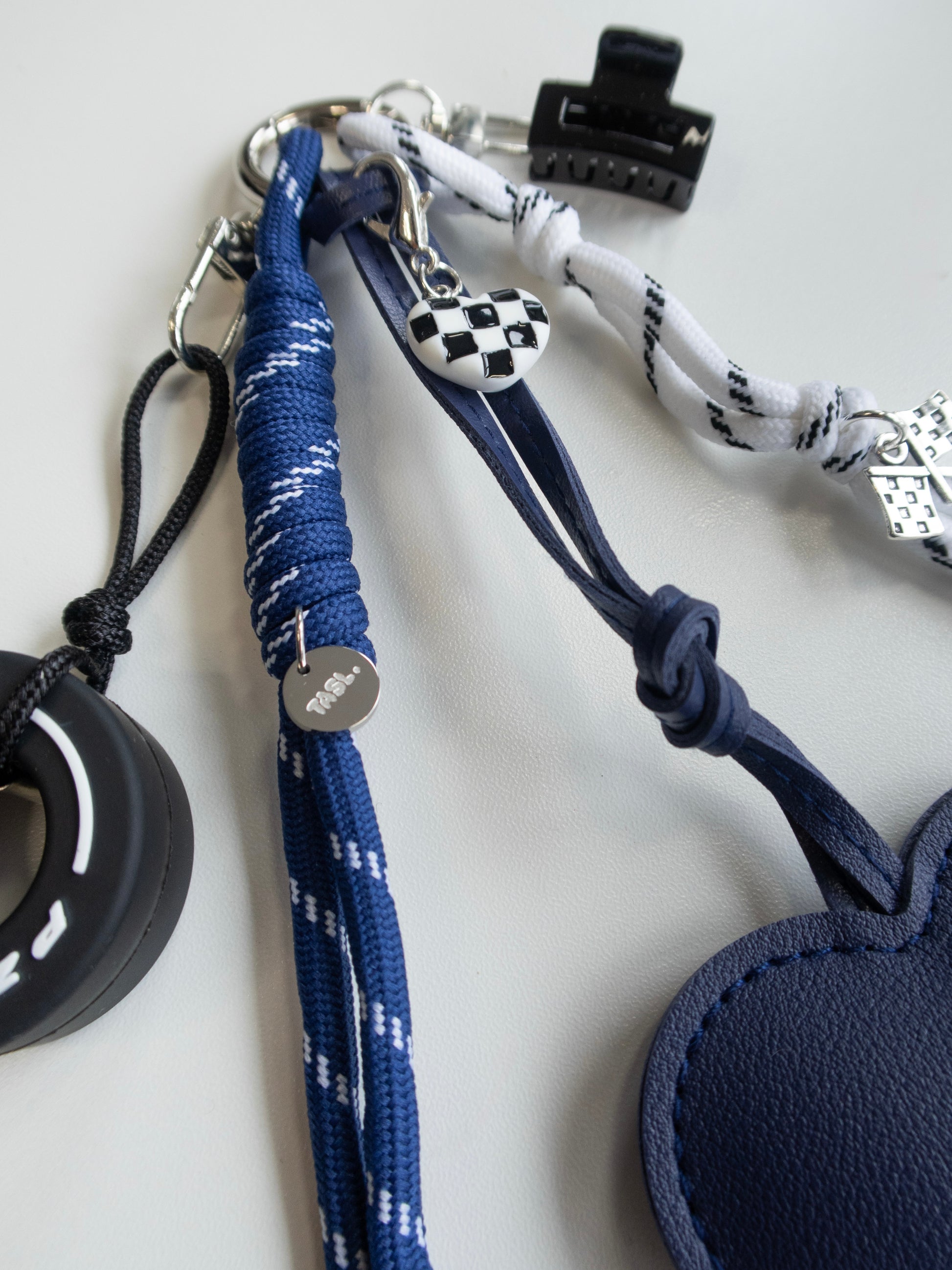 Silver-toned hardware, PU leather heart, miniature tyre and checkered flag components.
