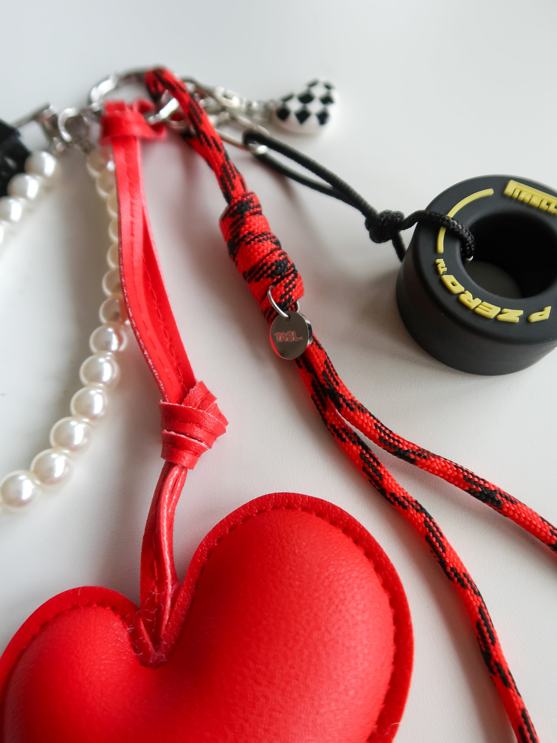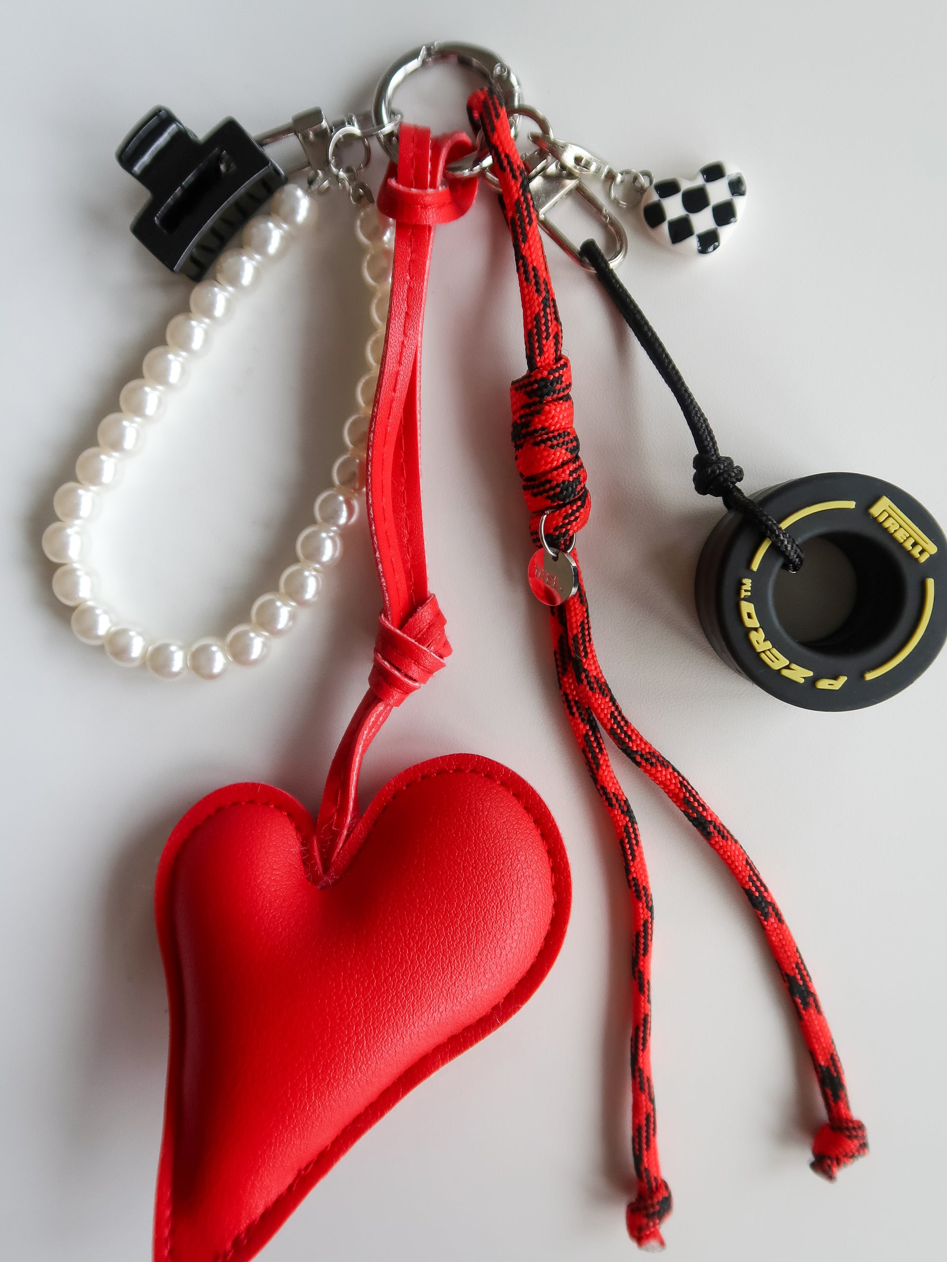 Silver-toned hardware, PU leather heart, pearl-effect beads & miniature tyre.