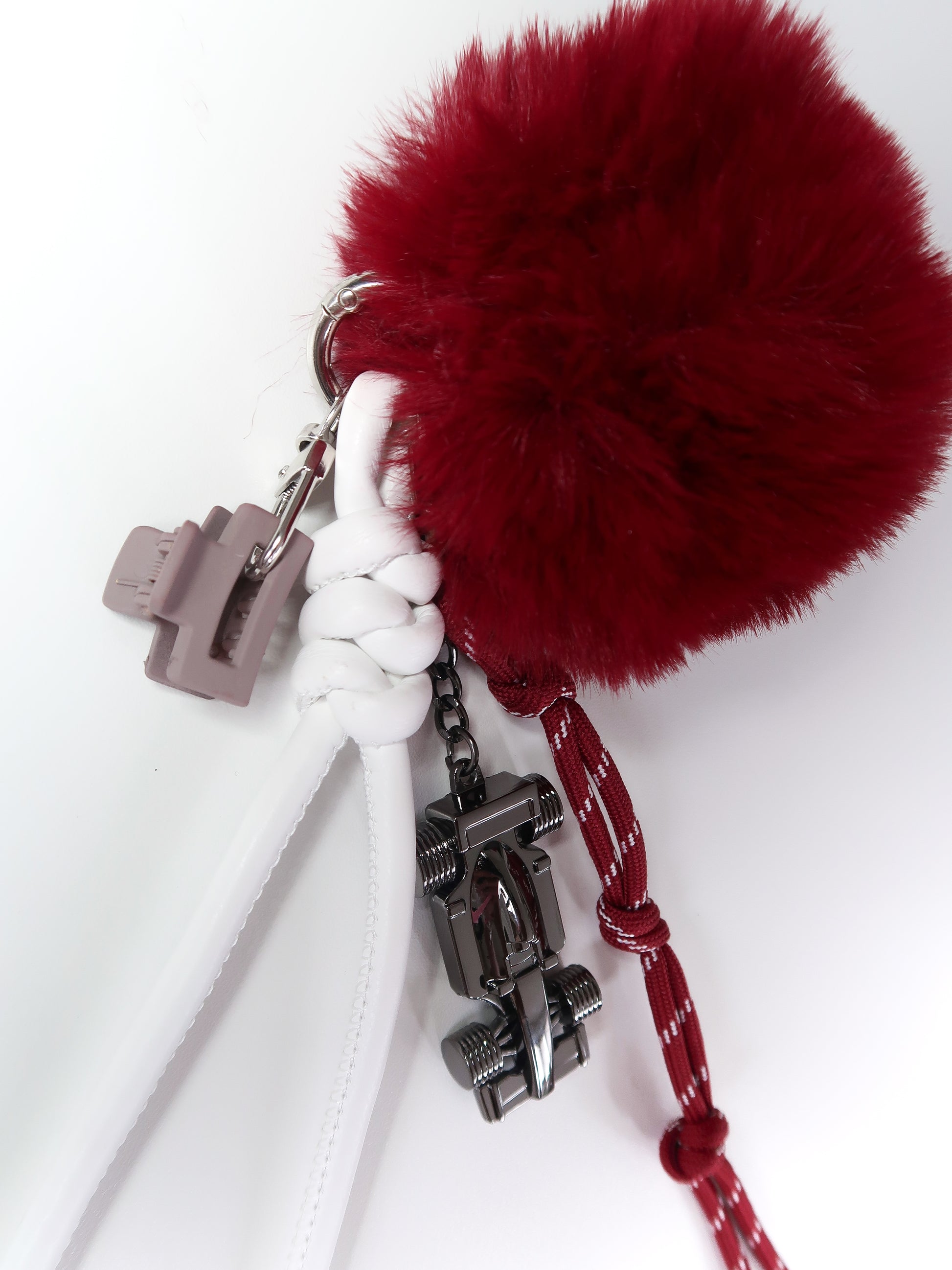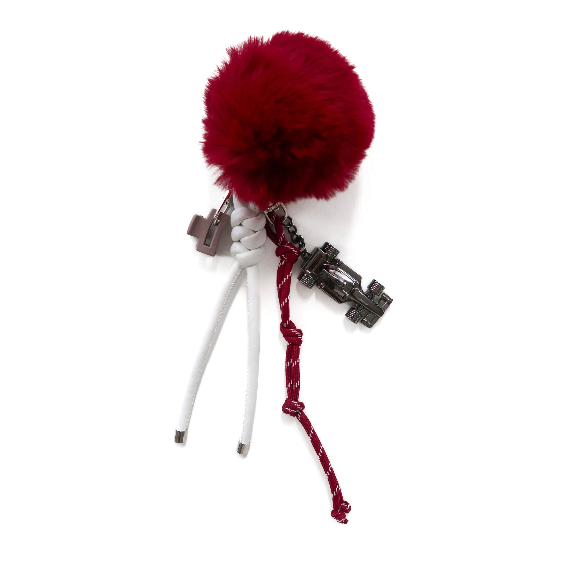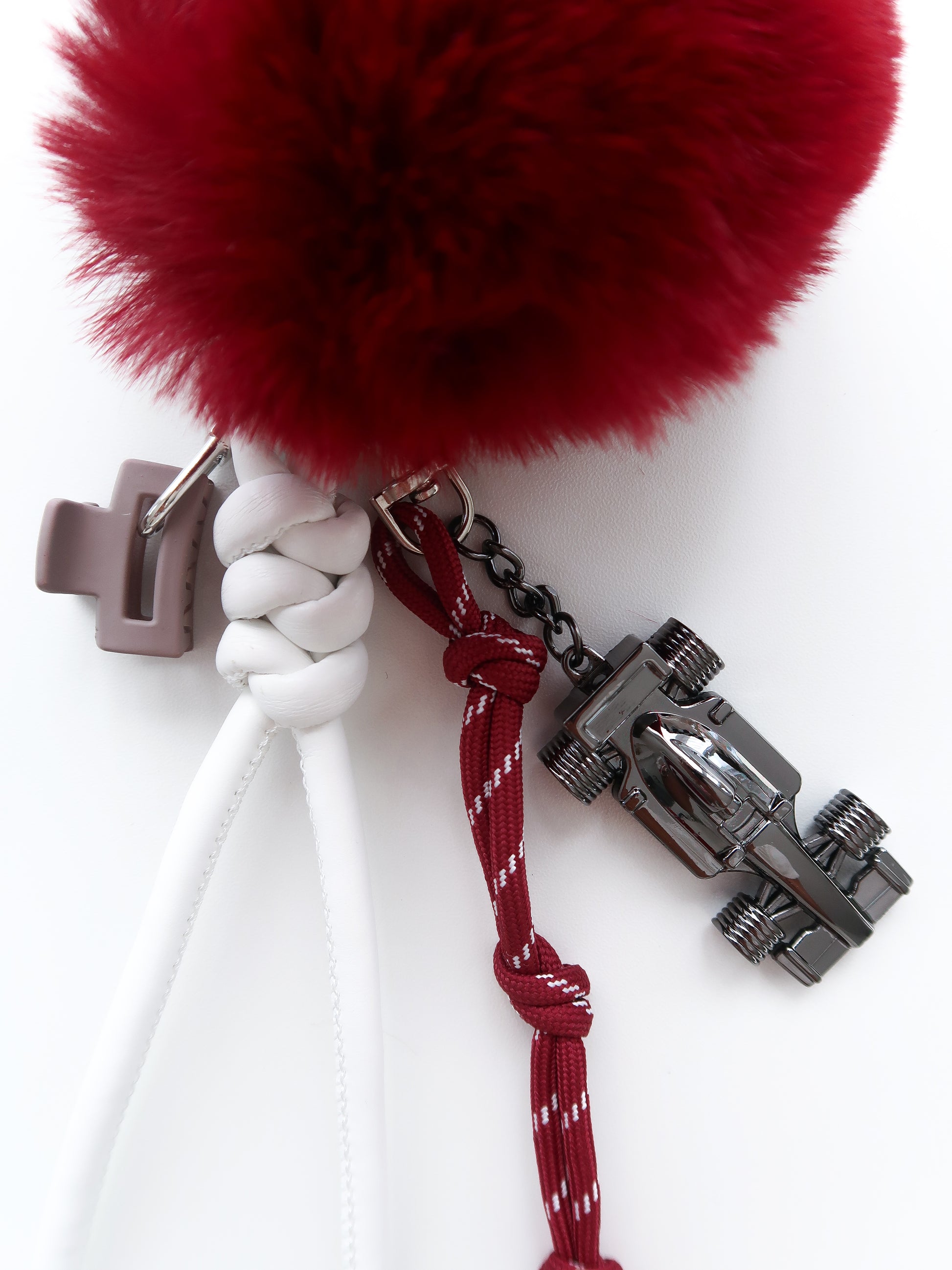 Hand-curated charm with large, burgundy pom-pom, PU leather tassel, miniature claw clip and your very own pocket-sized race car.