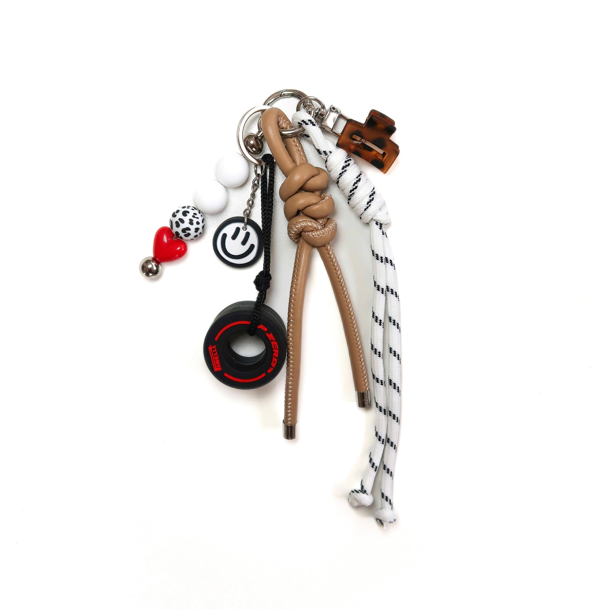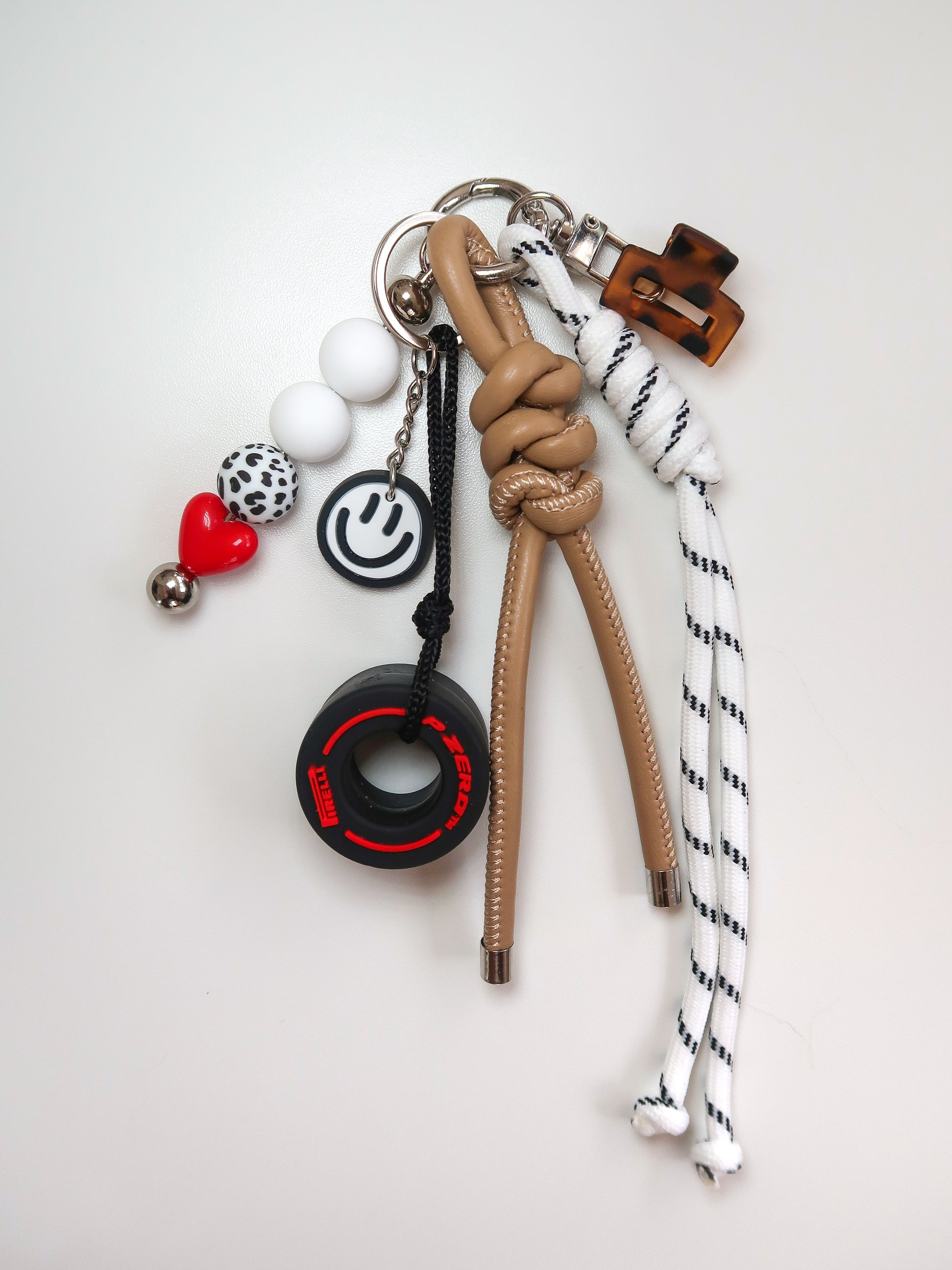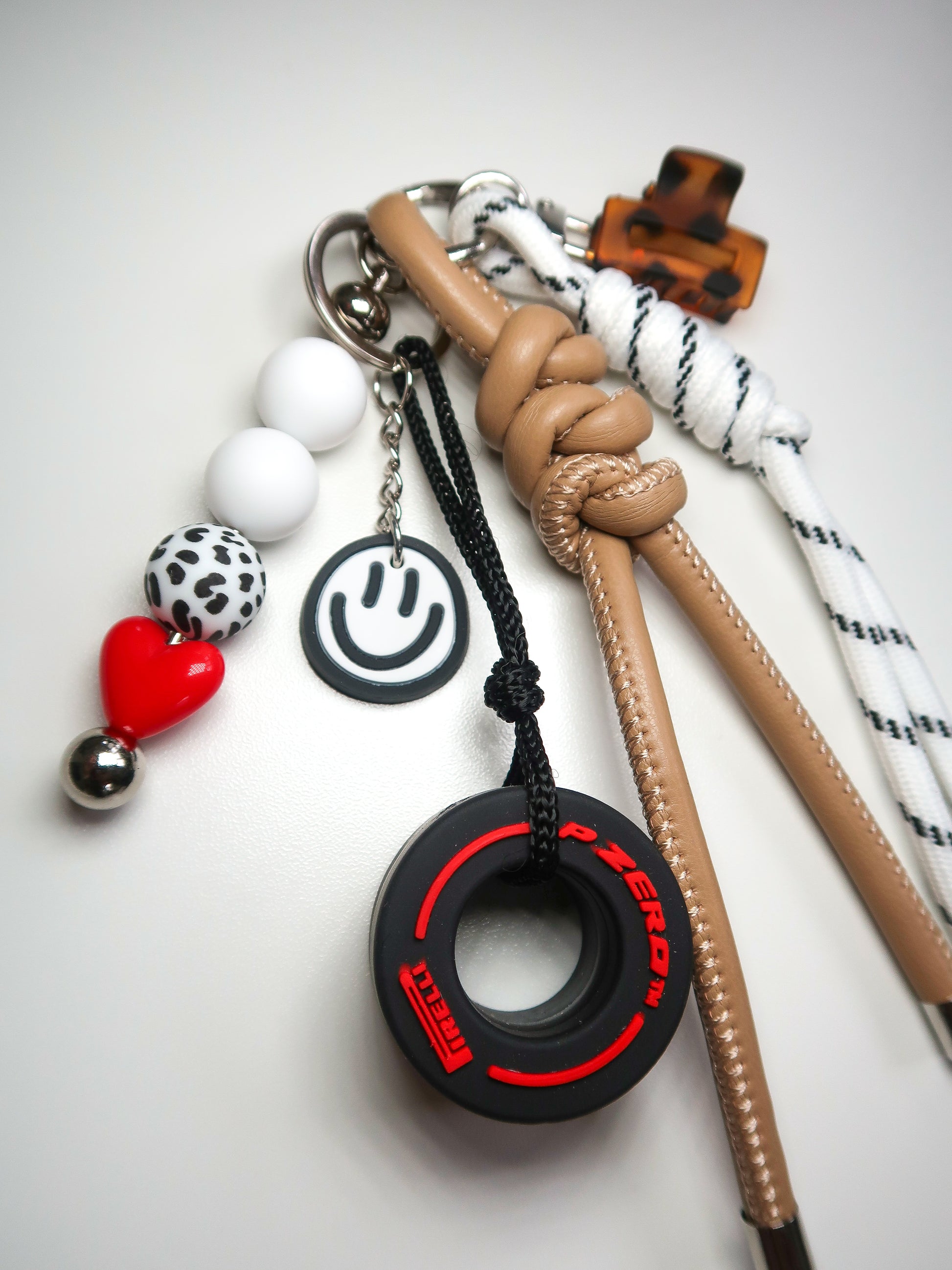 Hand-curated charm with PU leather tassel, silicone beads, claw clip and your very own miniature tyre.