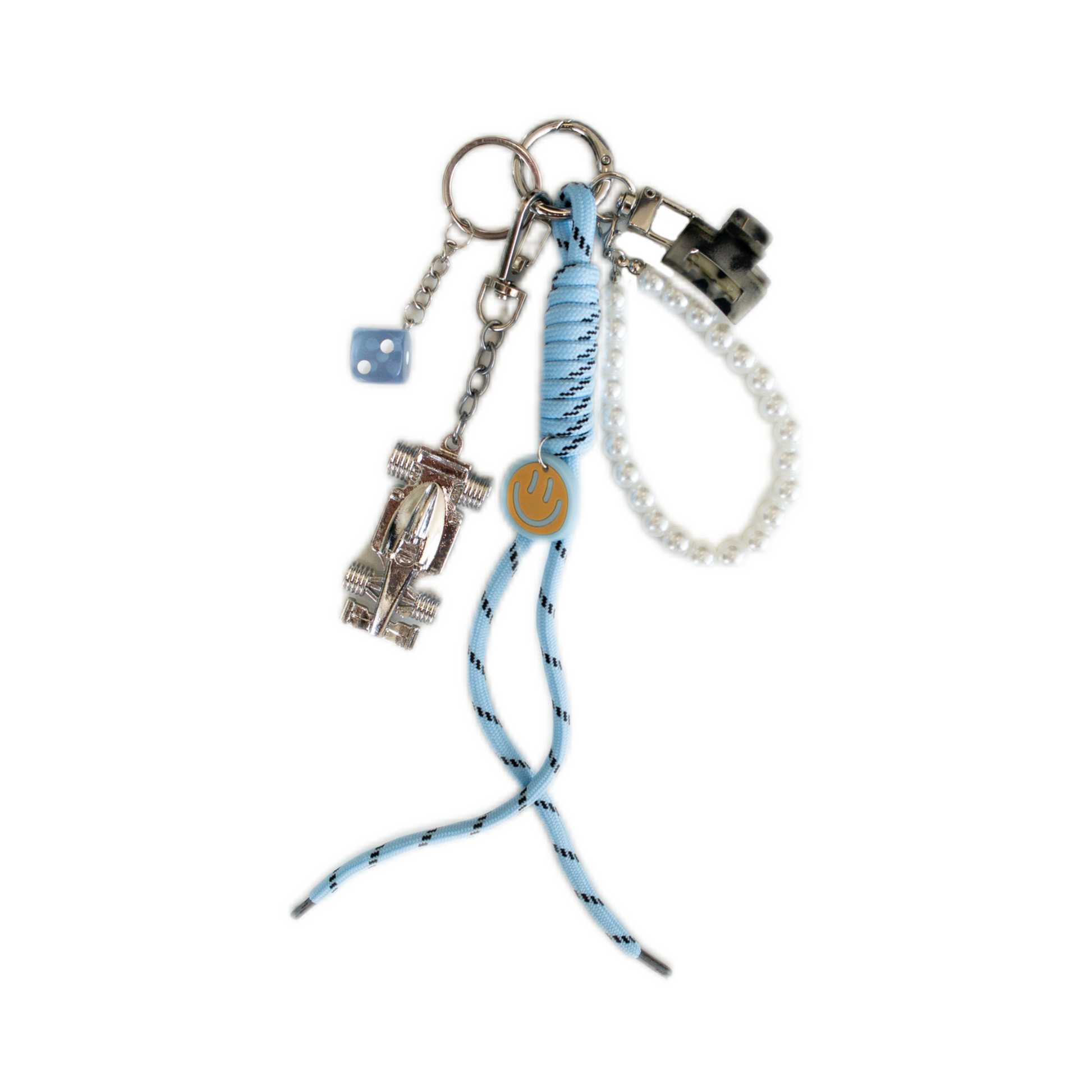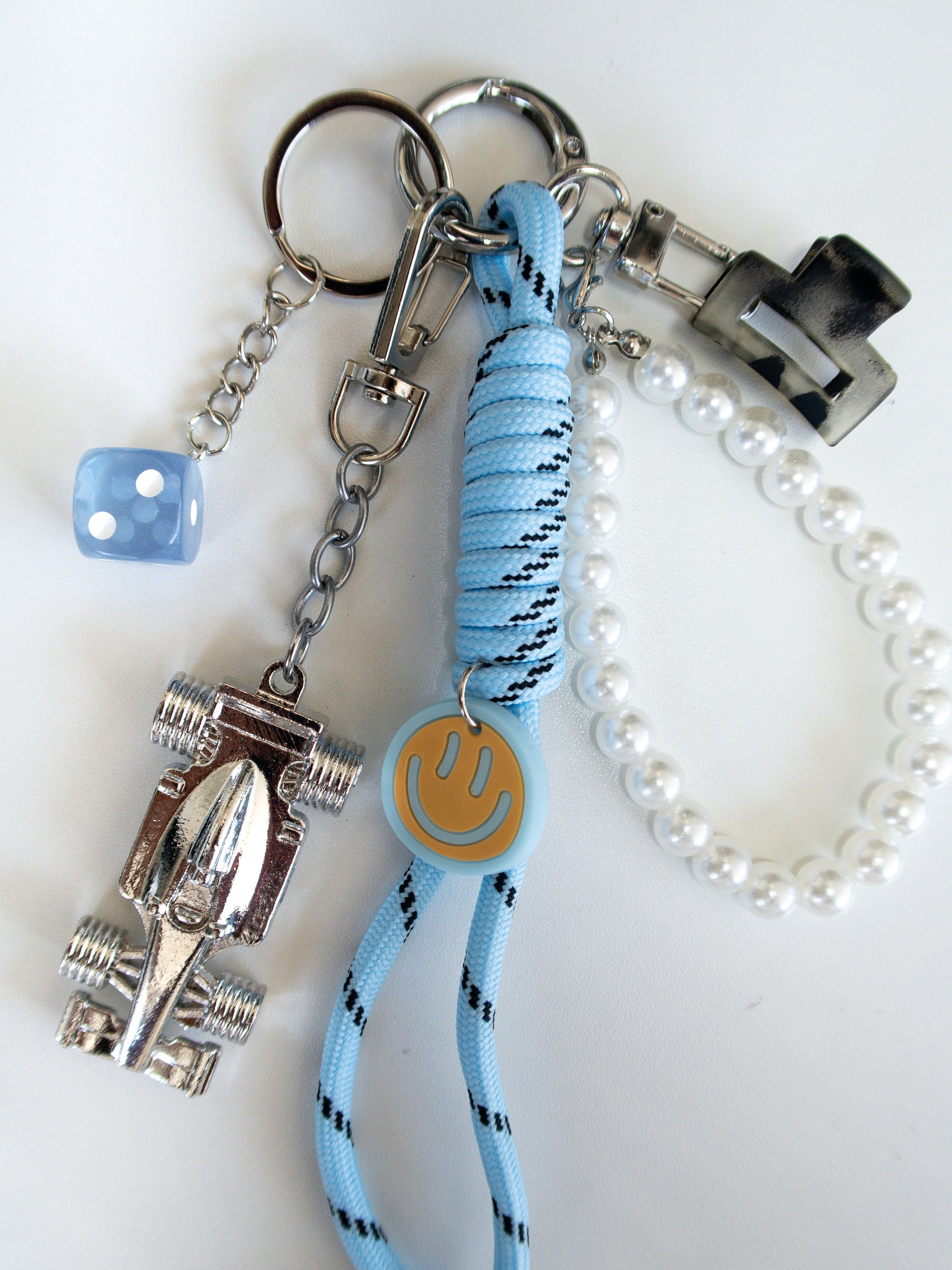 Hand-curated charm with pearl-effect beads, miniature claw clip and your very own pocket-sized race car.