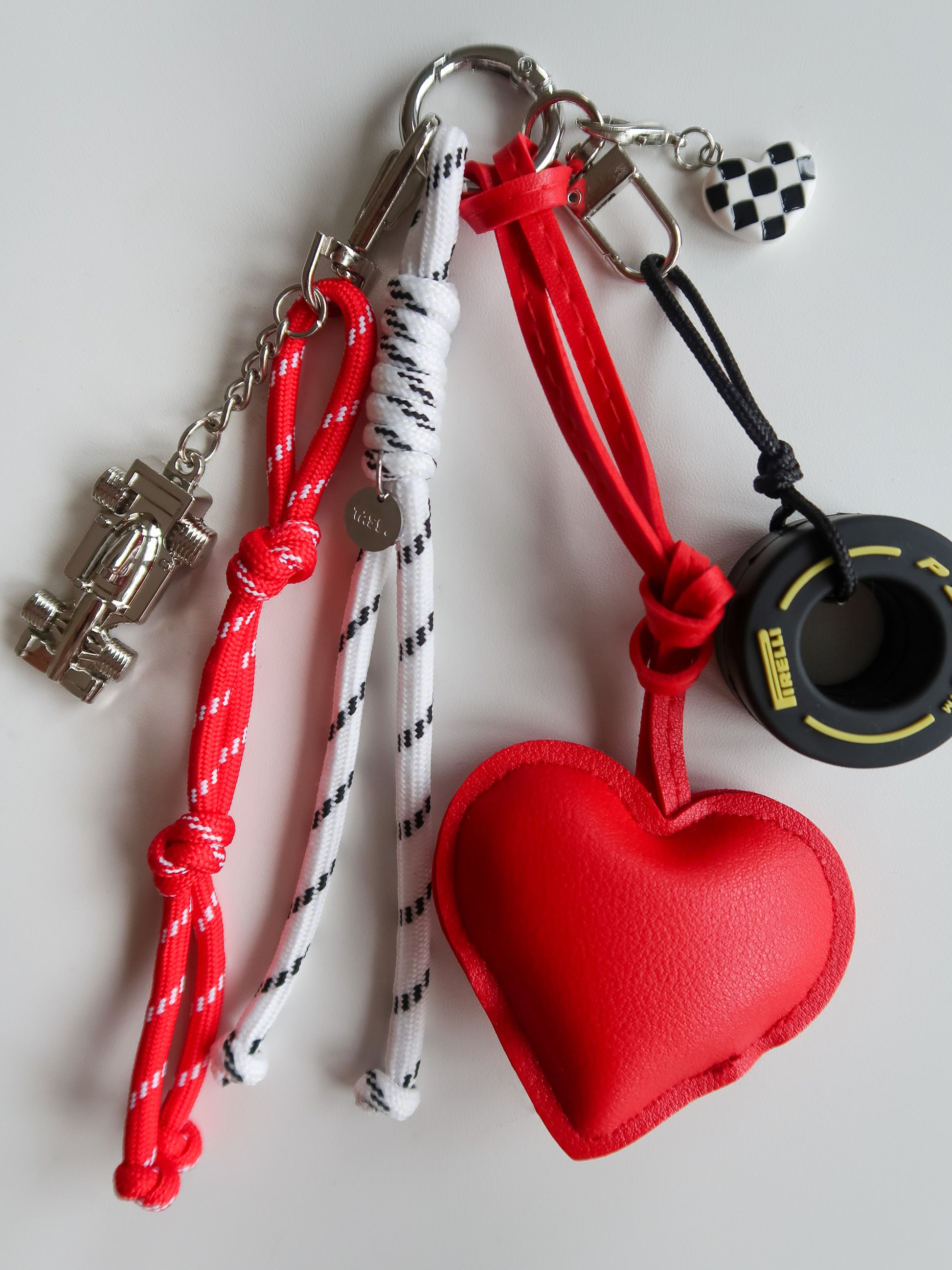 Silver-toned hardware, PU leather heart, miniature tyre & pocket-sized racecar.