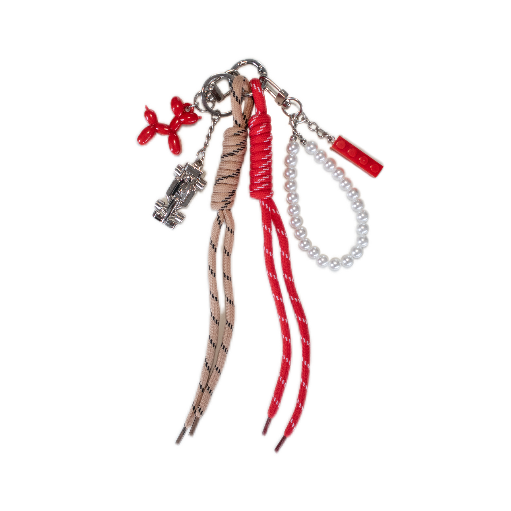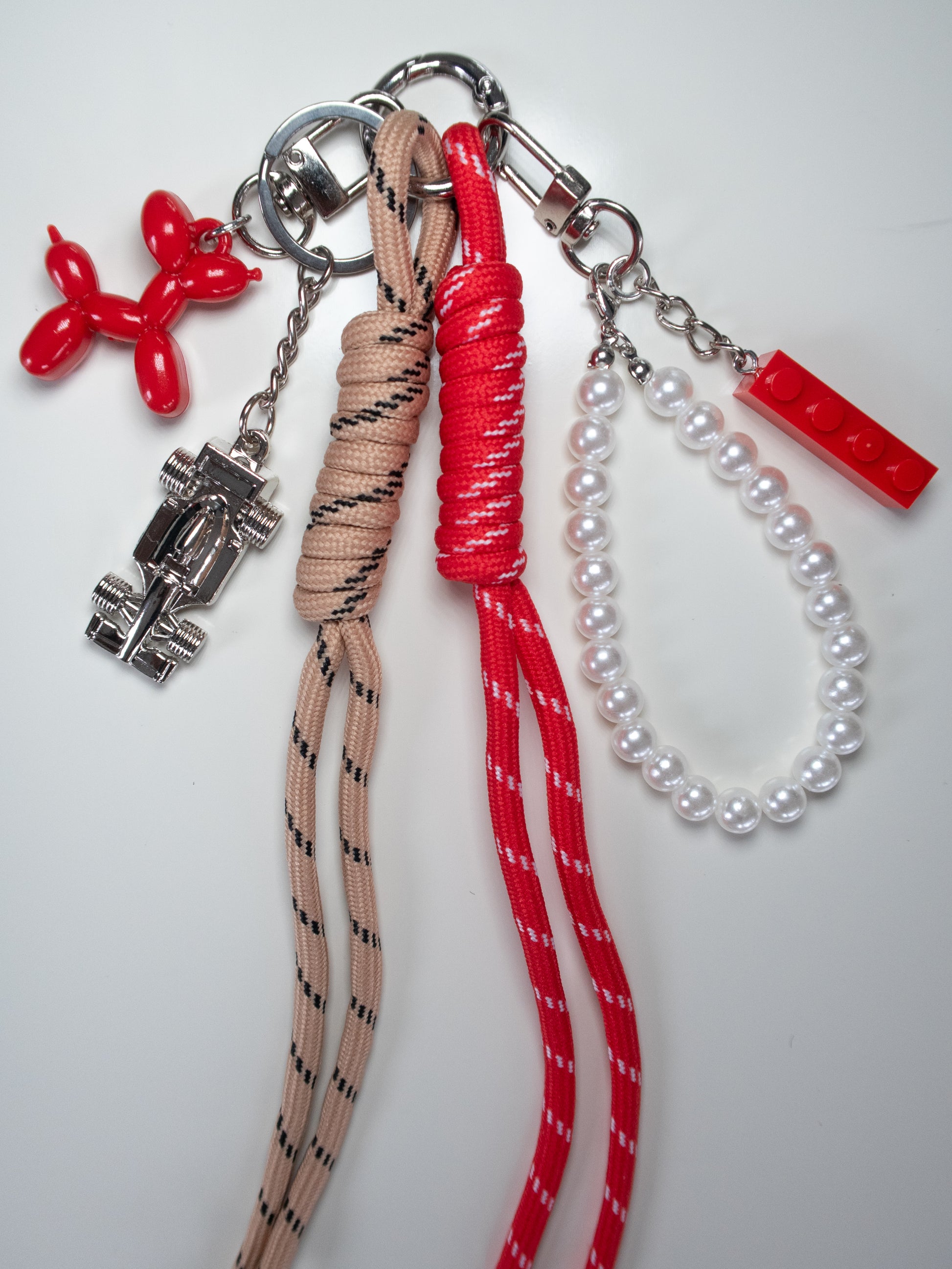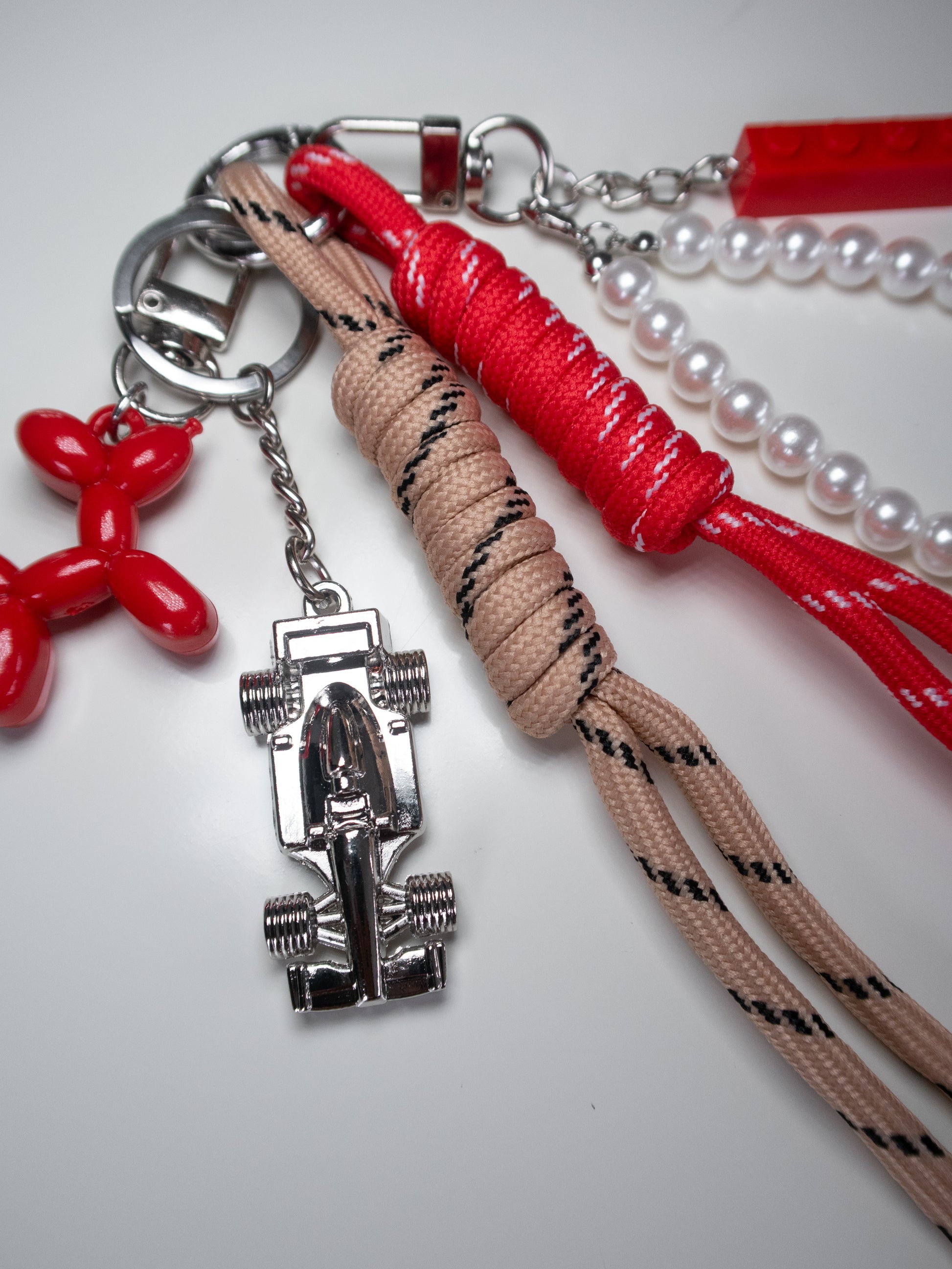 Hand-curated charm with nylon rope tassels, balloon dog, building block, pearl-effect beads and your very own pocket-sized race car.