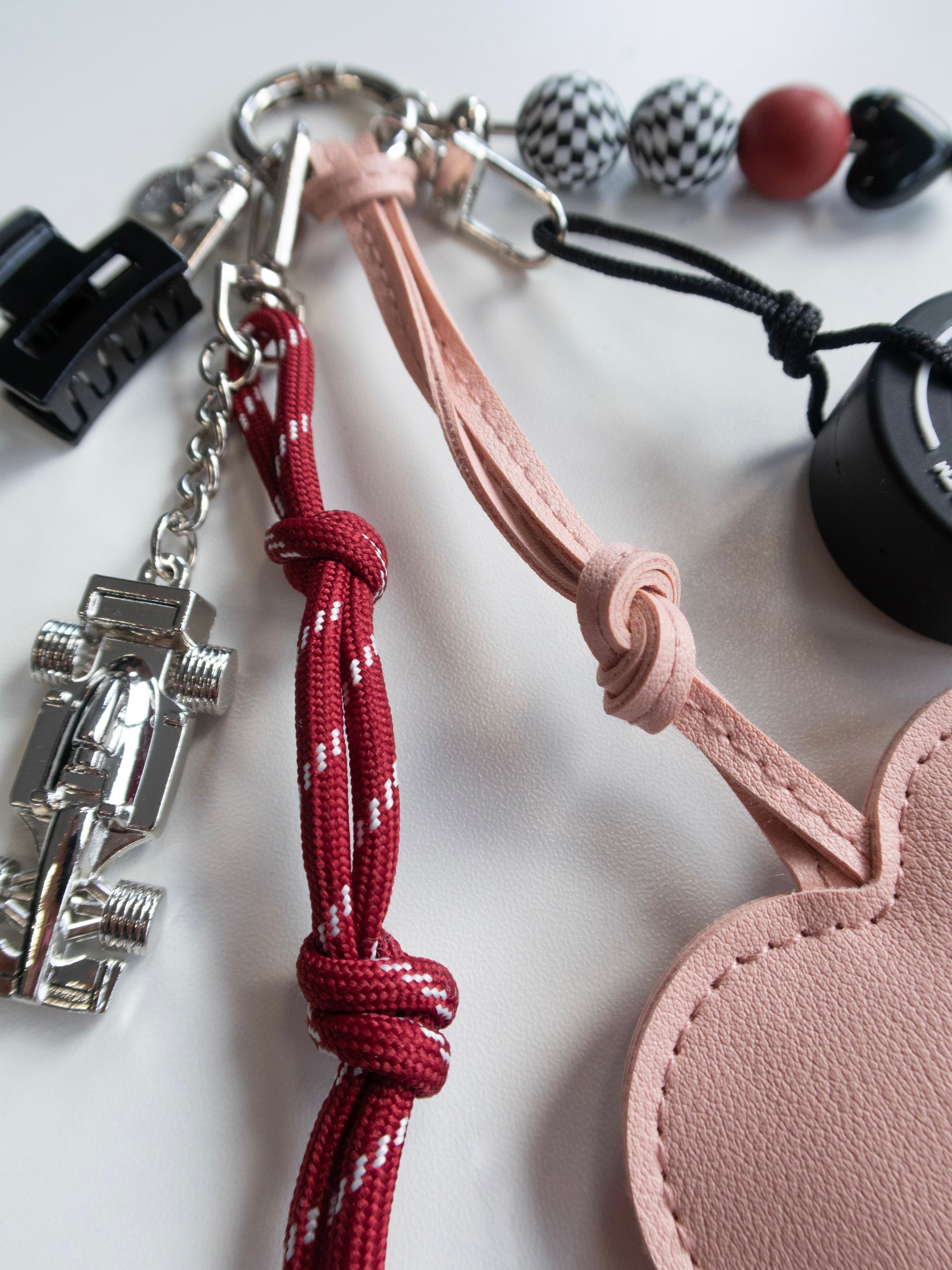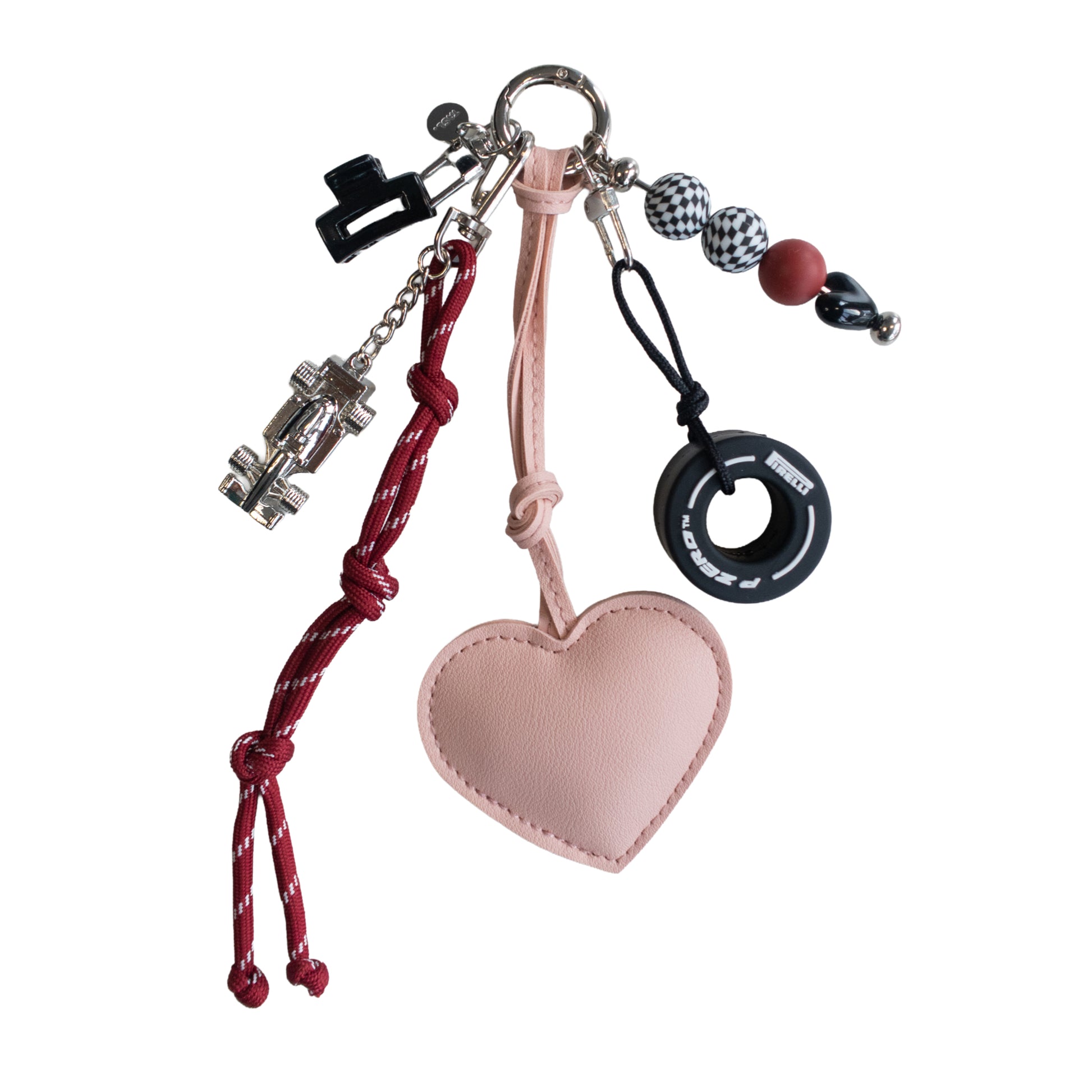 Silver-toned hardware, PU leather heart, miniature tyre, pocket-sized race car and checkered bead details.