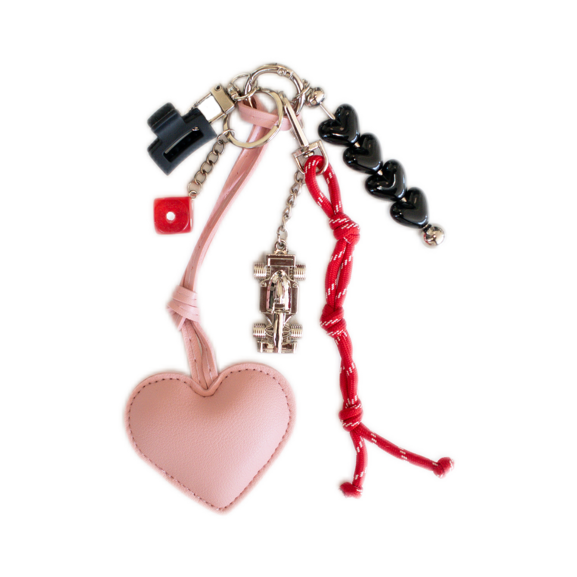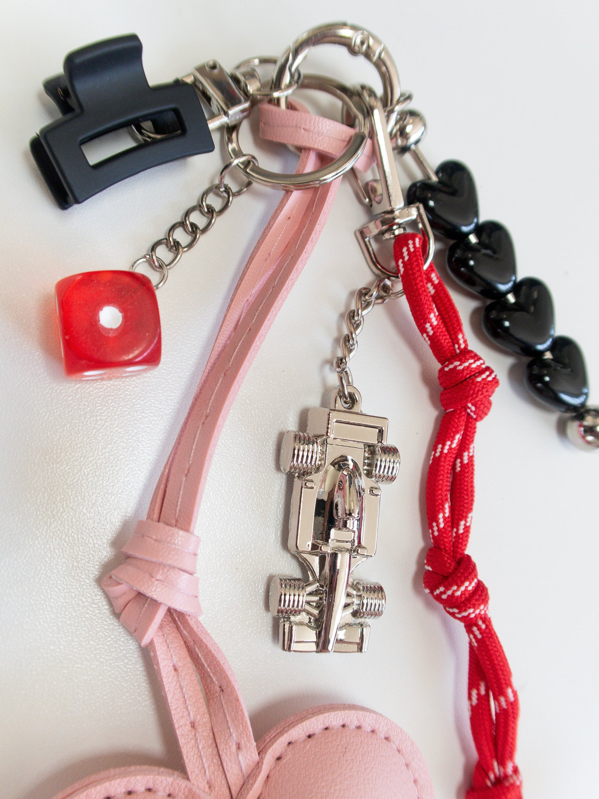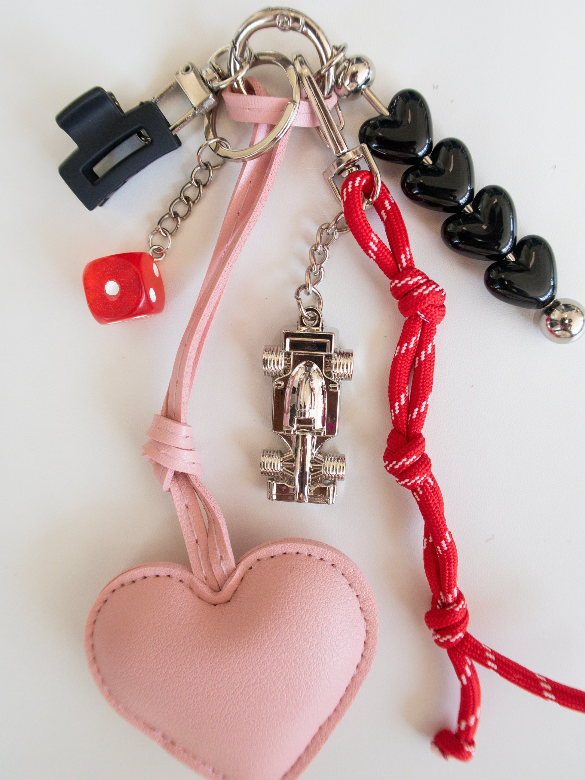 Hand-curated charm with PU leather heart, heart-shaped beads, miniature claw clip and your very own pocket-sized race car.