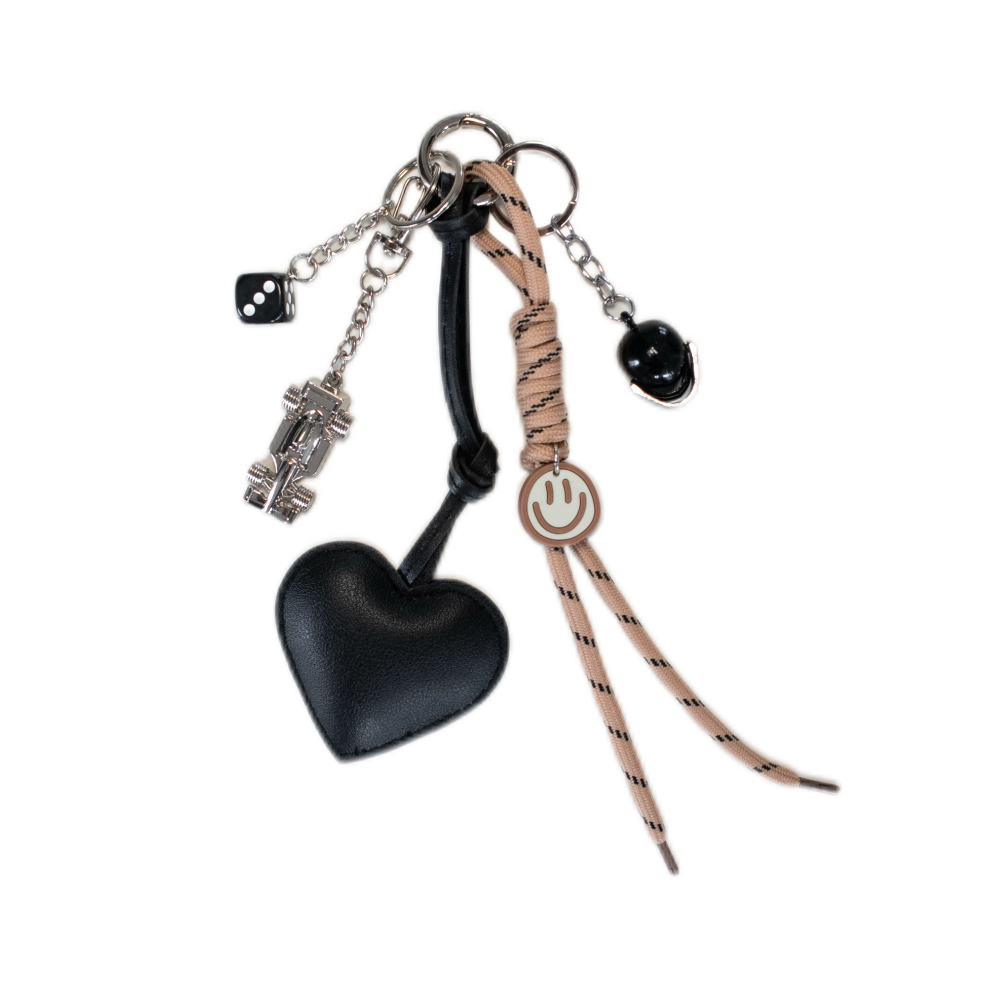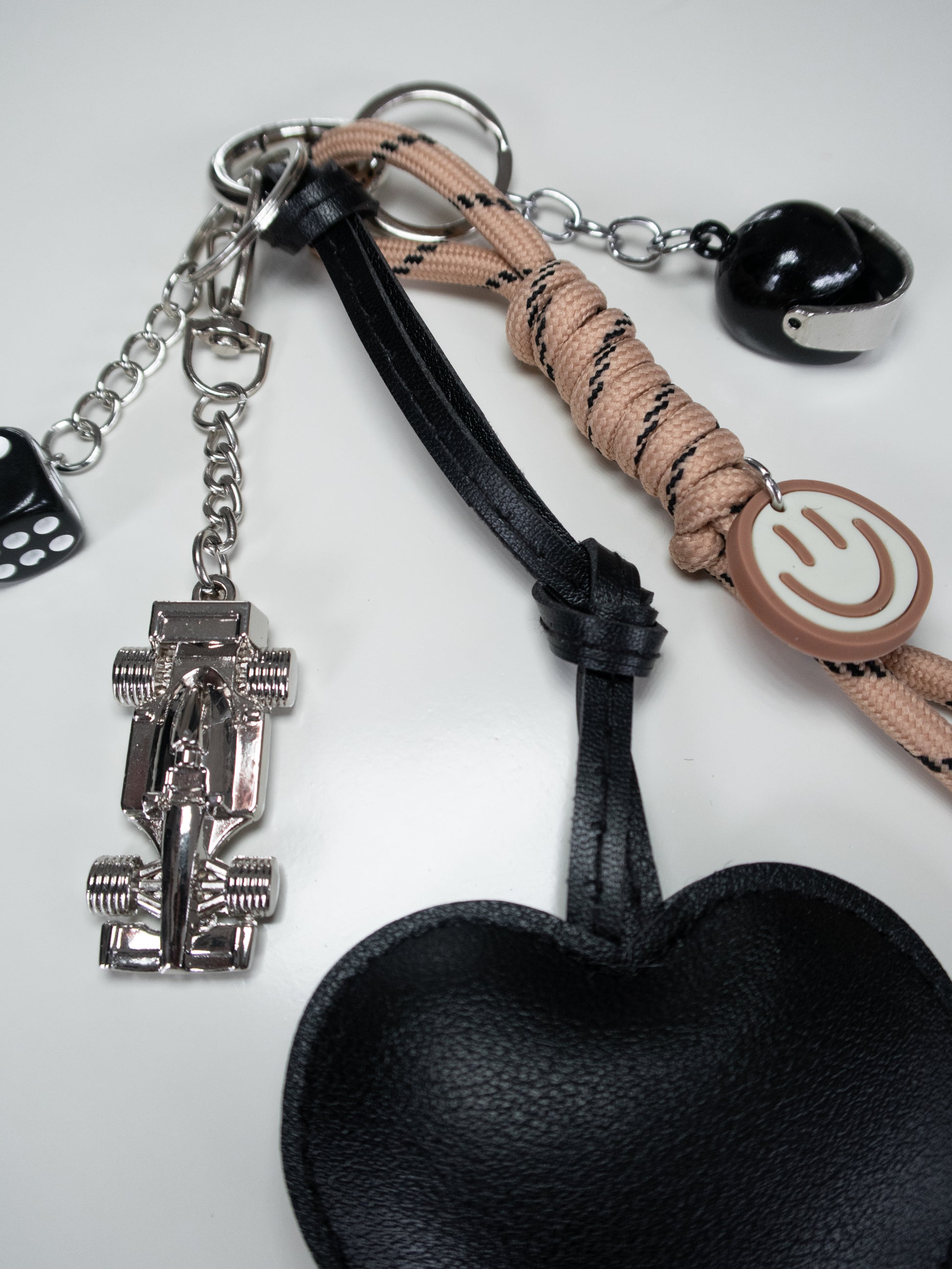 Hand-curated charm with PU leather heart, miniature helmet, dice and your very own pocket-sized race car.