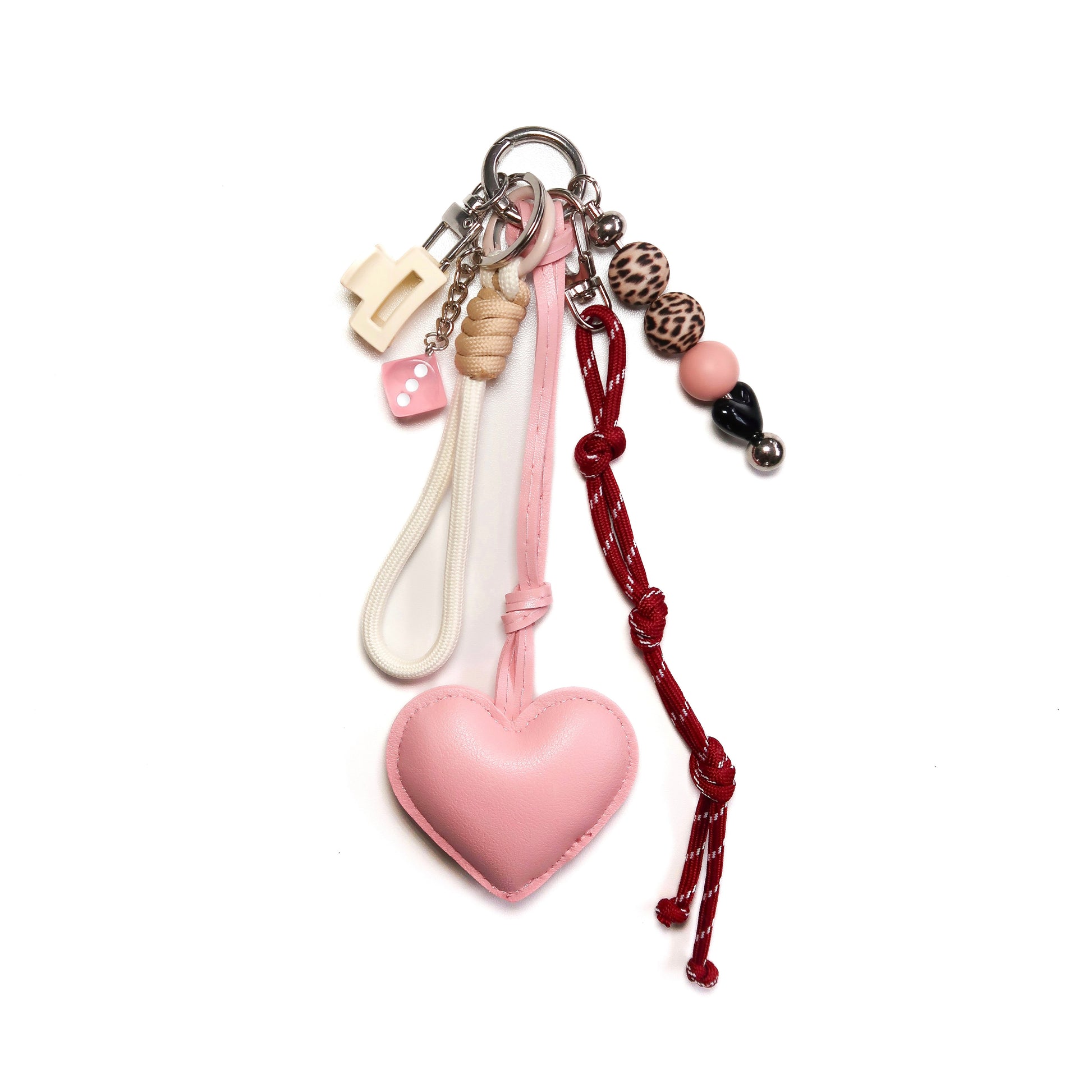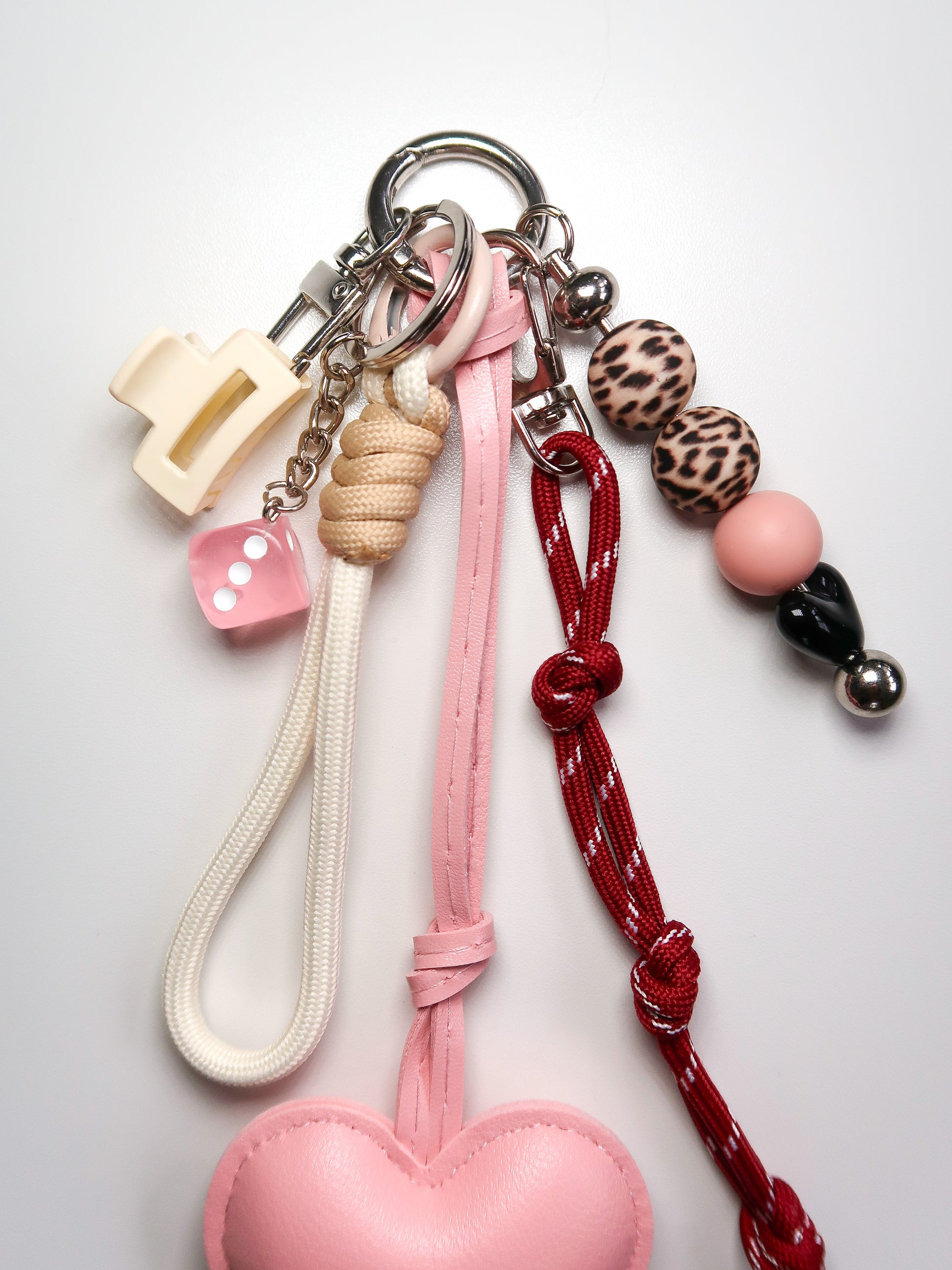 Hand-curated charm with PU leather heart and leopard beads, complete with miniature claw clip.