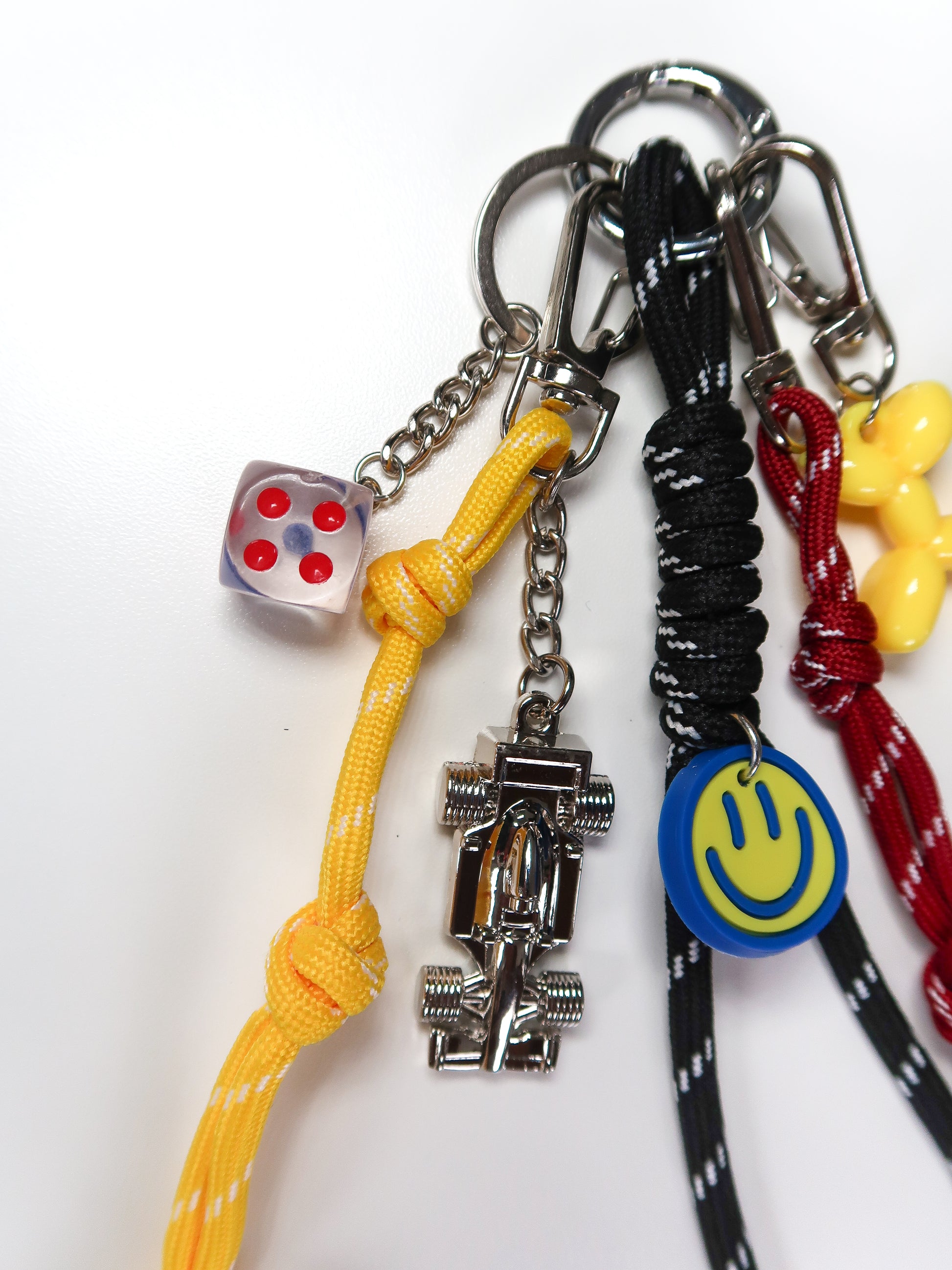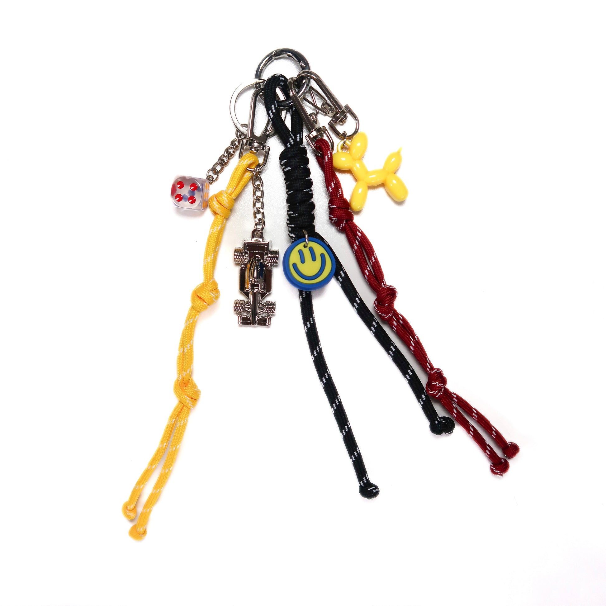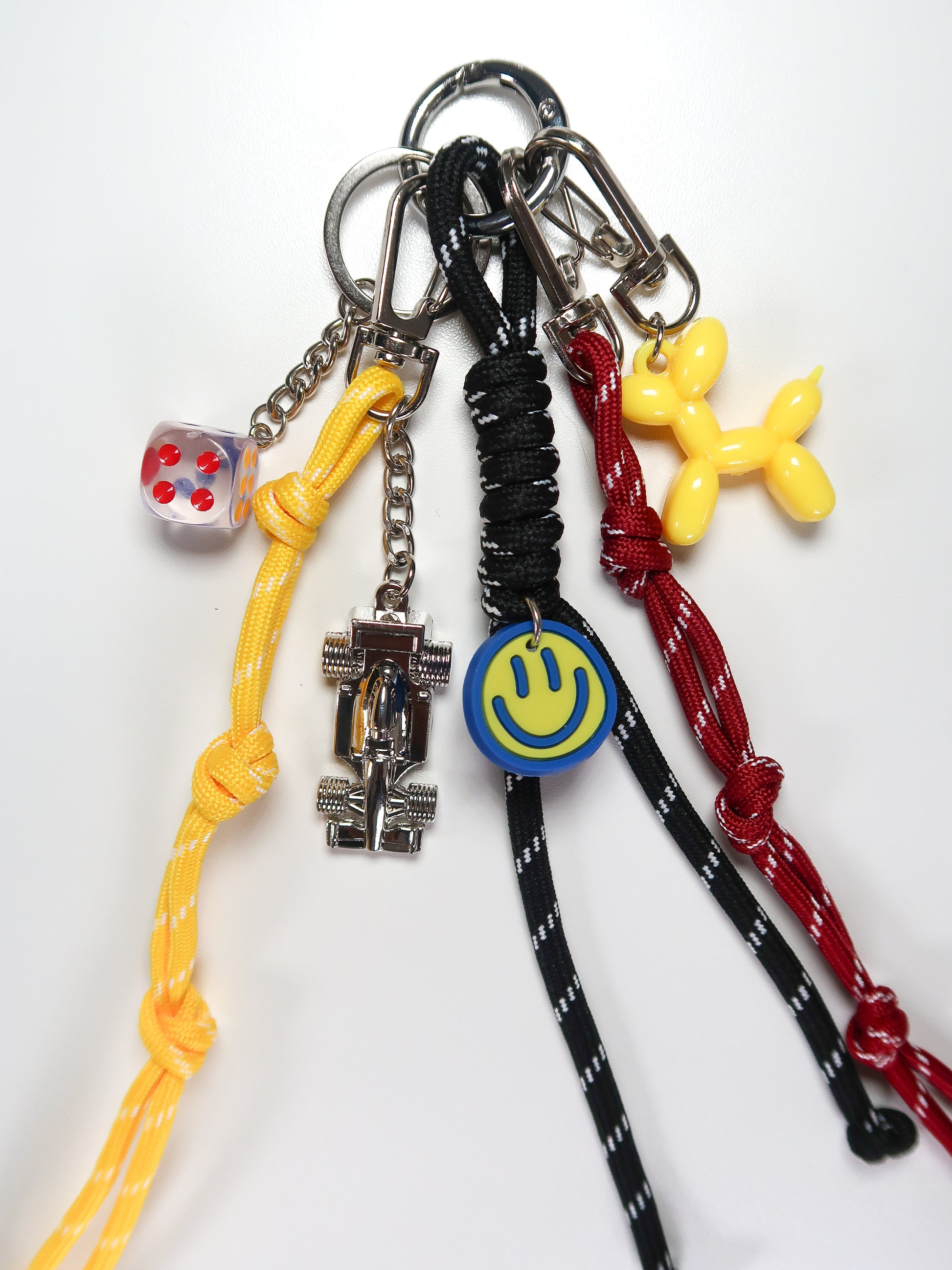 Hand-curated charm with balloon dog, nylon rope tassels and your very own pocket-sized race car.