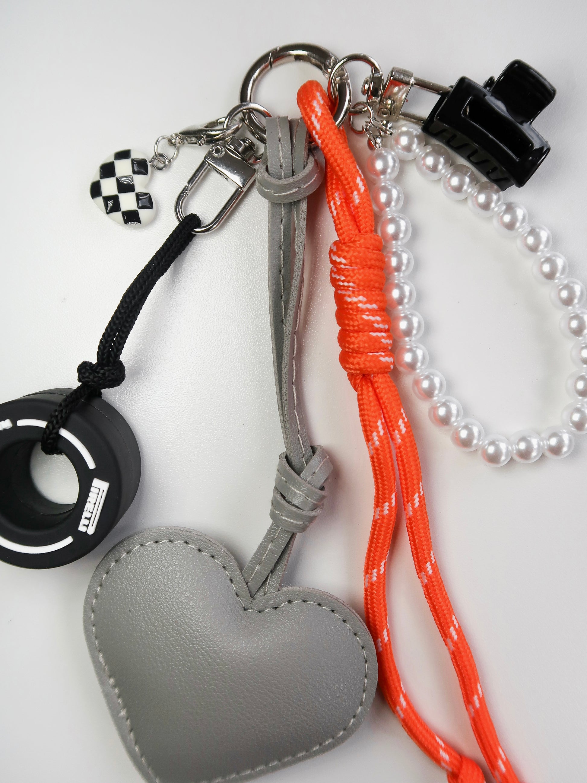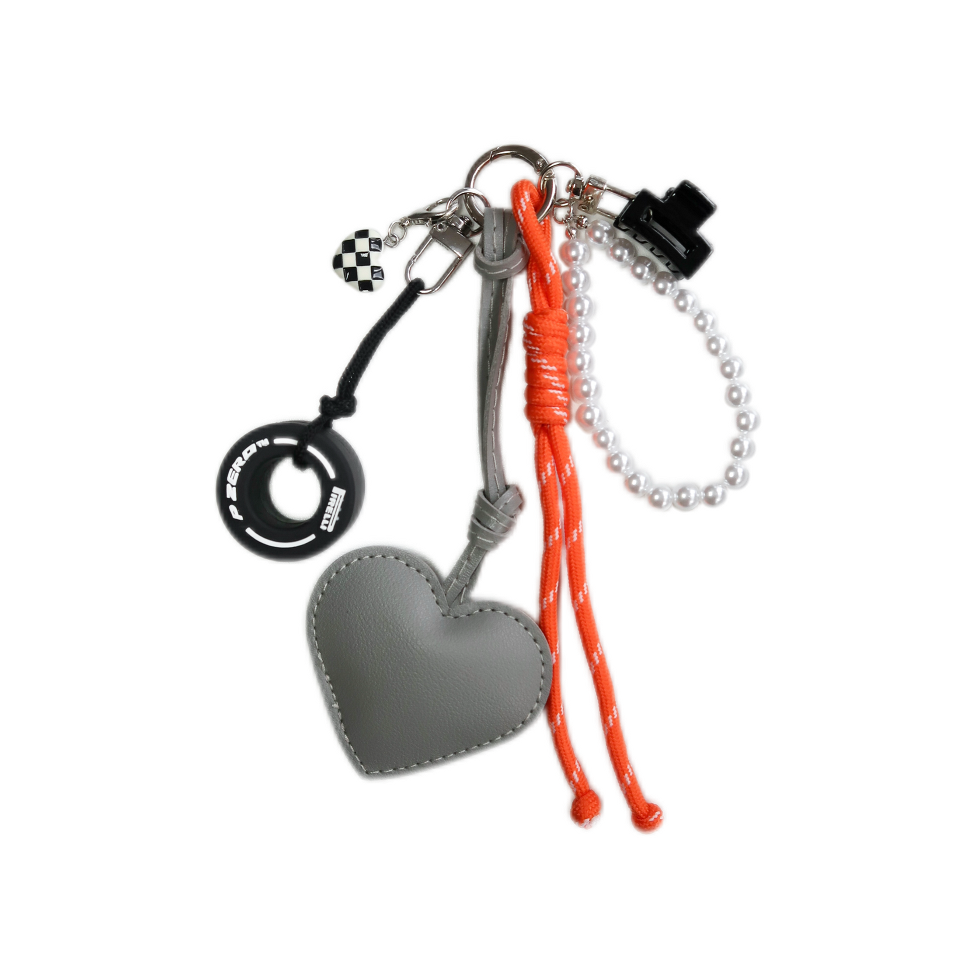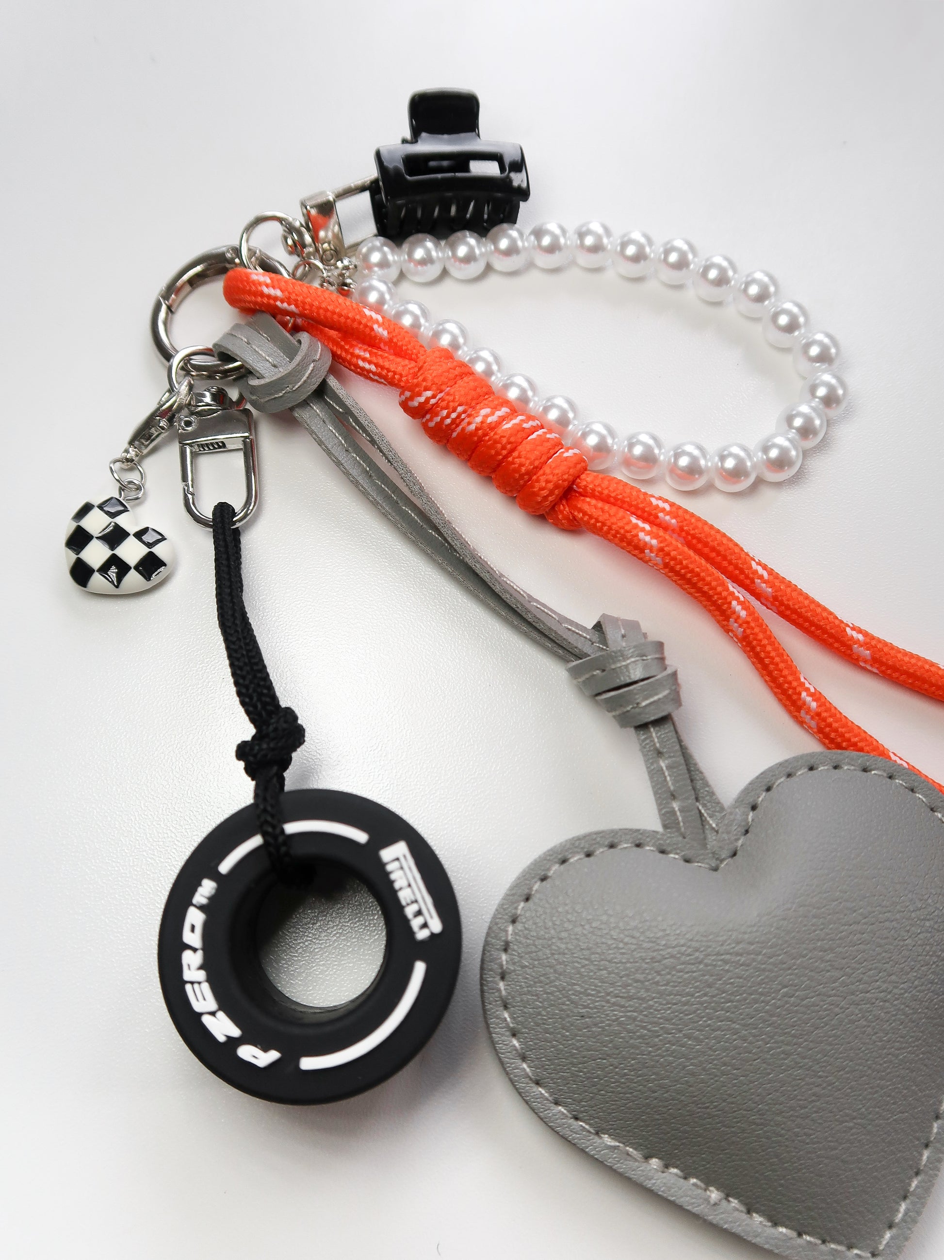 Hand-curated charm with PU leather heart, pearl-effect beads, checkered heart and a miniature tyre for maximum grip.