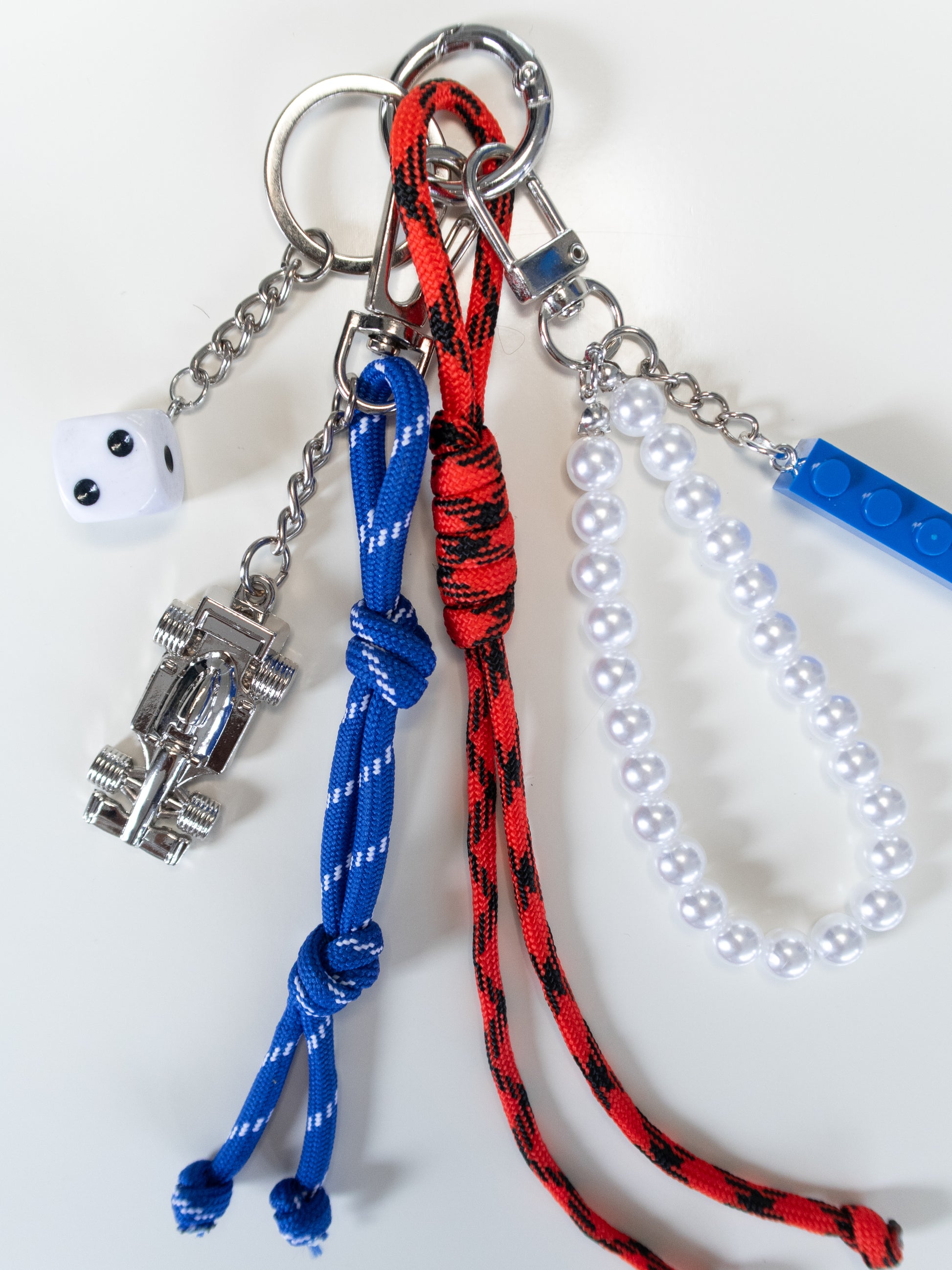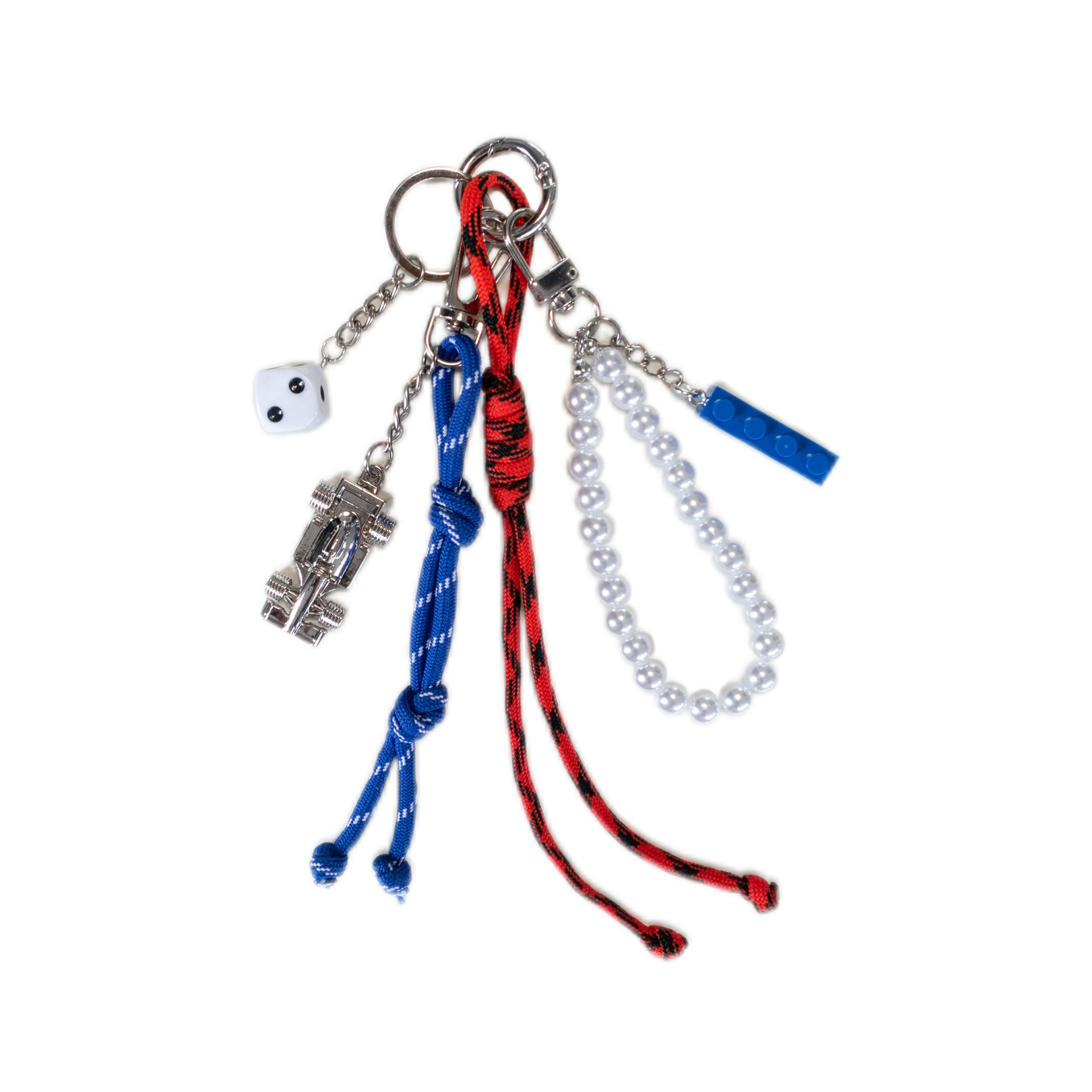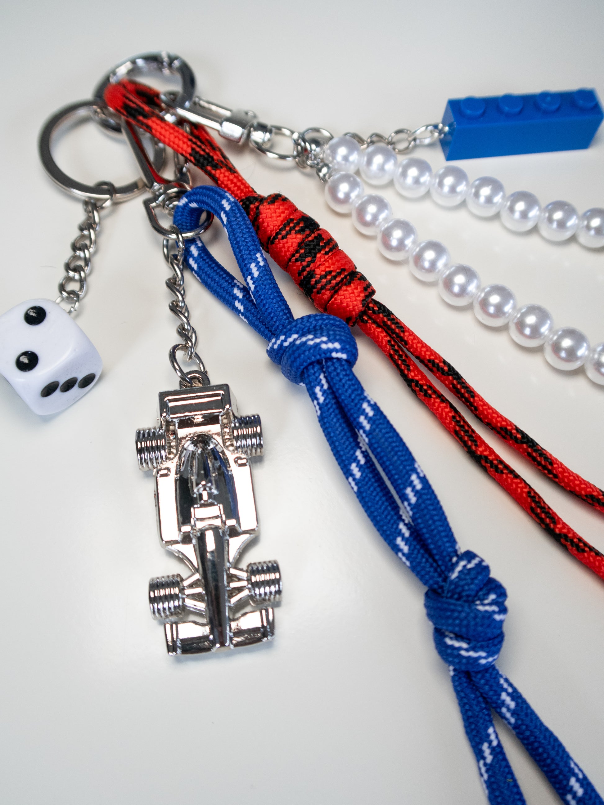 Hand-curated charm with nylon rope tassels, pearl-effect beads, building block and your very own pocket-sized race car.