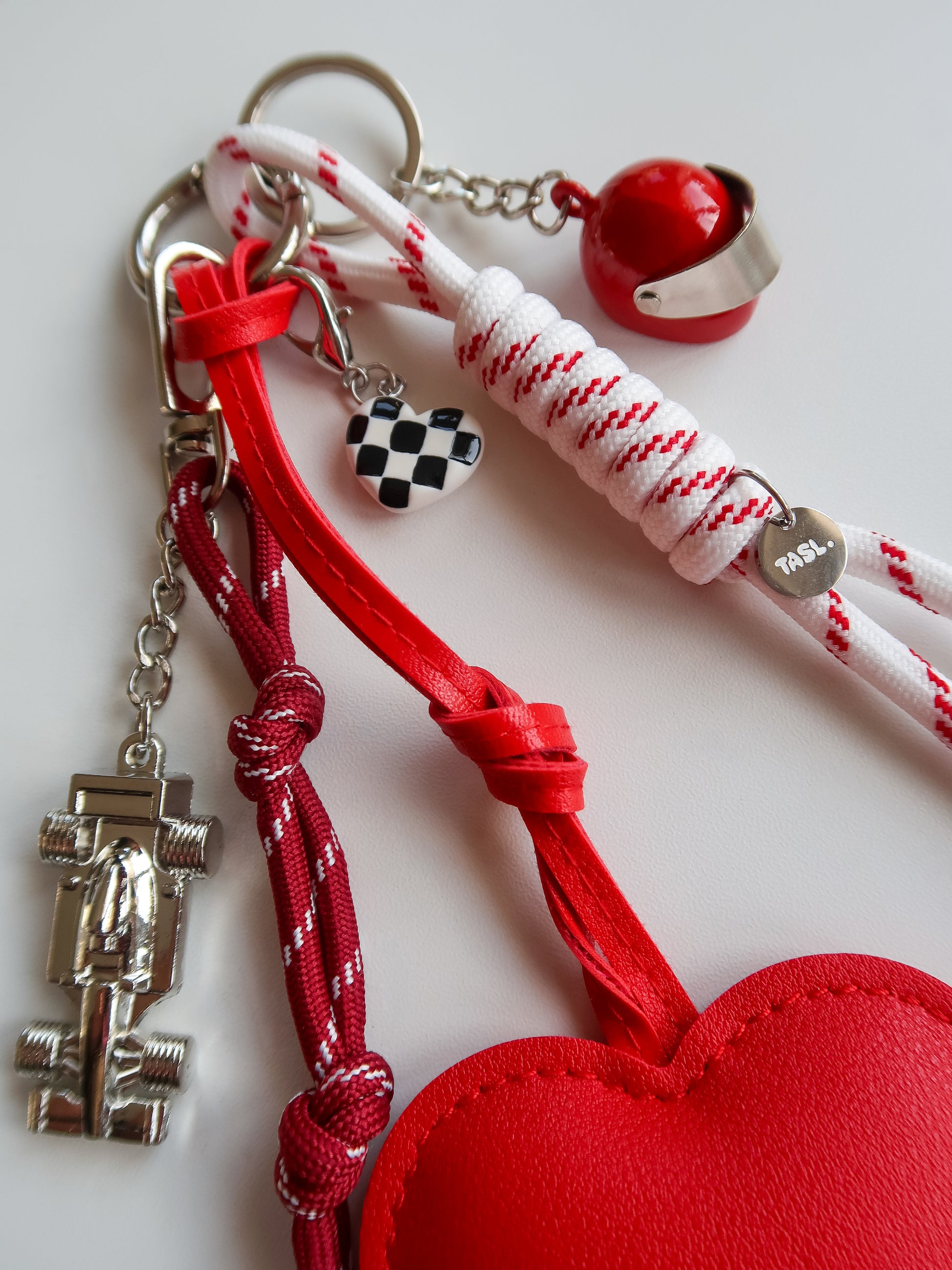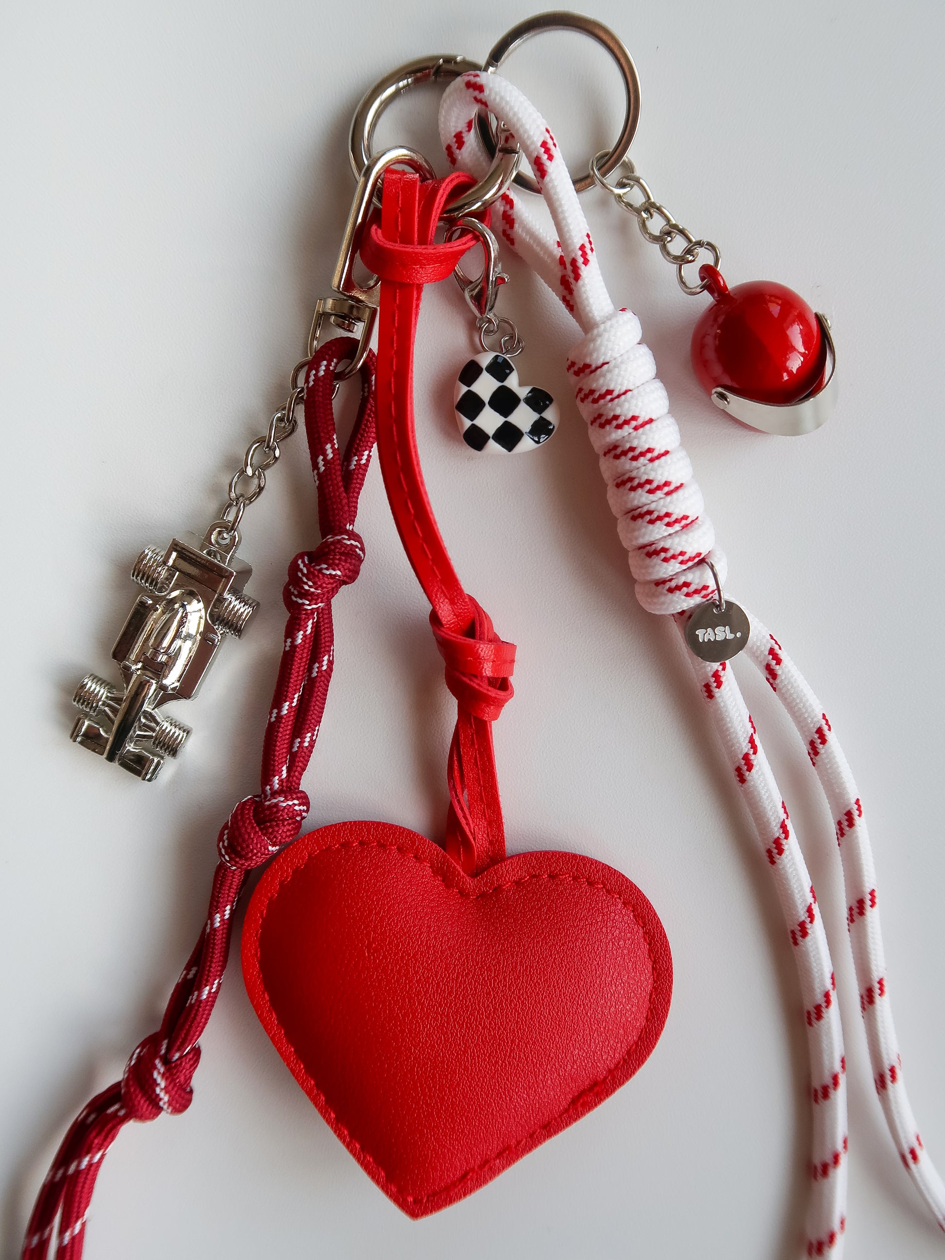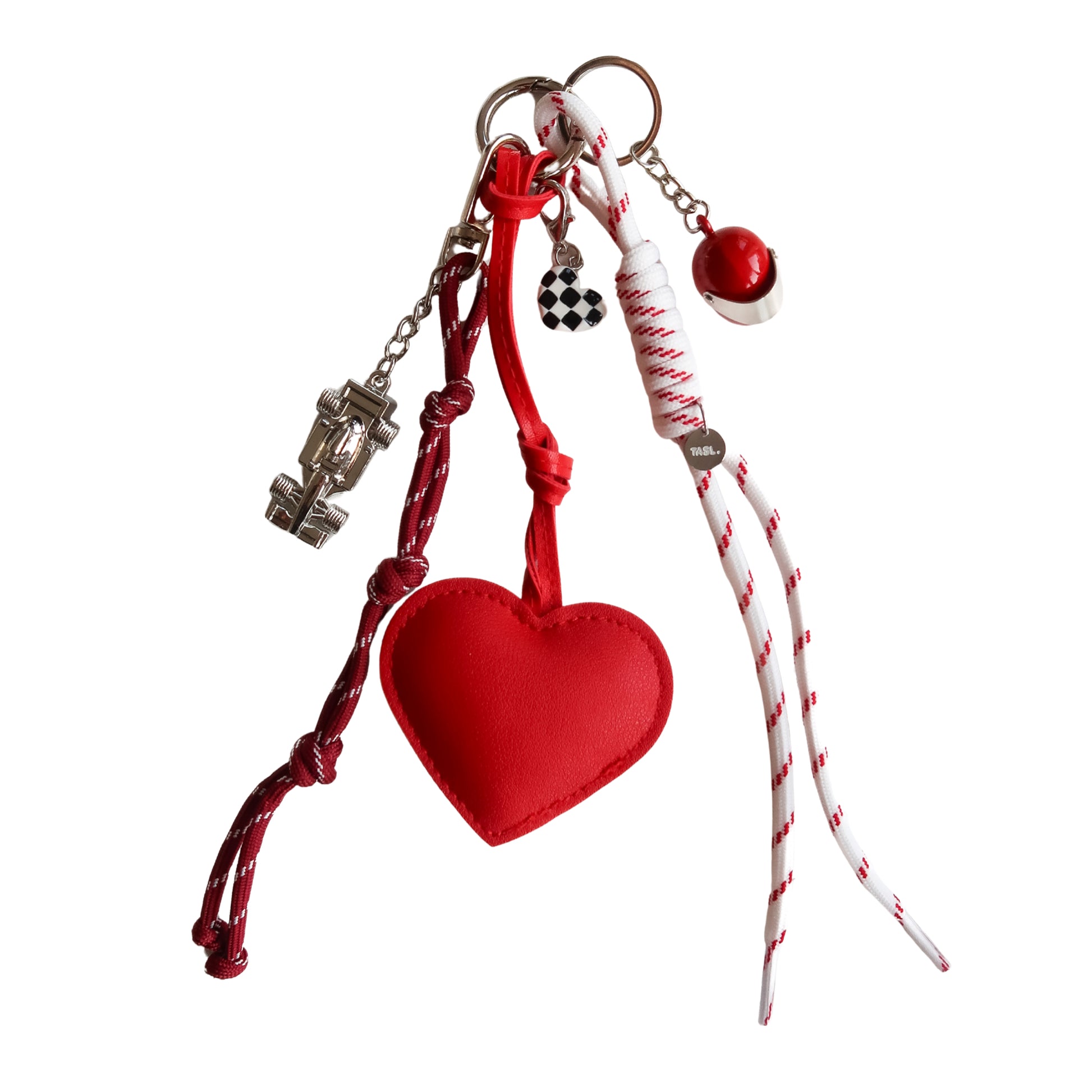 Silver-toned hardware, PU leather heart, miniature helmet & pocket-sized racecar.