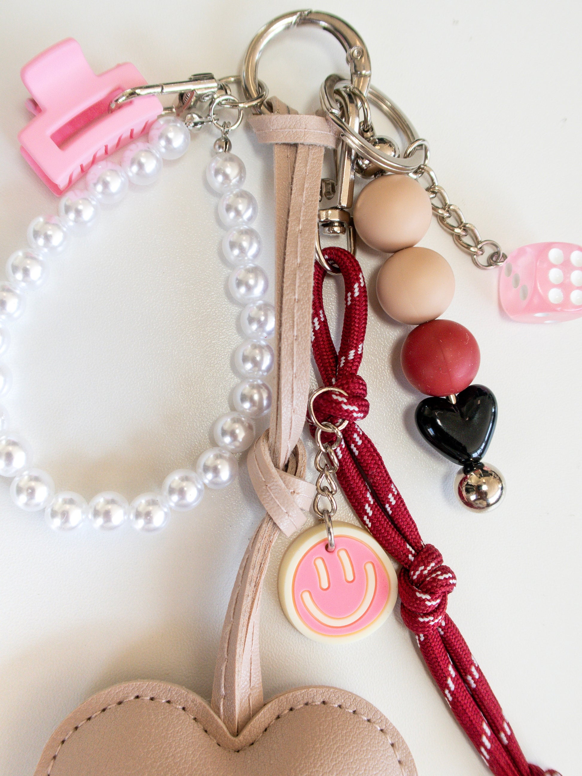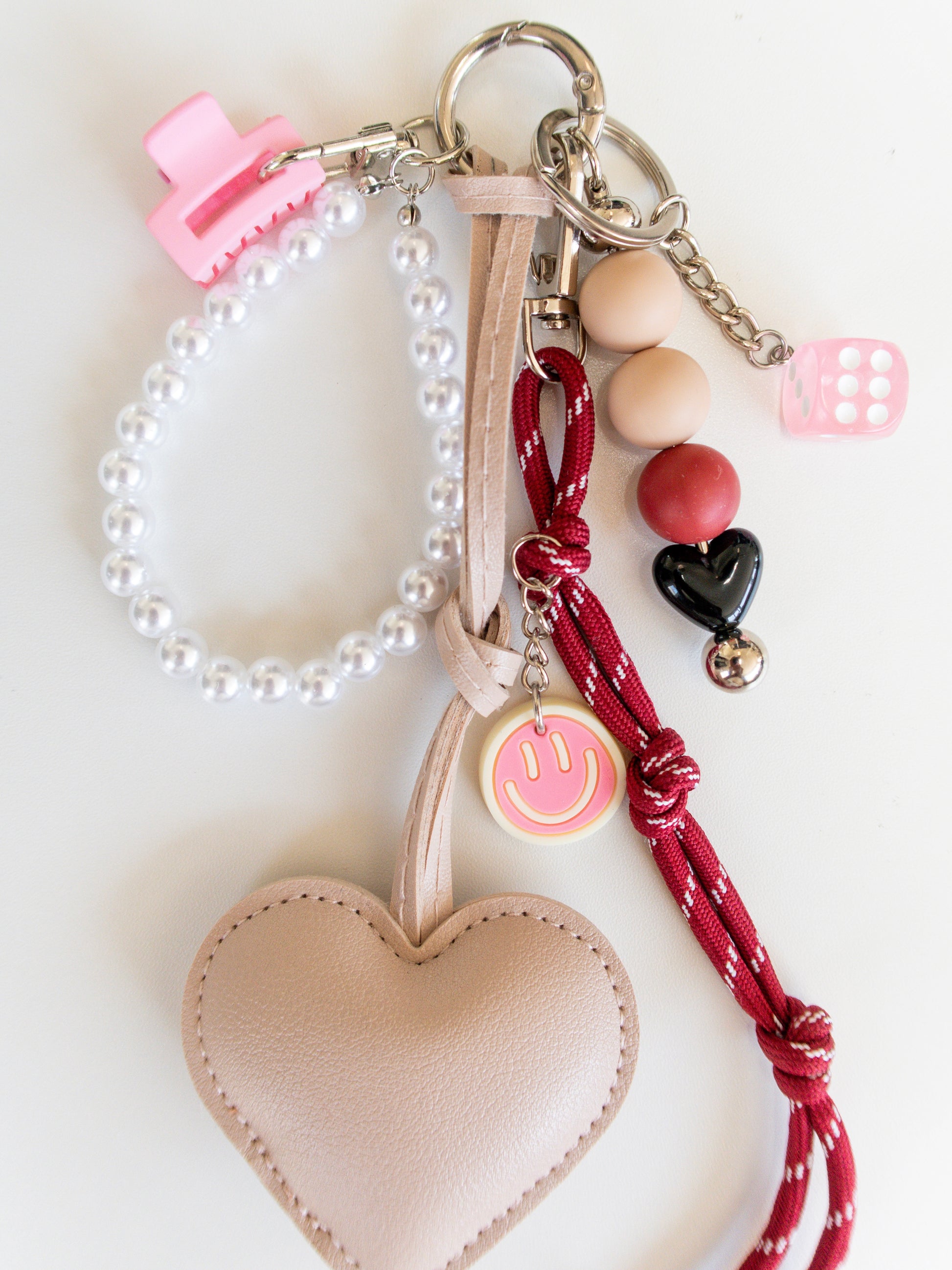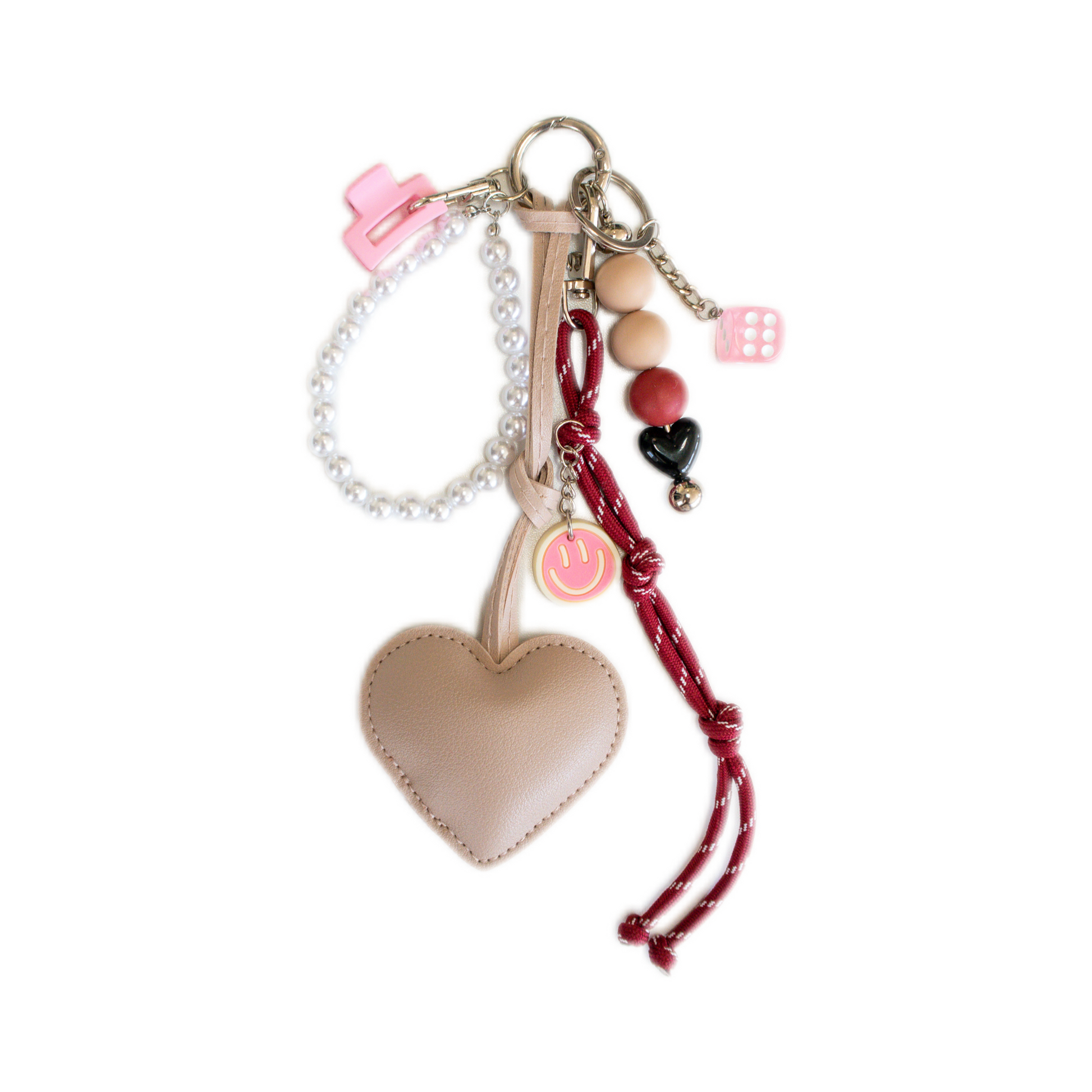 Hand-curated charm with PU leather heart, pearl-effect beads, silicone beads and miniature claw clip.