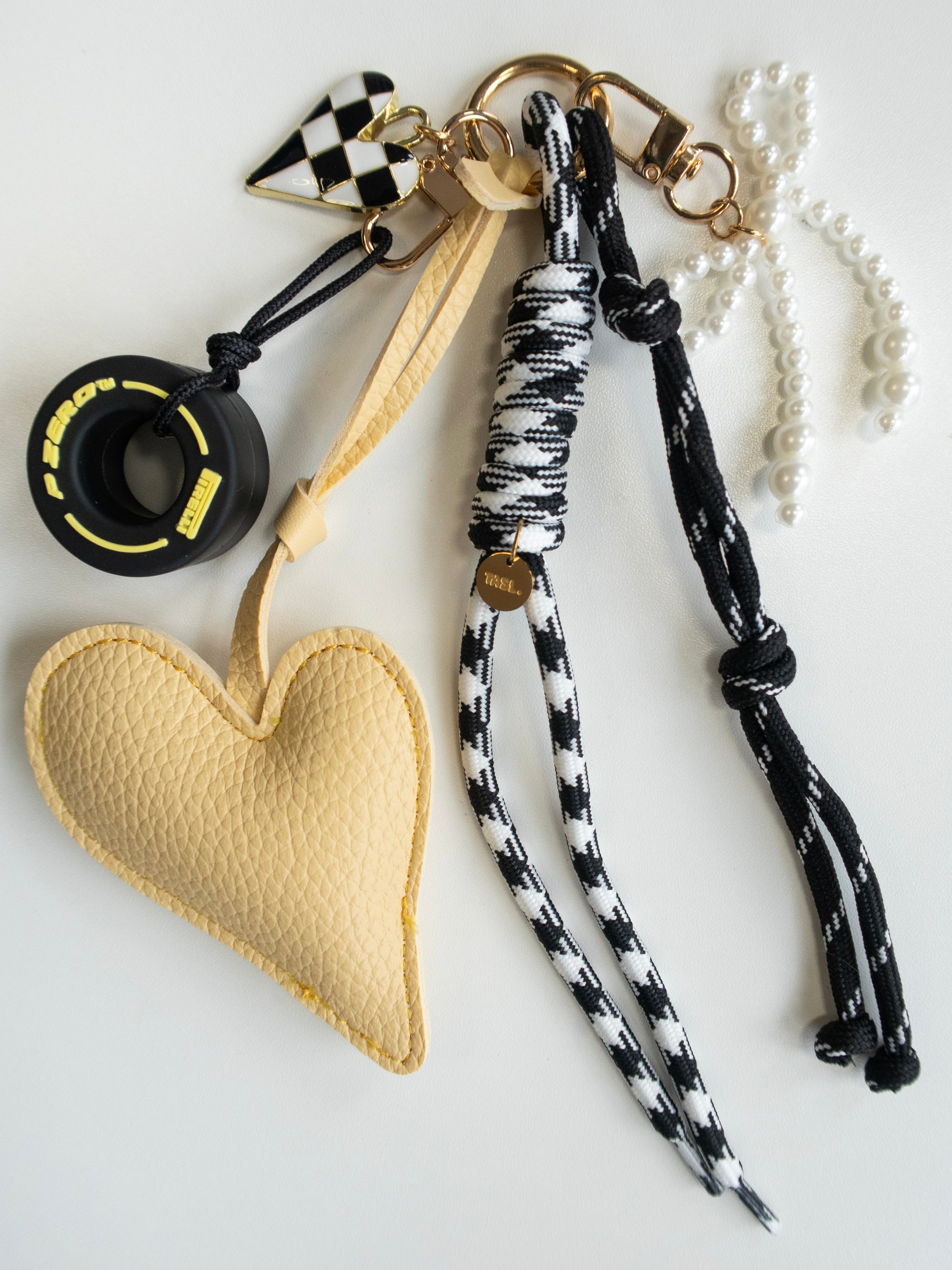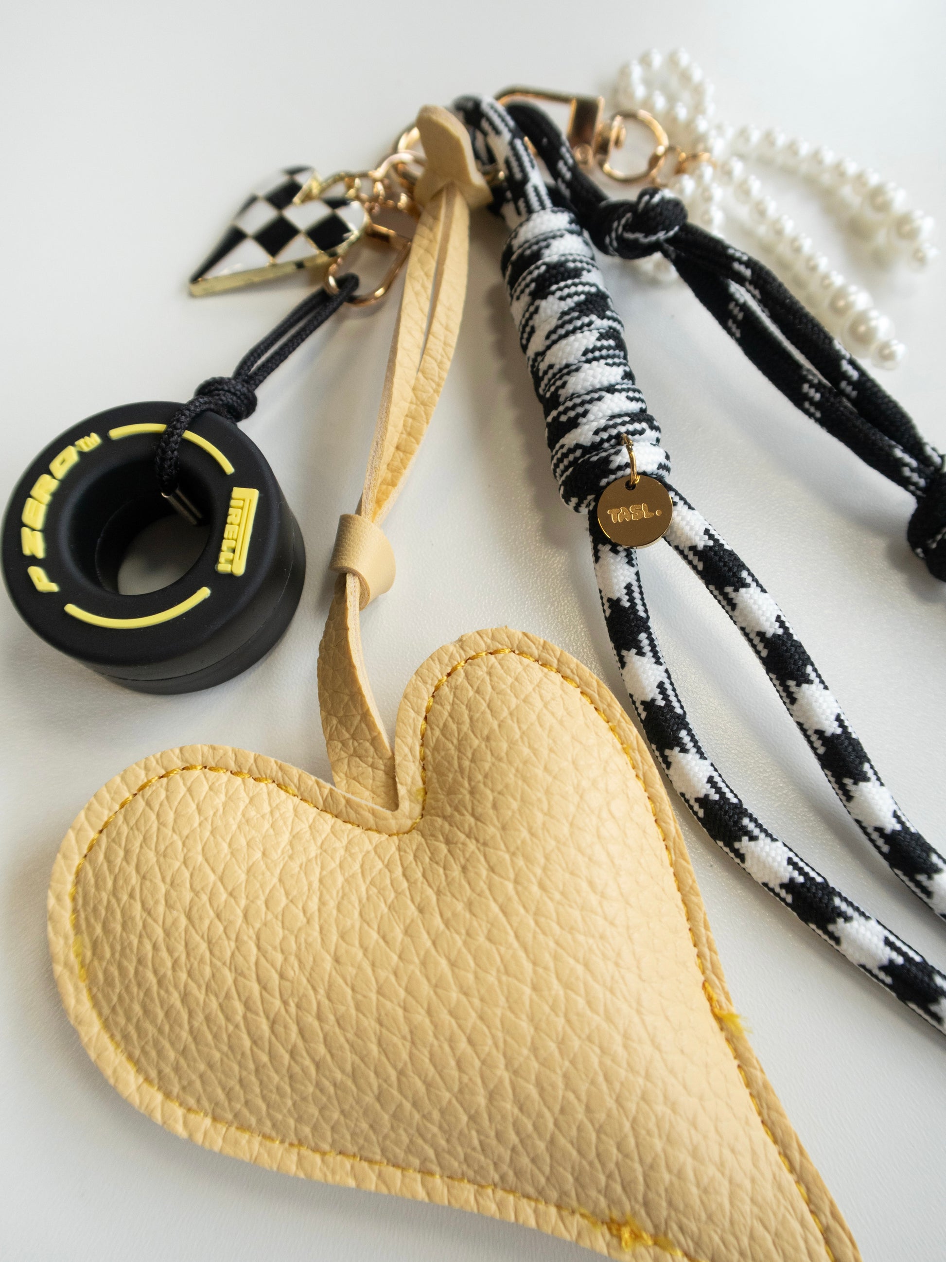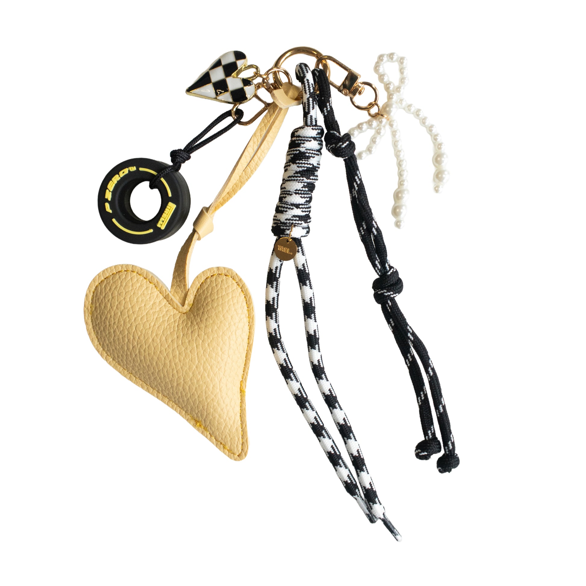 Gold-toned hardware, PU leather heart, miniature tyre and pearl-effect detail.