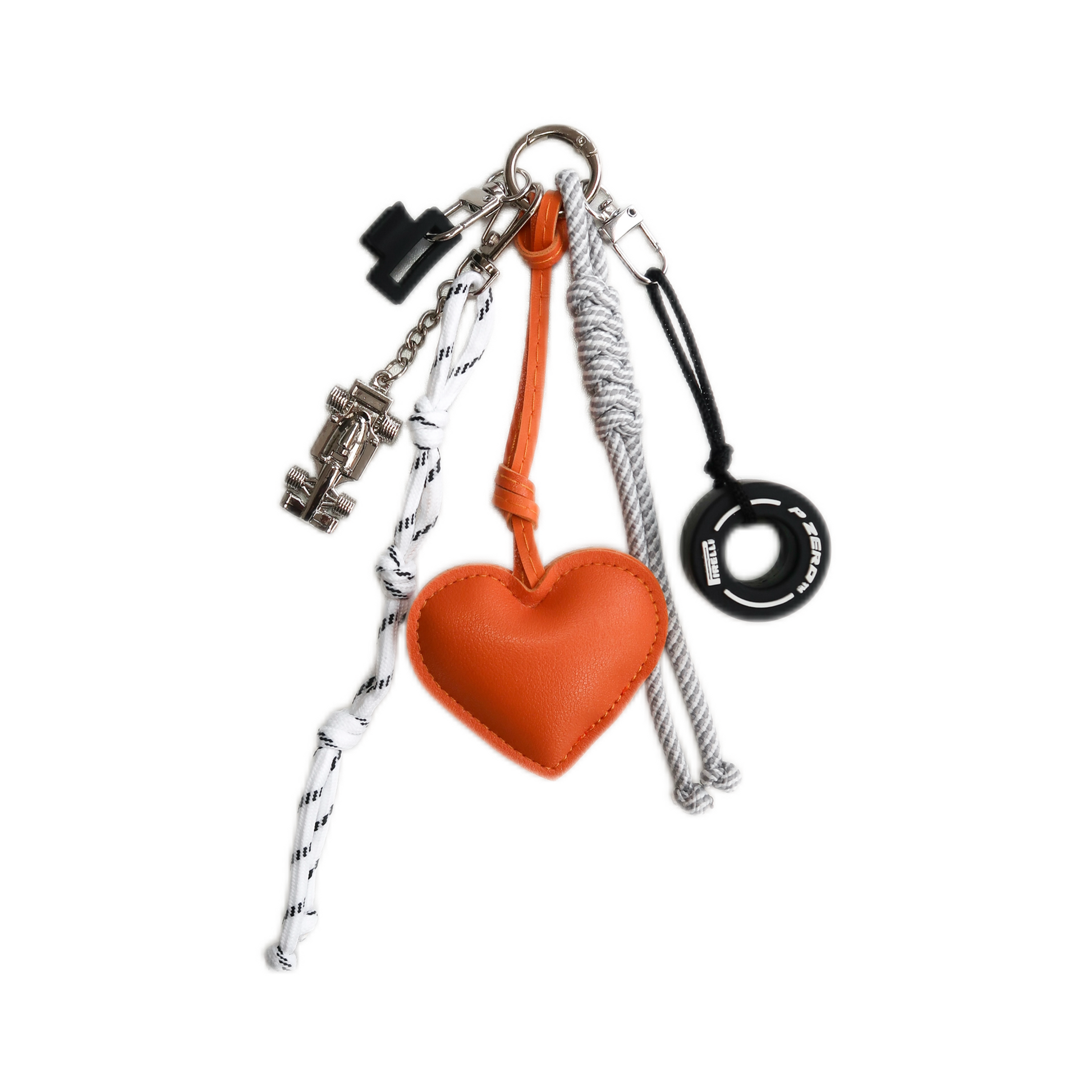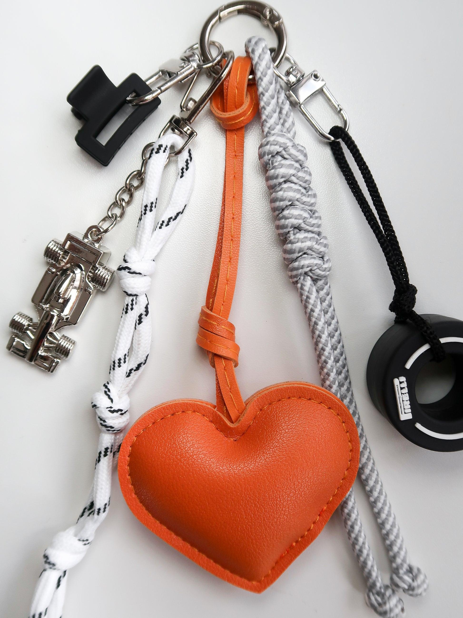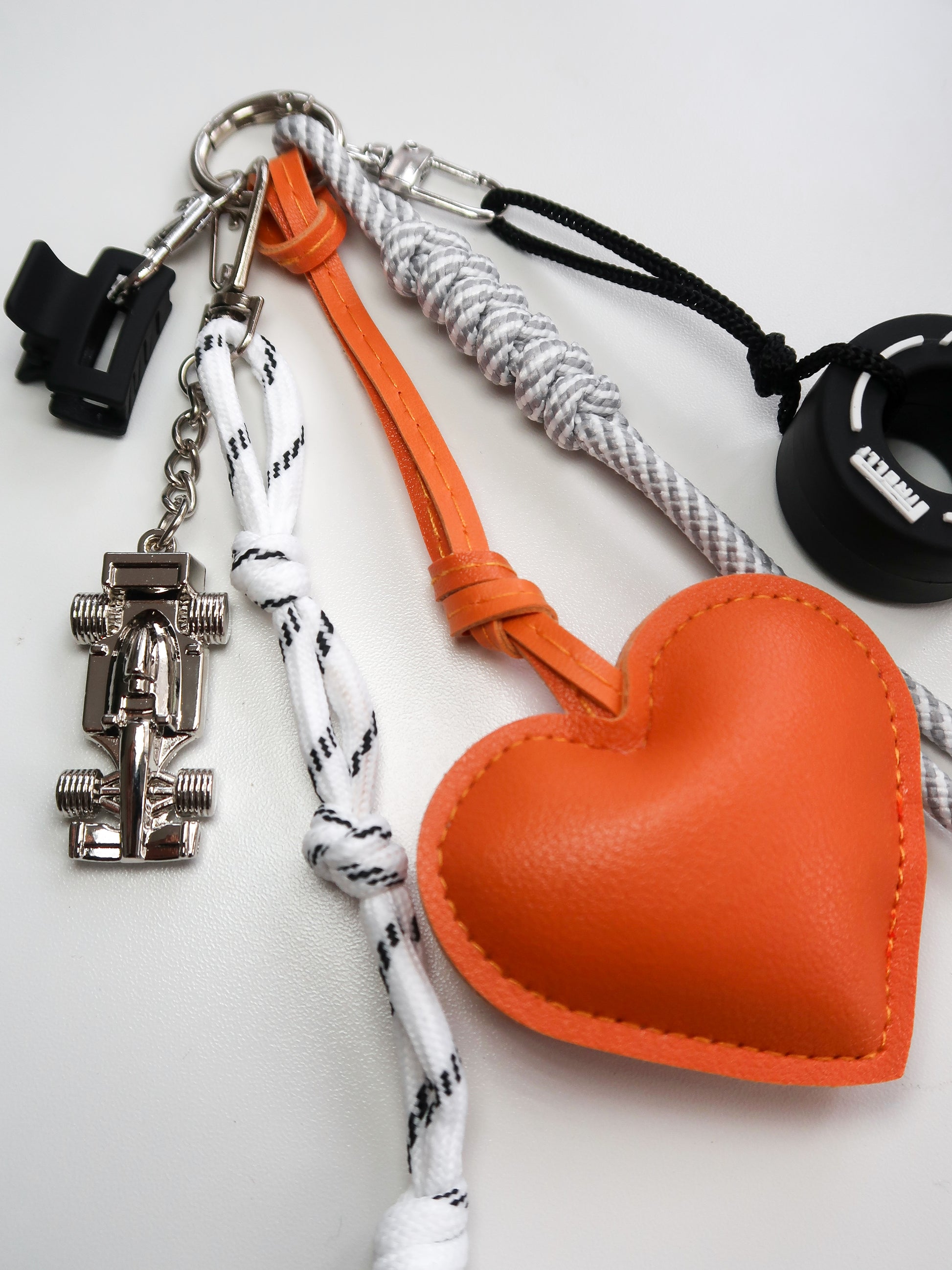 Hand-curated charm with PU leather heart, nylon rope tassels, miniature tyre and your very own pocket-sized racecar.