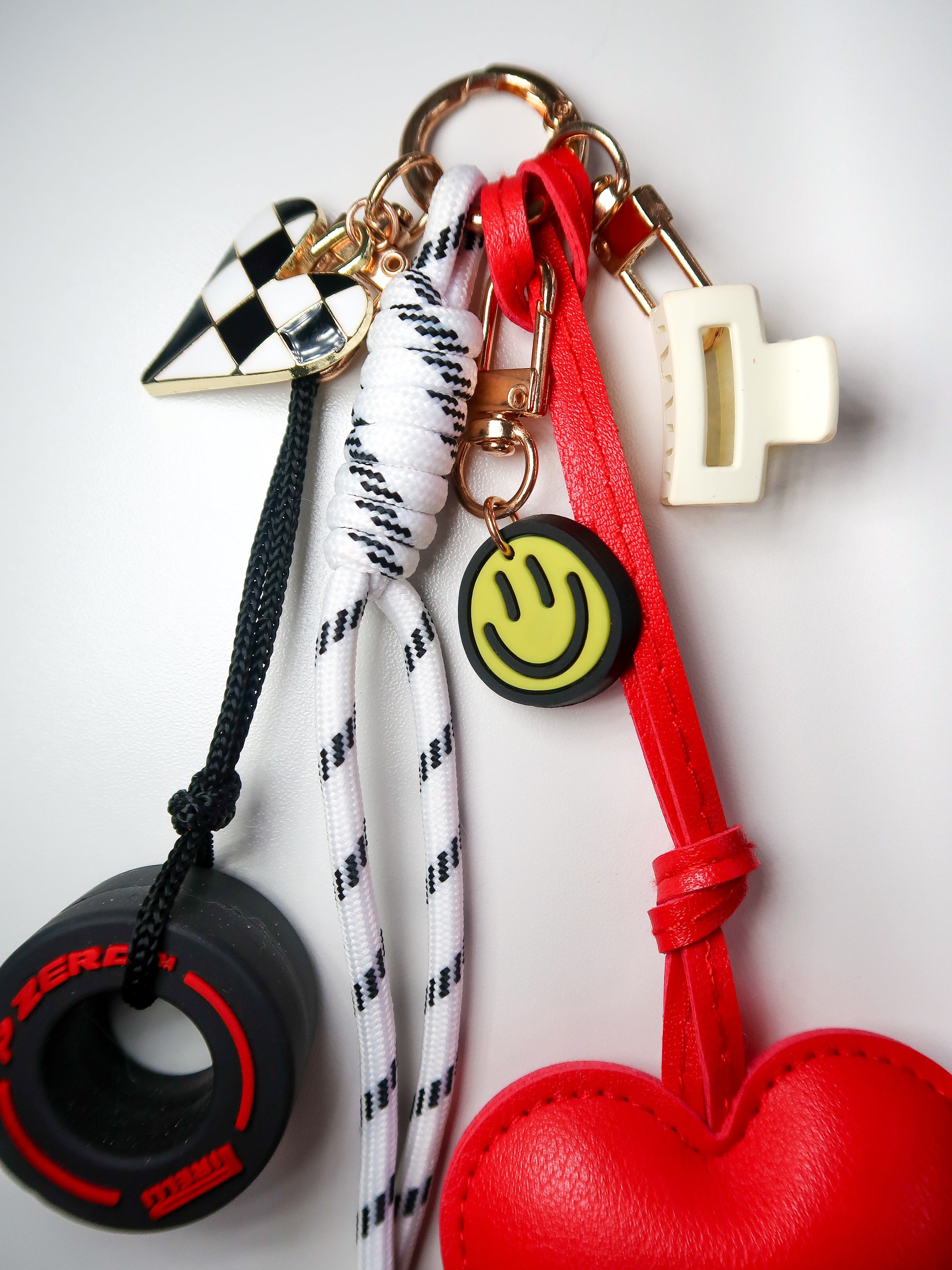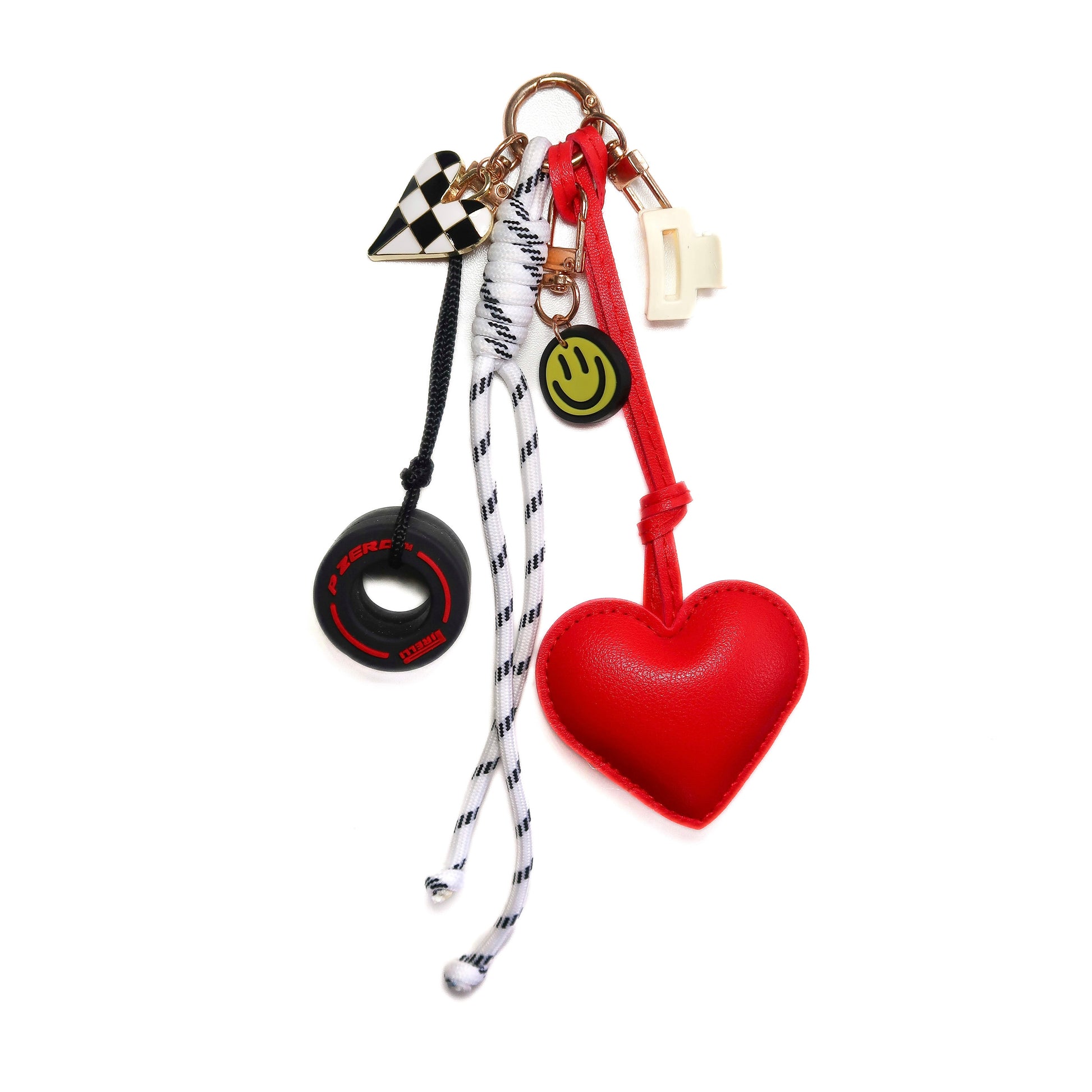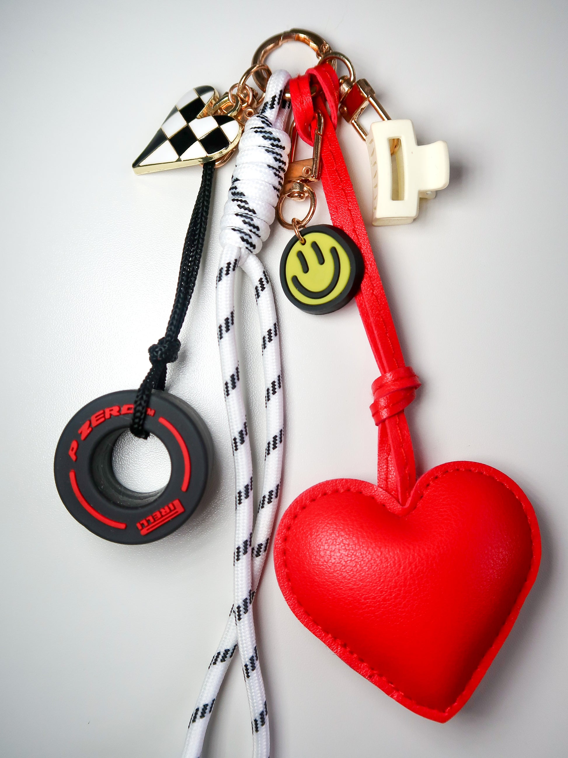 Hand-curated charm with chequered heart, PU leather heart and your very own miniature tyre.