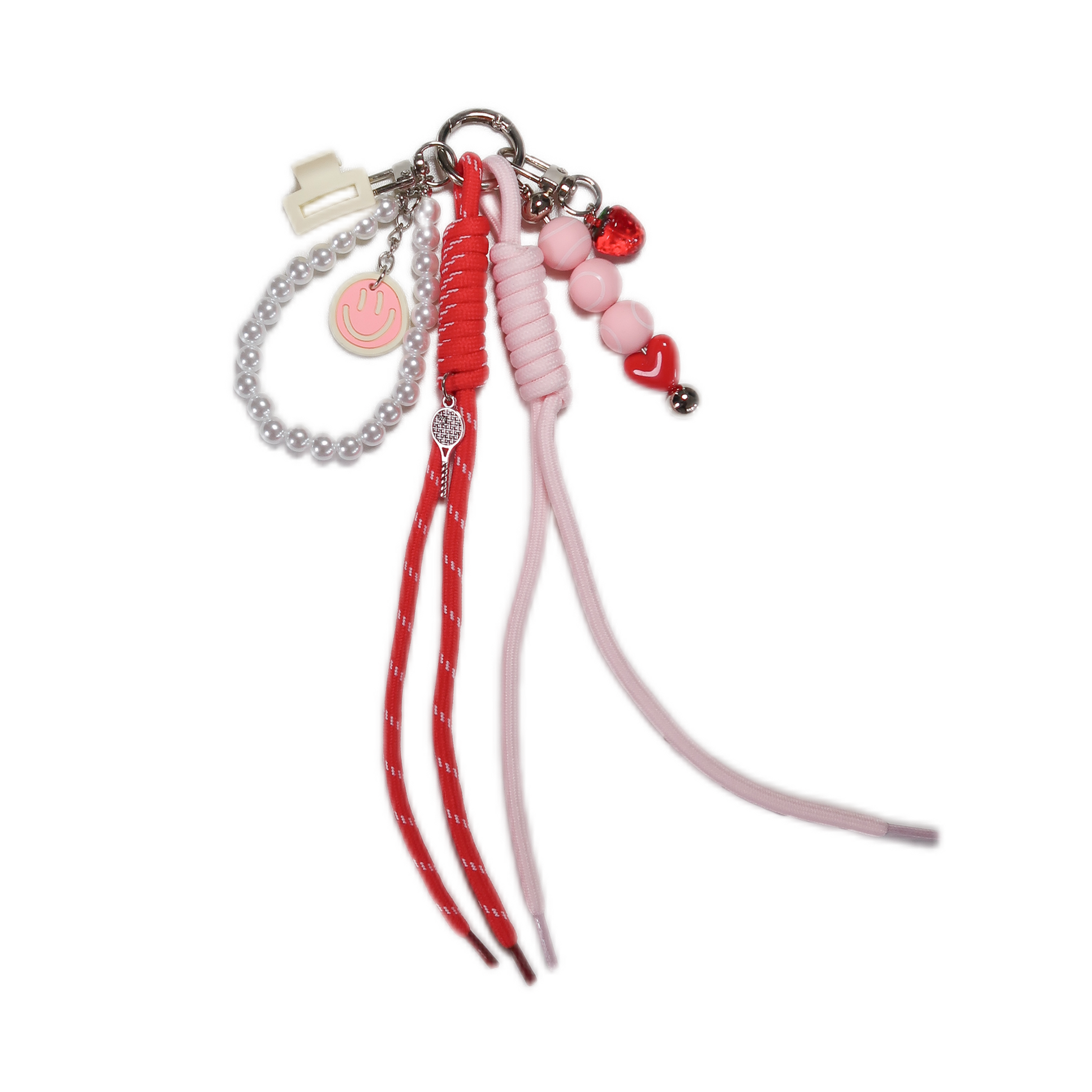 Hand-curated charm with silicone tennis ball beads, claw clip, faux pearls and miniature strawberry.