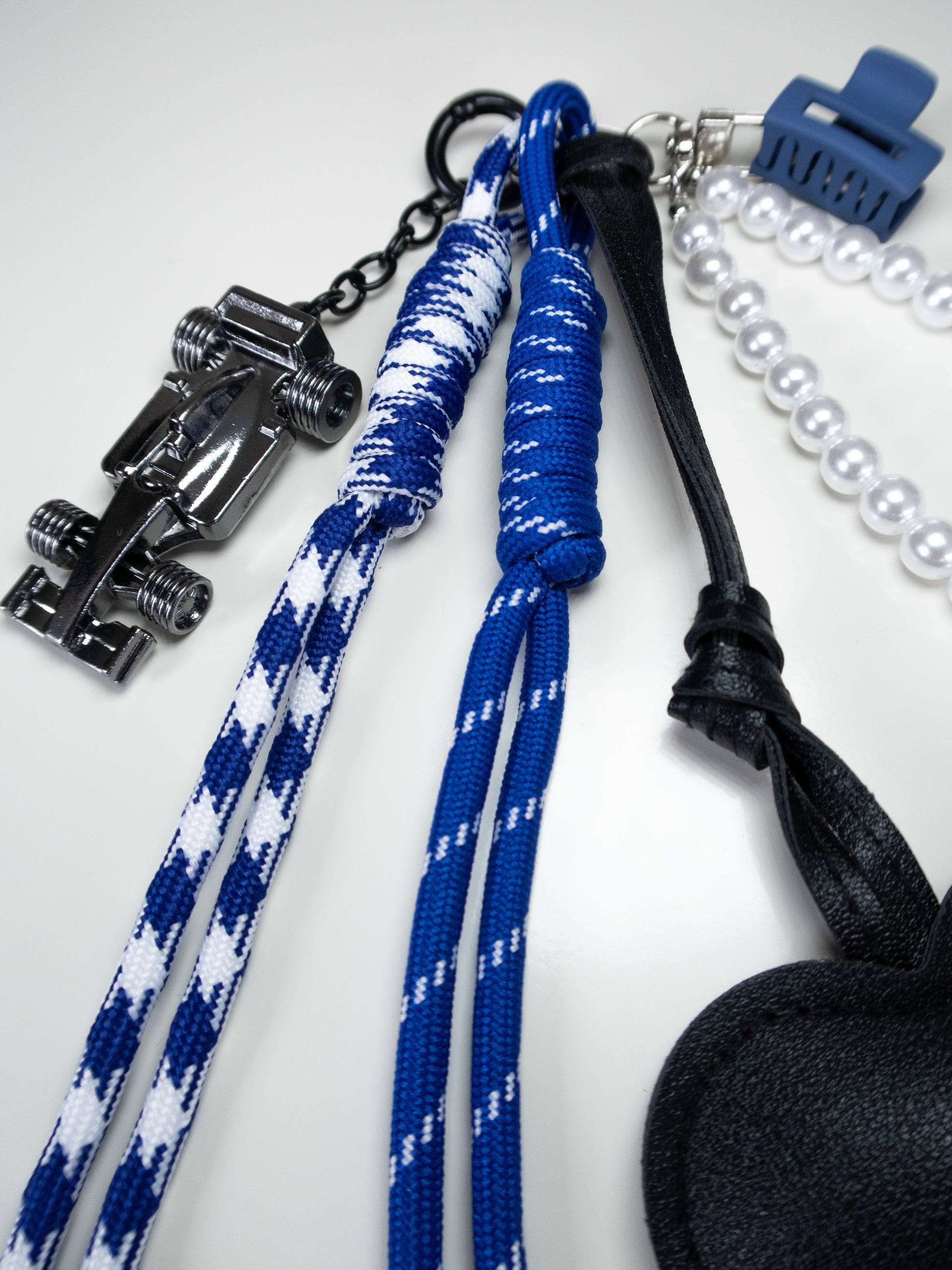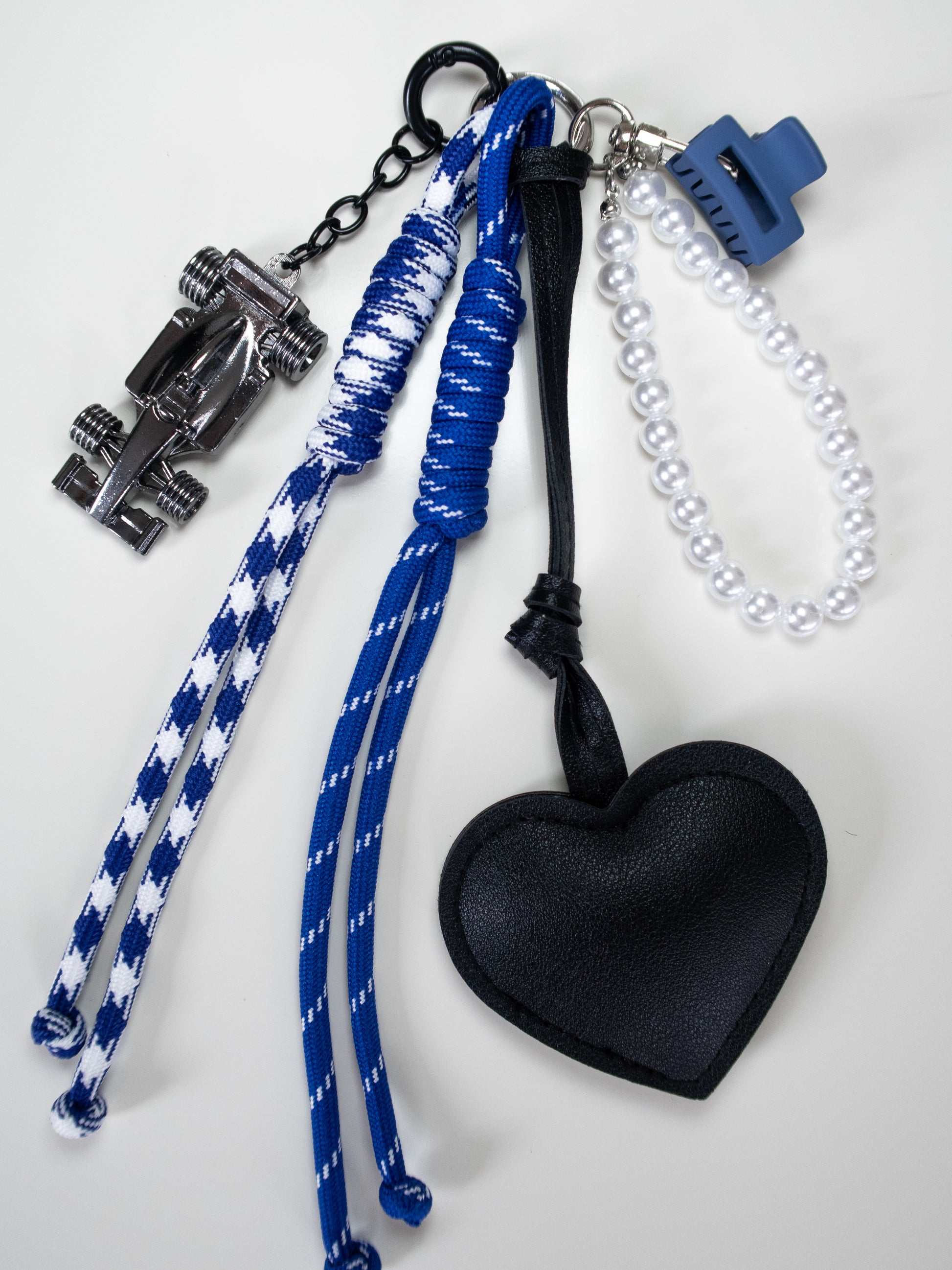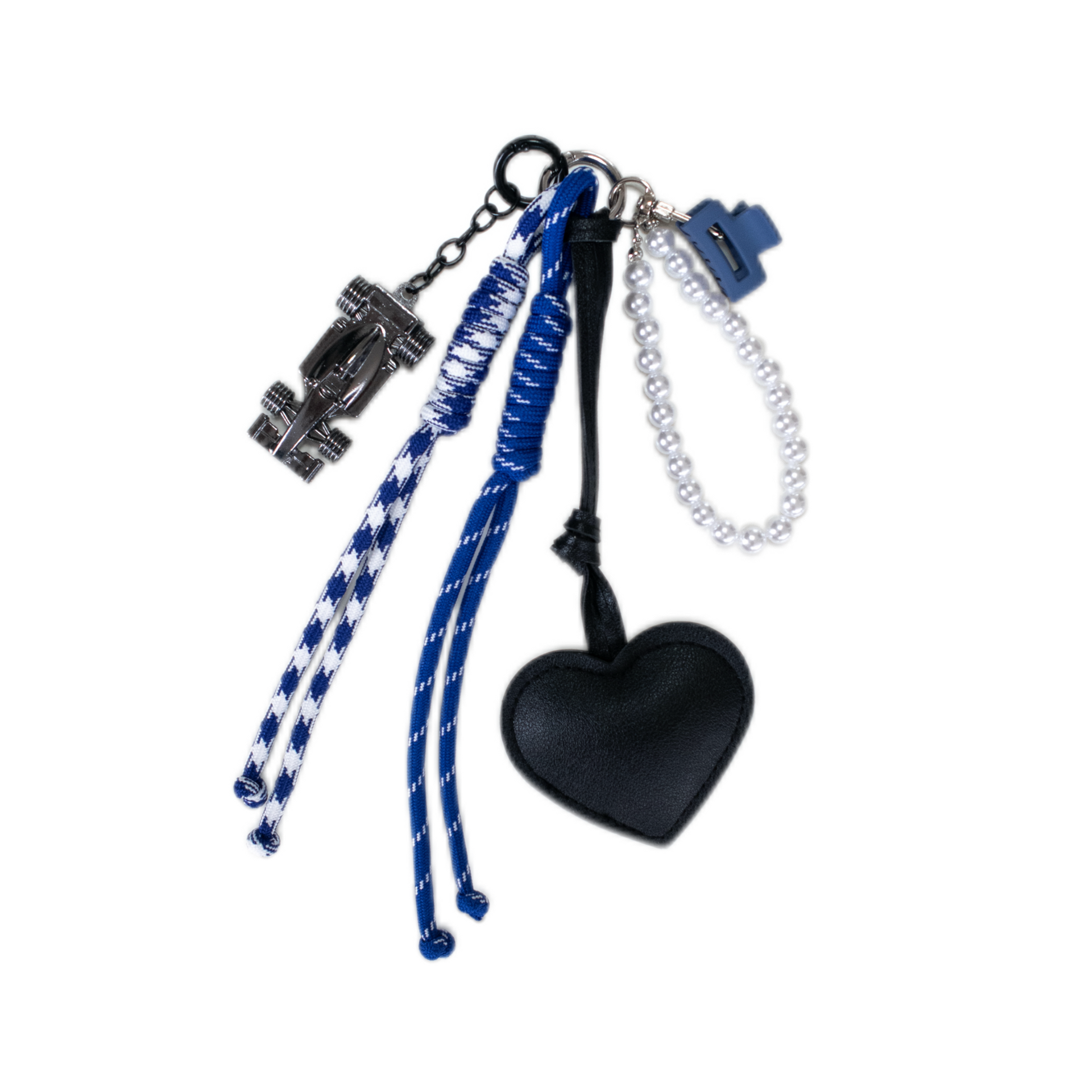 Hand-curated charm with PU leather heart, pearl-effect beads, miniature claw clip and your very own pocket-sized race car.