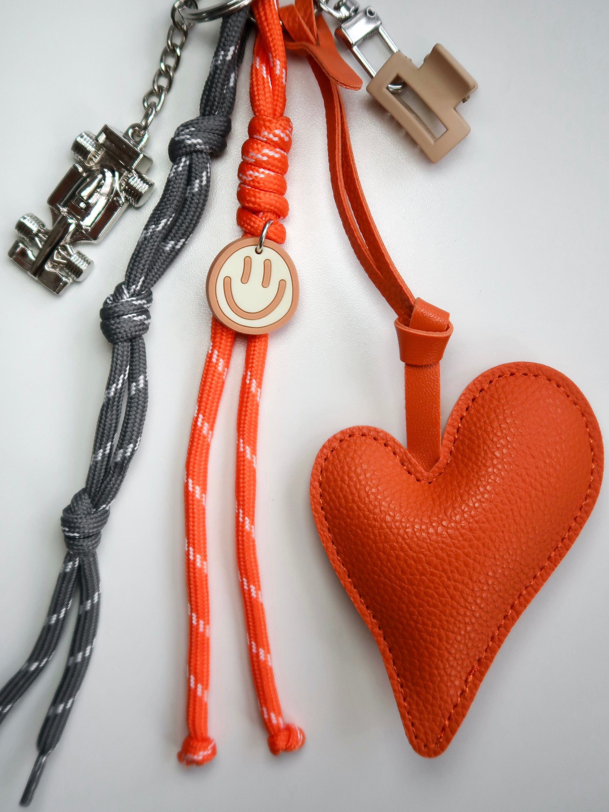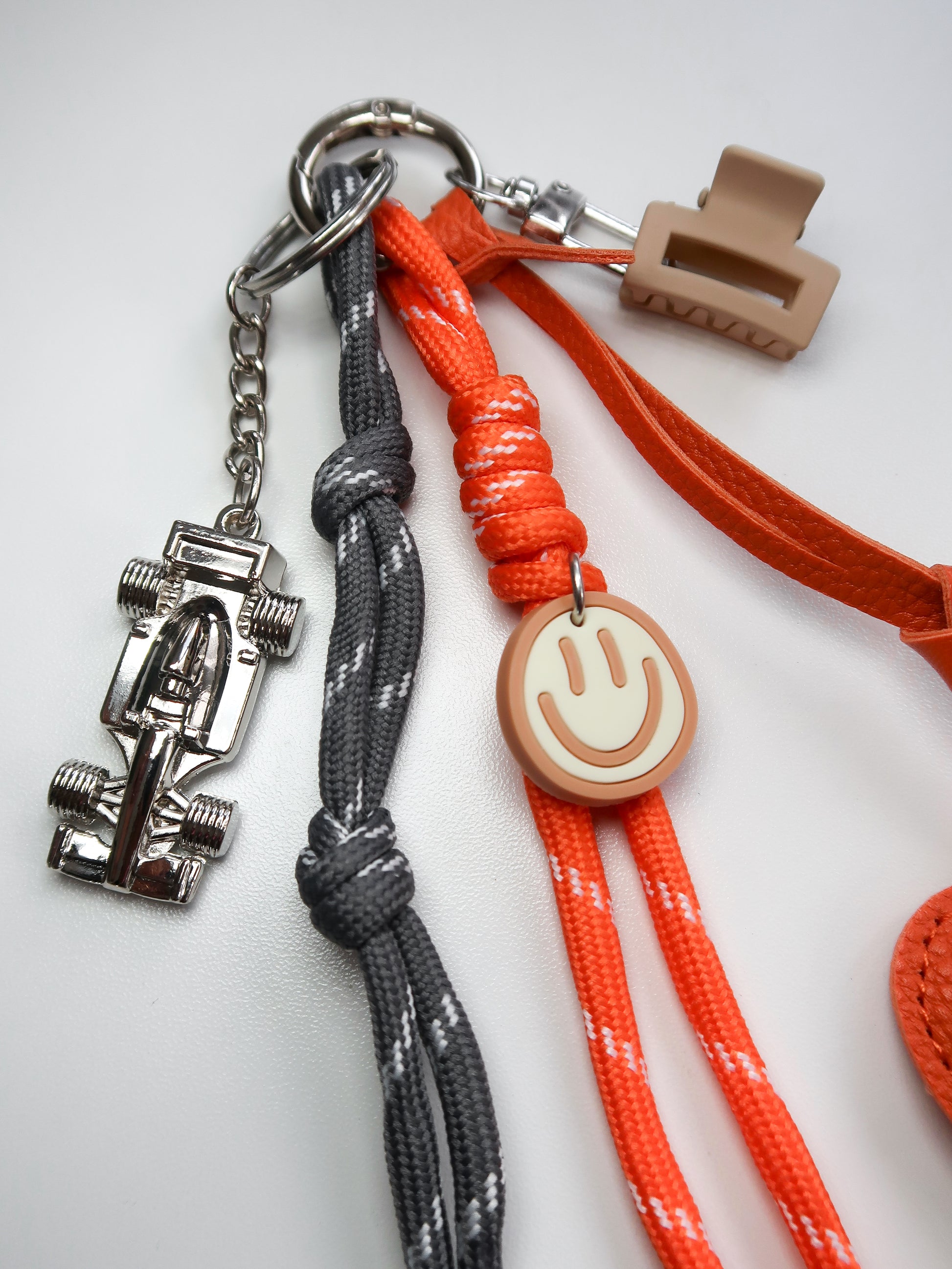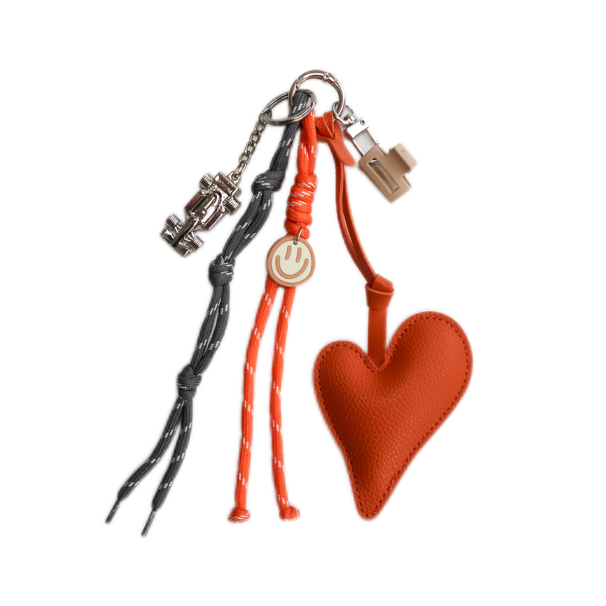 Hand-curated charm with irregular PU leather heart, nylon rope tassels, claw clip and your very own pocket-sized racecar.