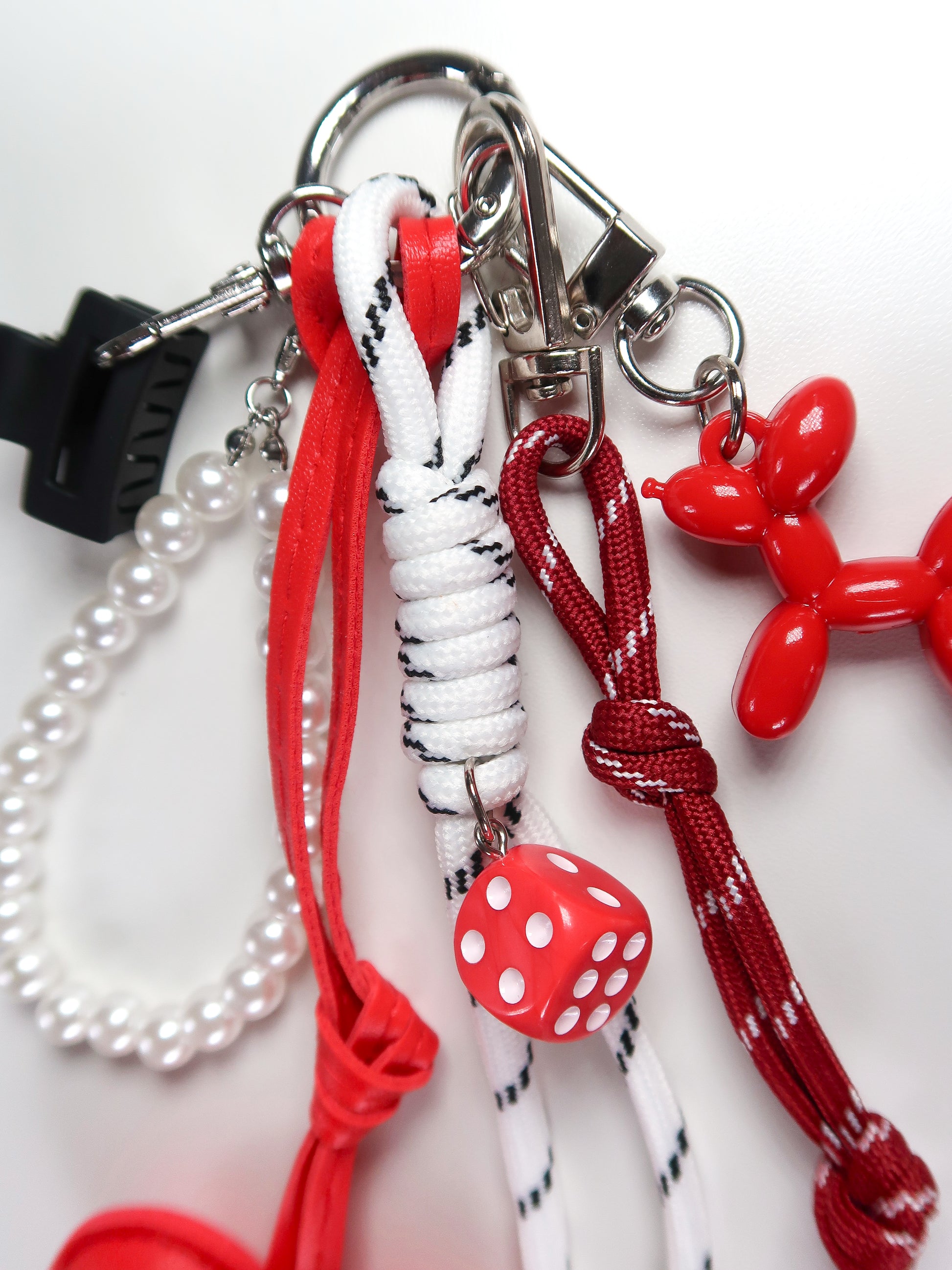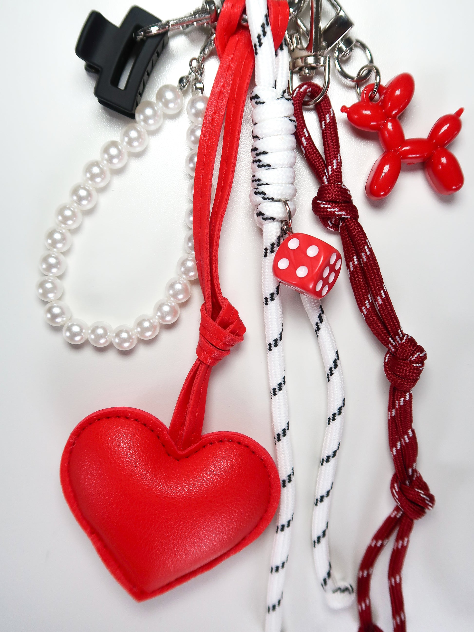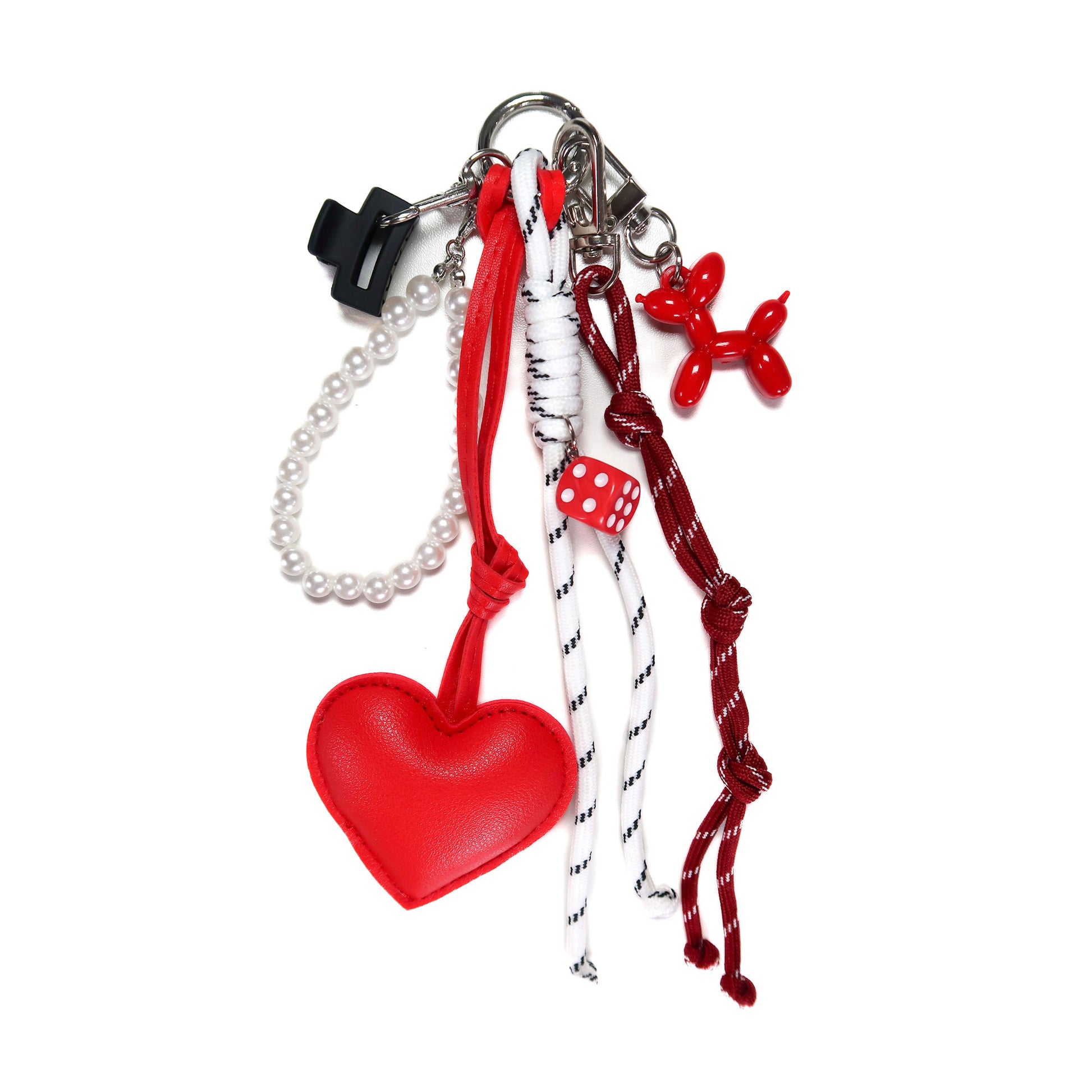Hand-curated charm with PU leather heart, pearl-effect beads and balloon dog, complete with a miniature claw clip.