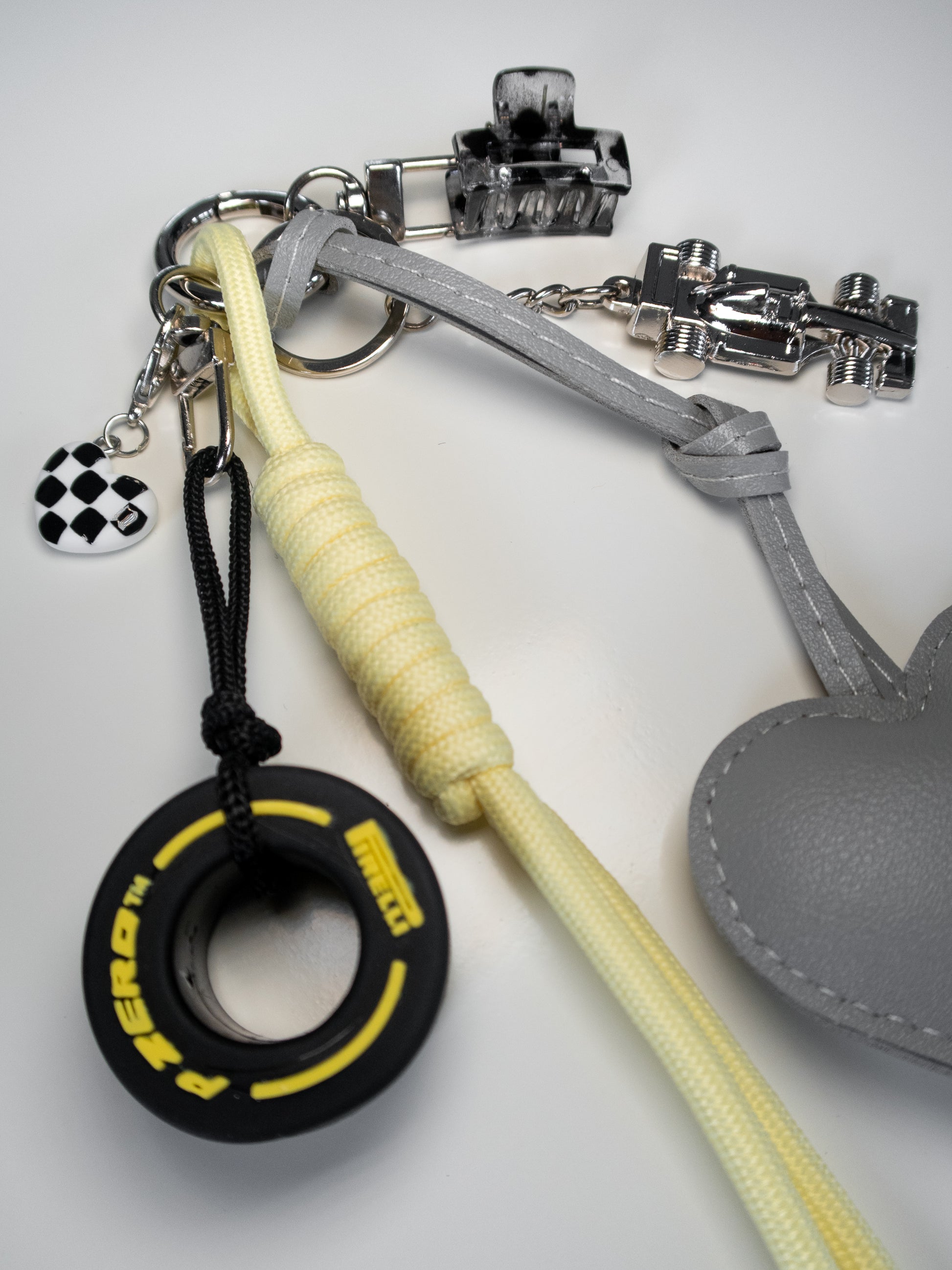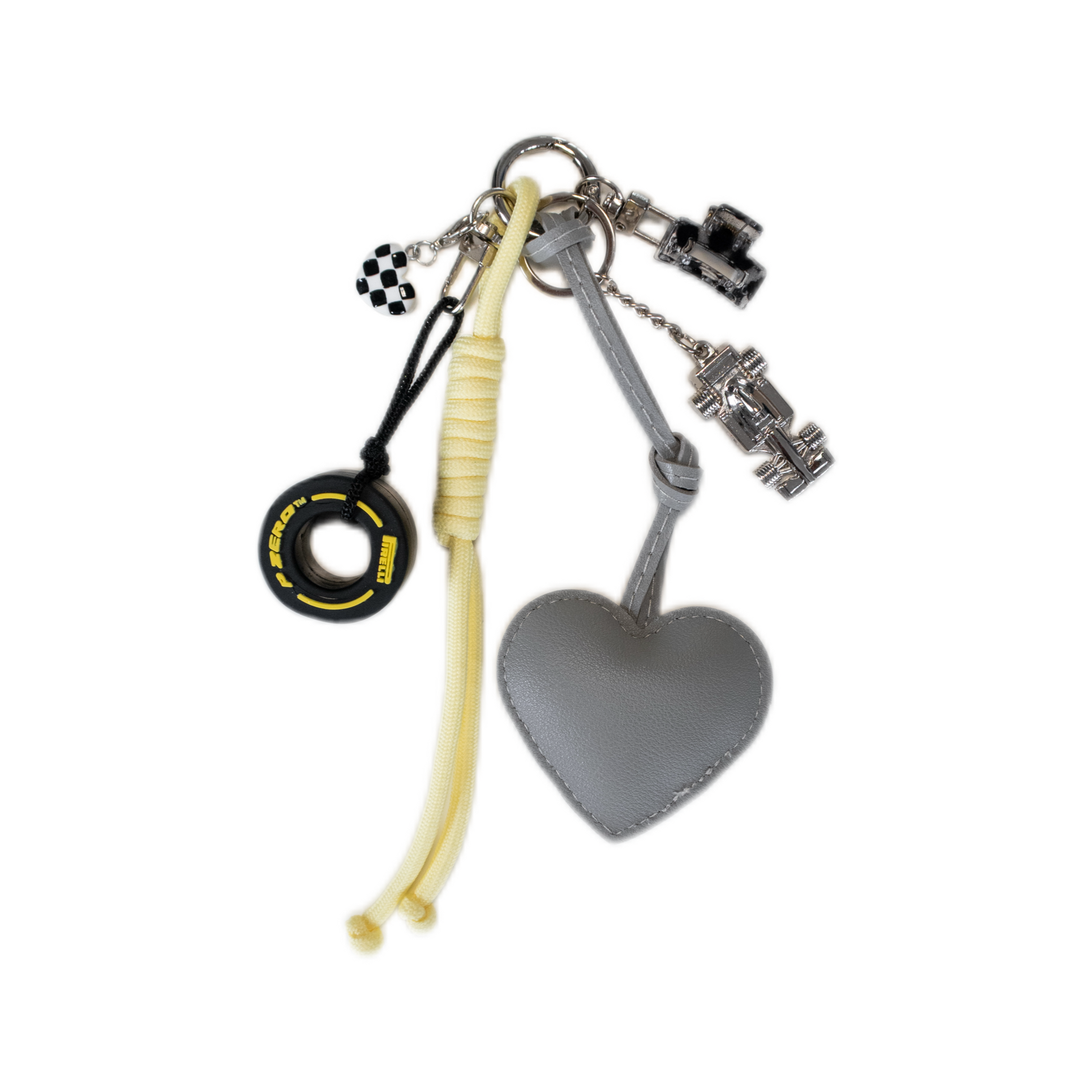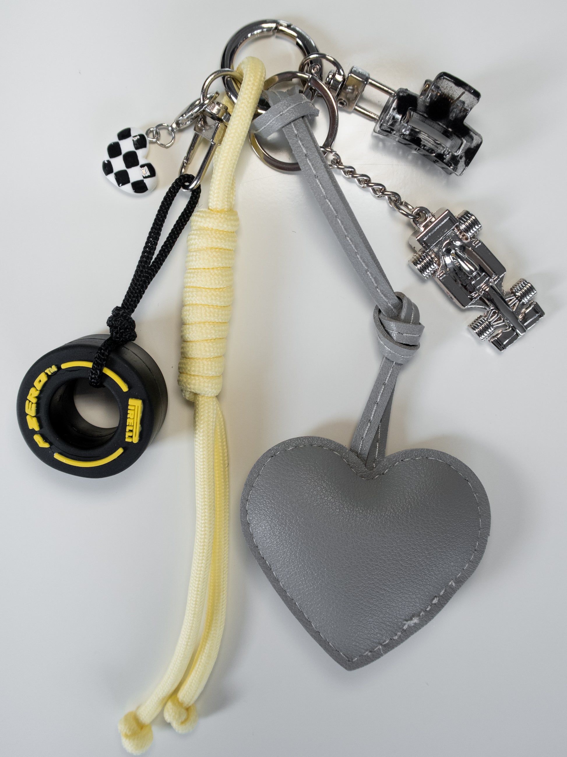 Hand-curated charm with chequered heart, PU leather heart, miniature tyre and your very own pocket-sized race car.