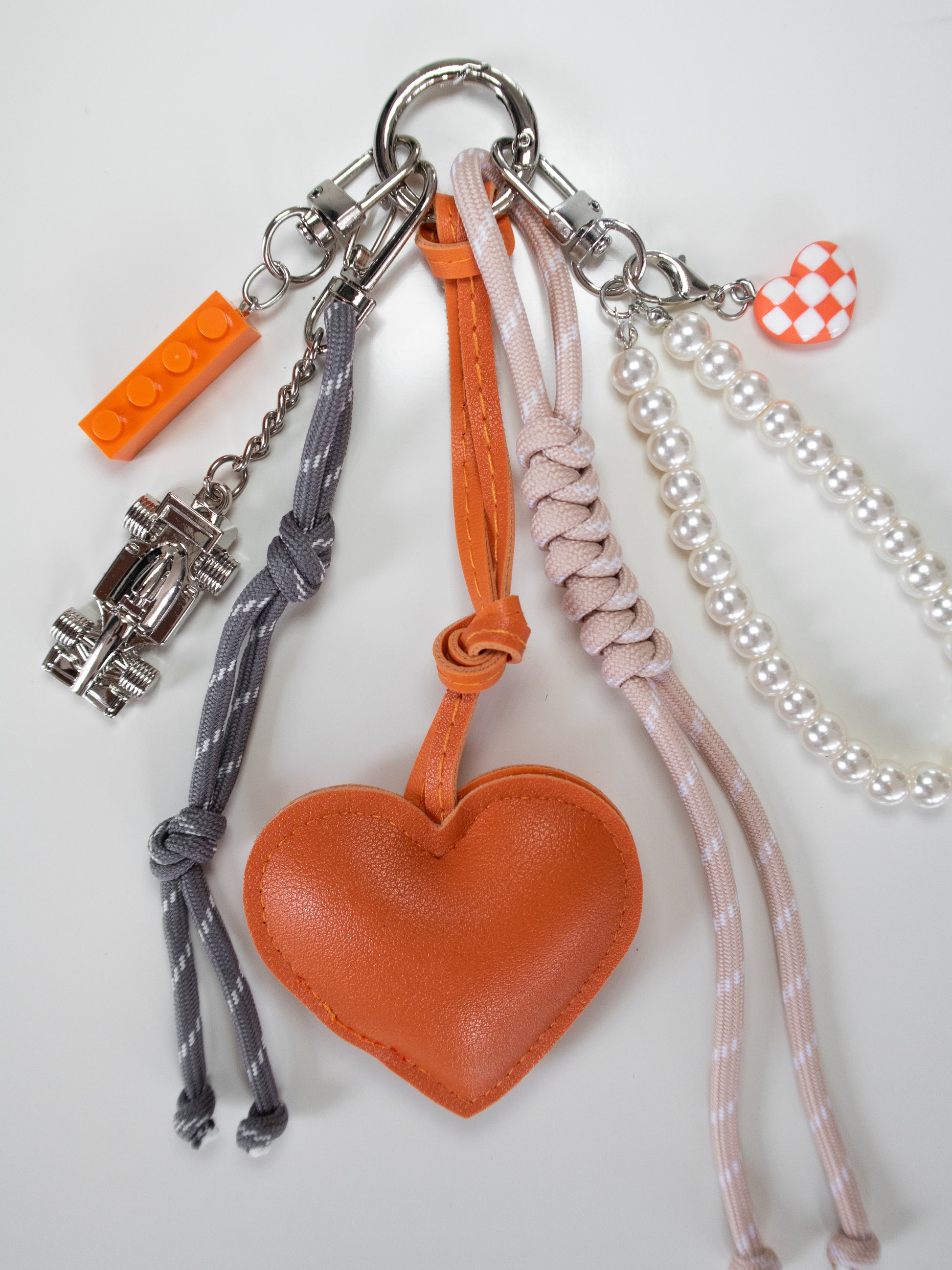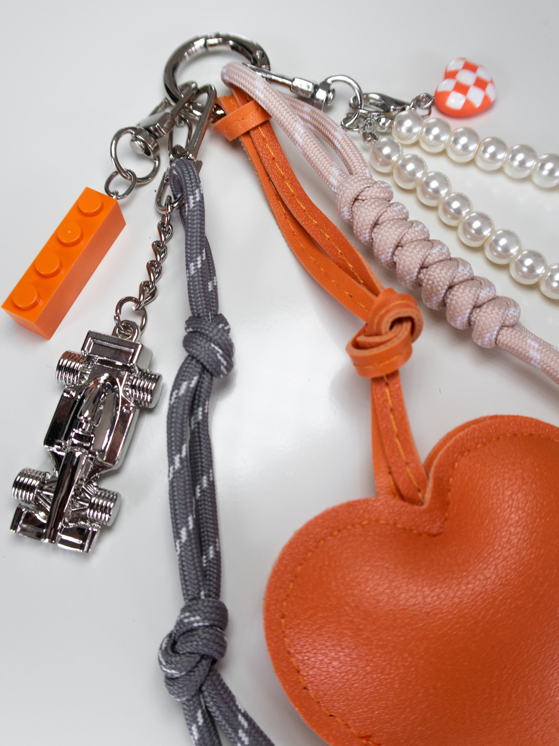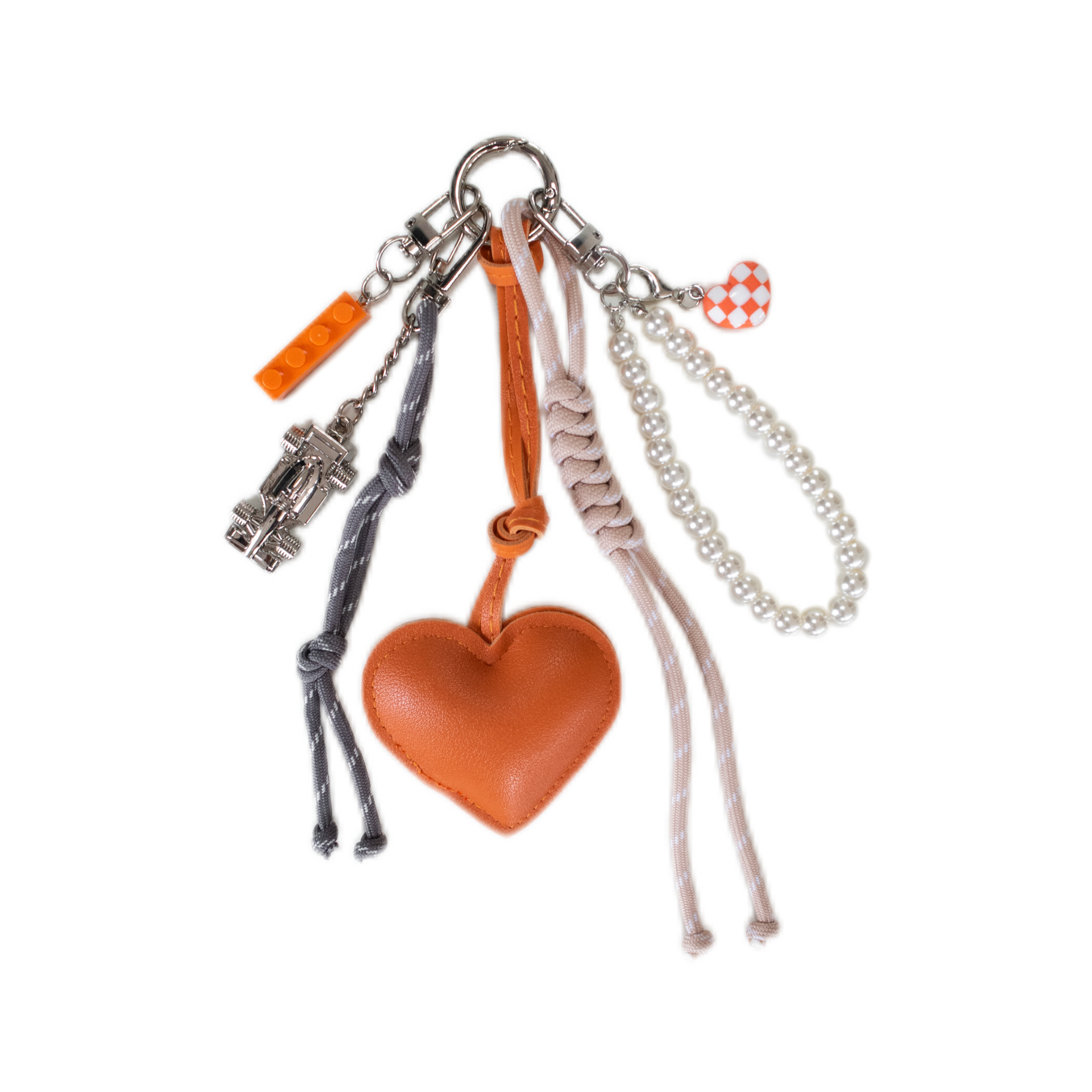 Hand-curated charm with papaya chequered heart, PU leather heart, pearl-effect beads and your very own pocket-sized race car.