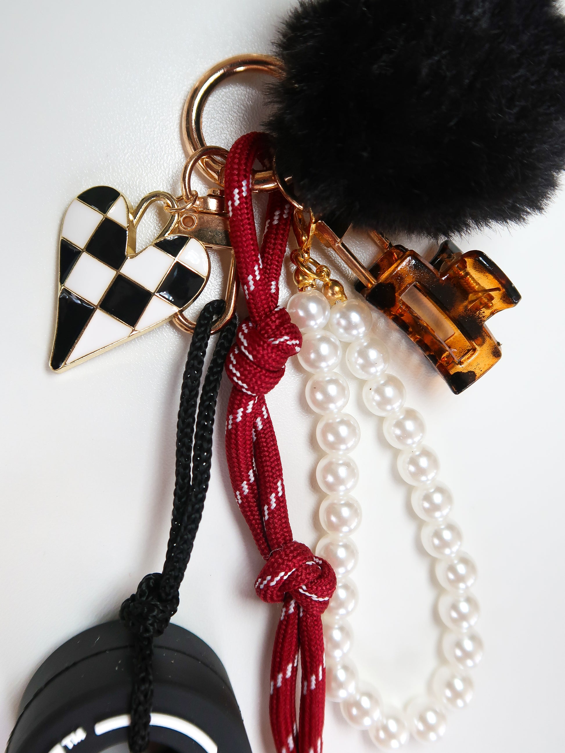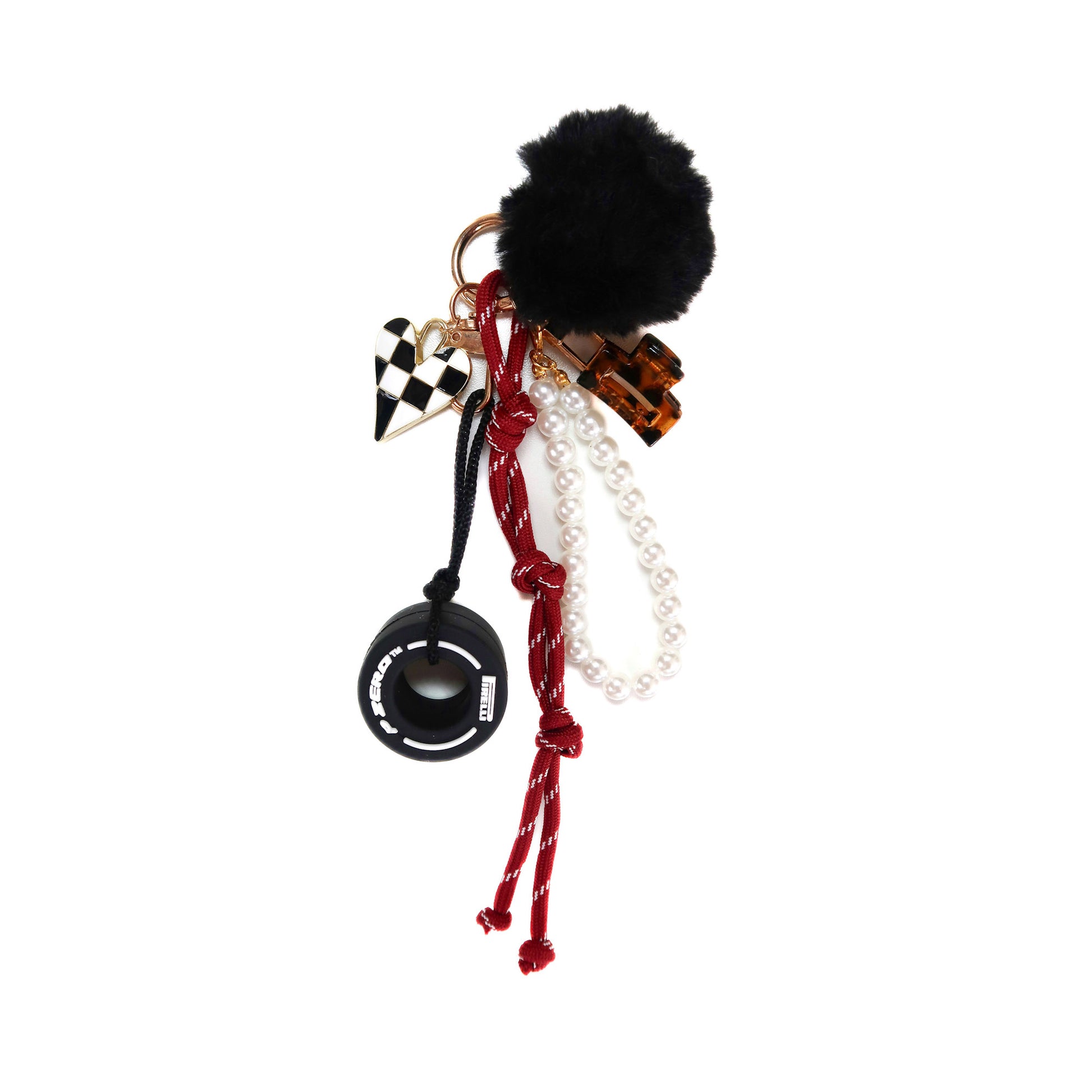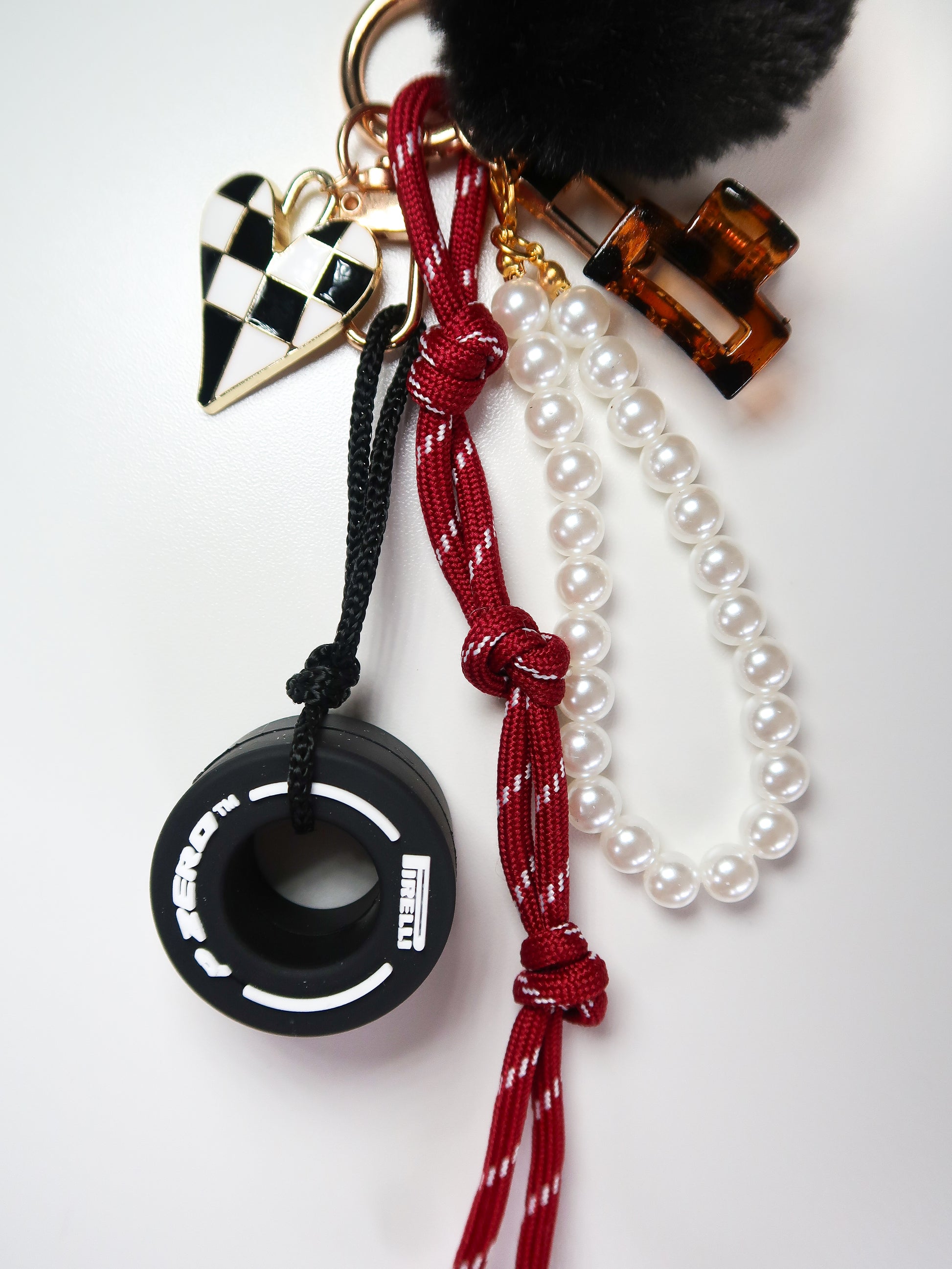 Hand-curated charm with chequered heart, pom-pom, pearl-effect beads and your very own miniature tyre.