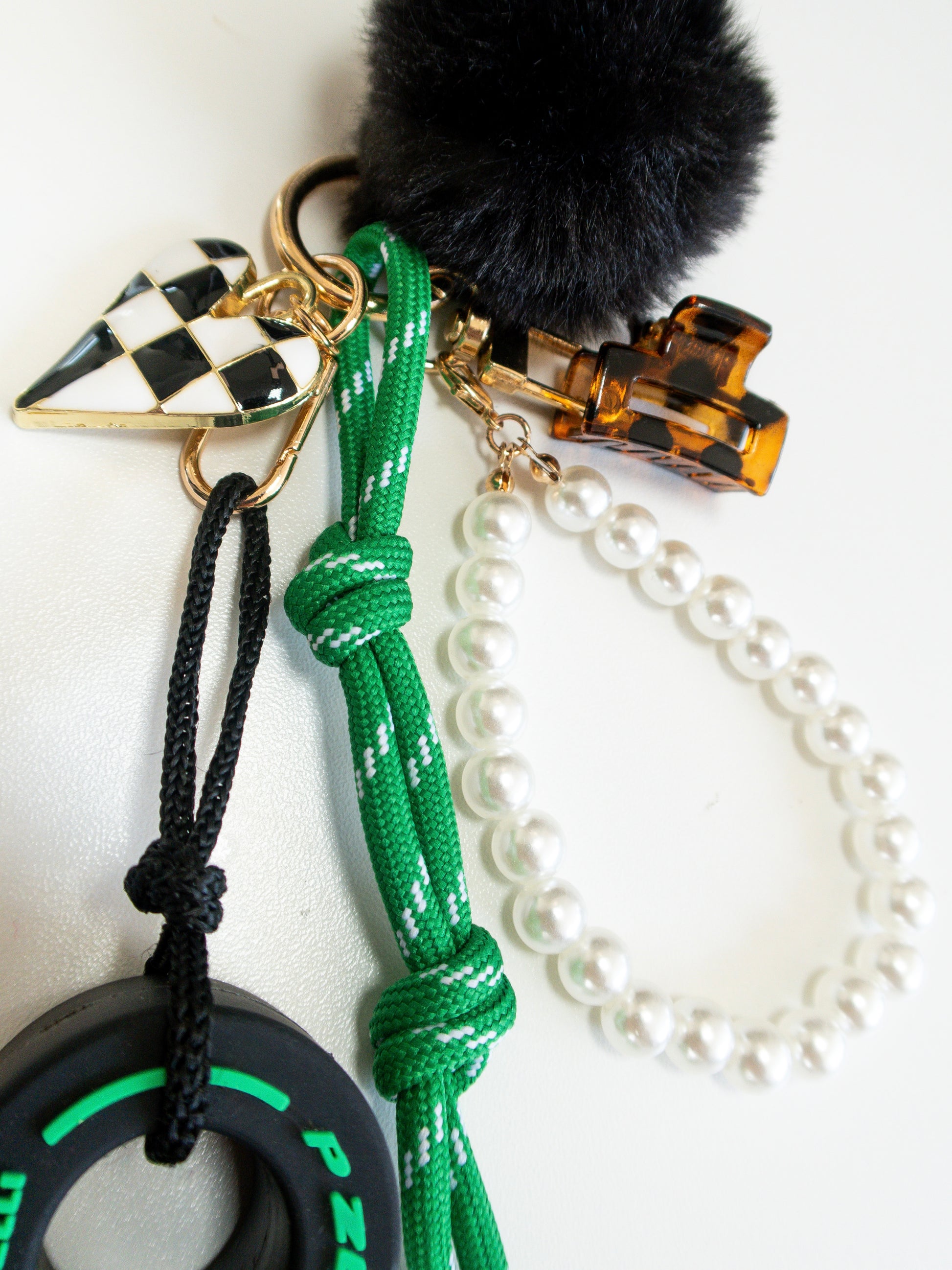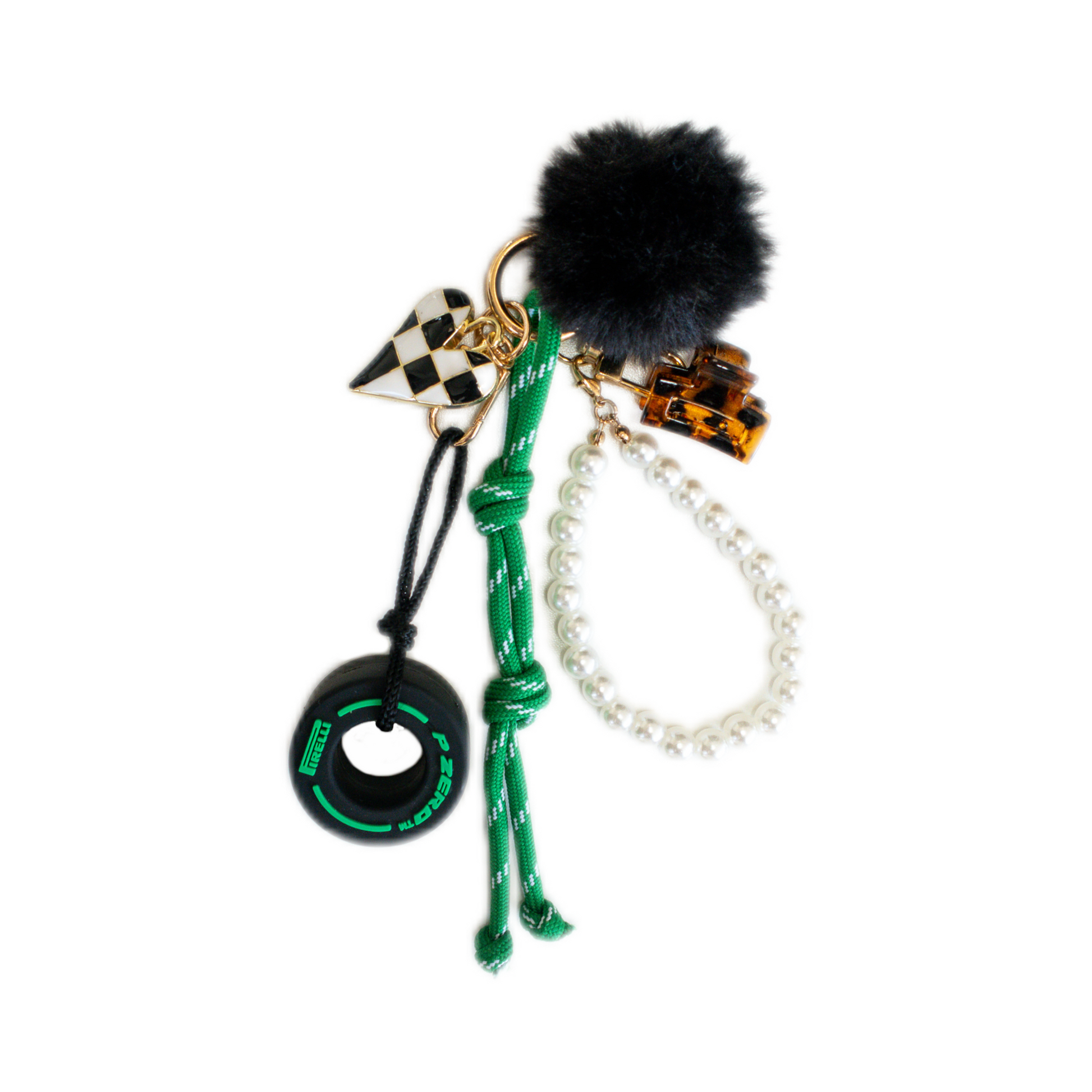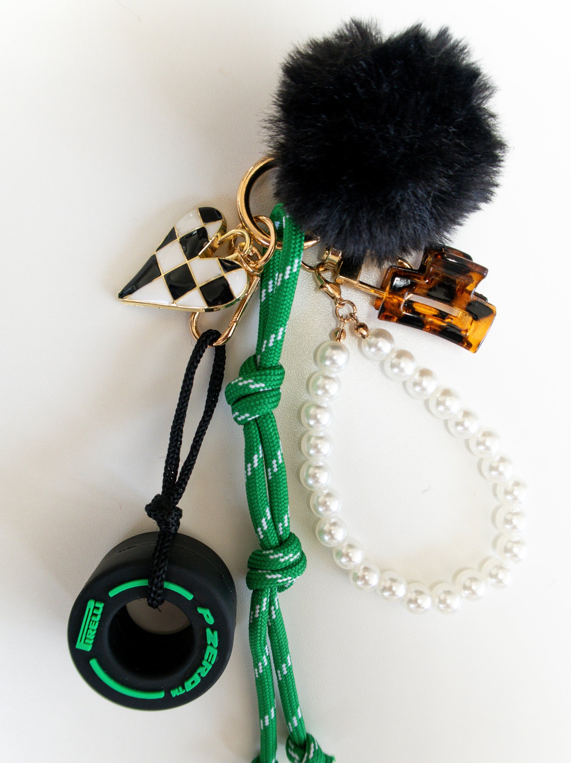 Hand-curated charm with chequered heart, pom-pom, pearl-effect beads and your very own miniature tyre.