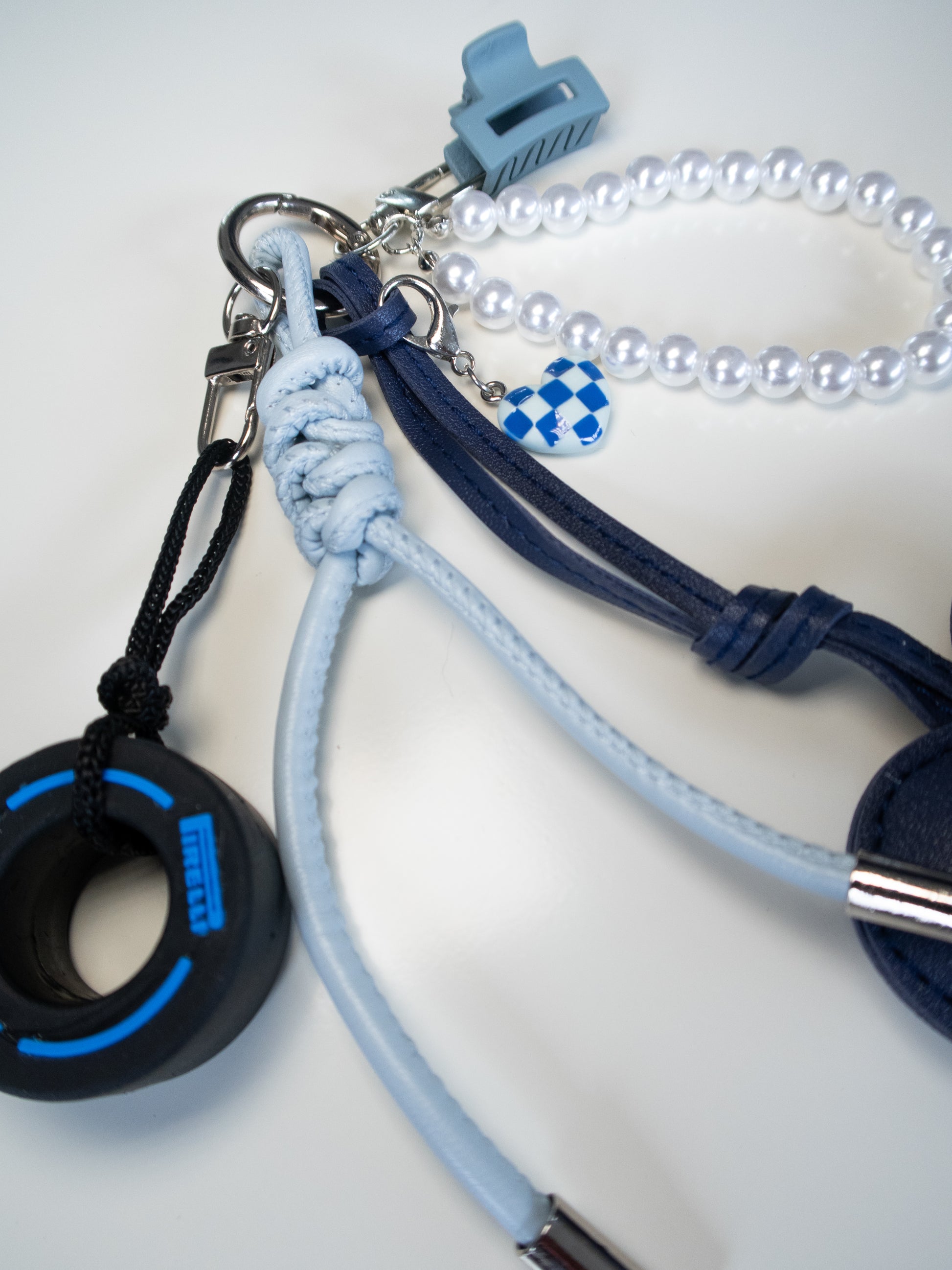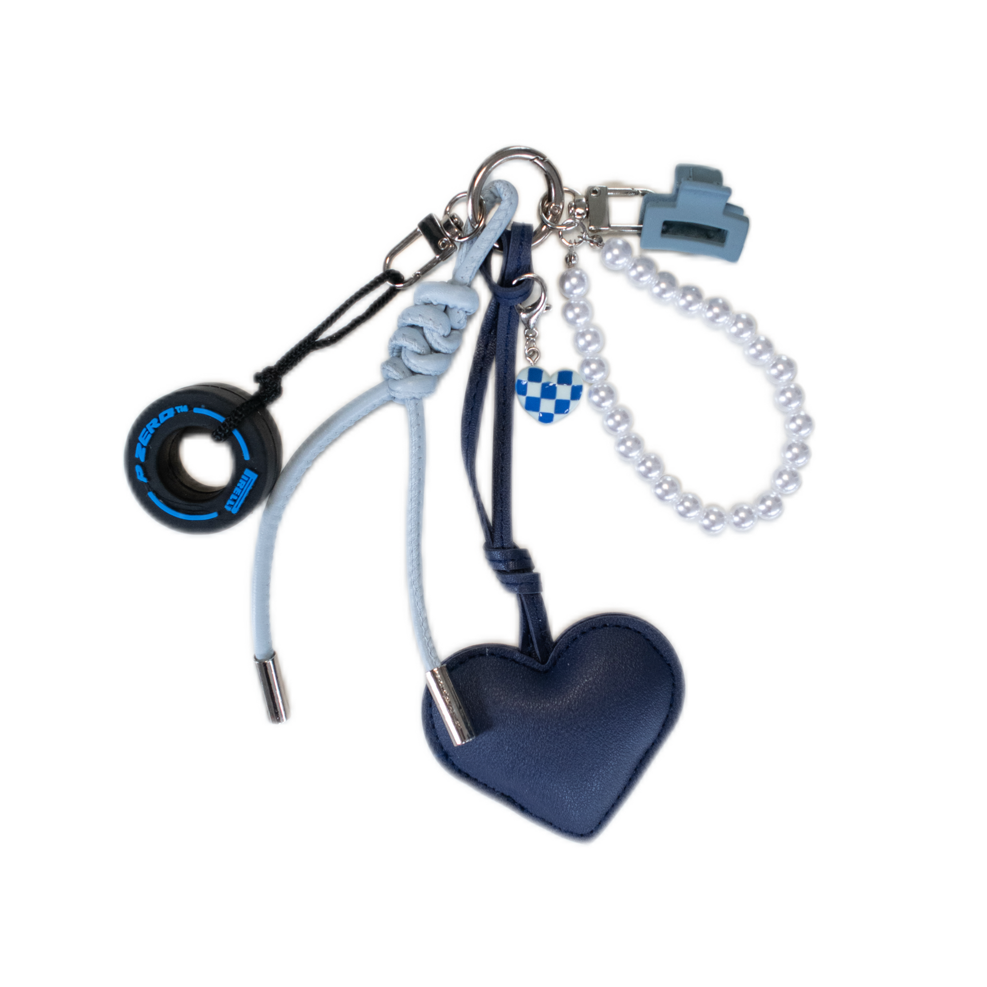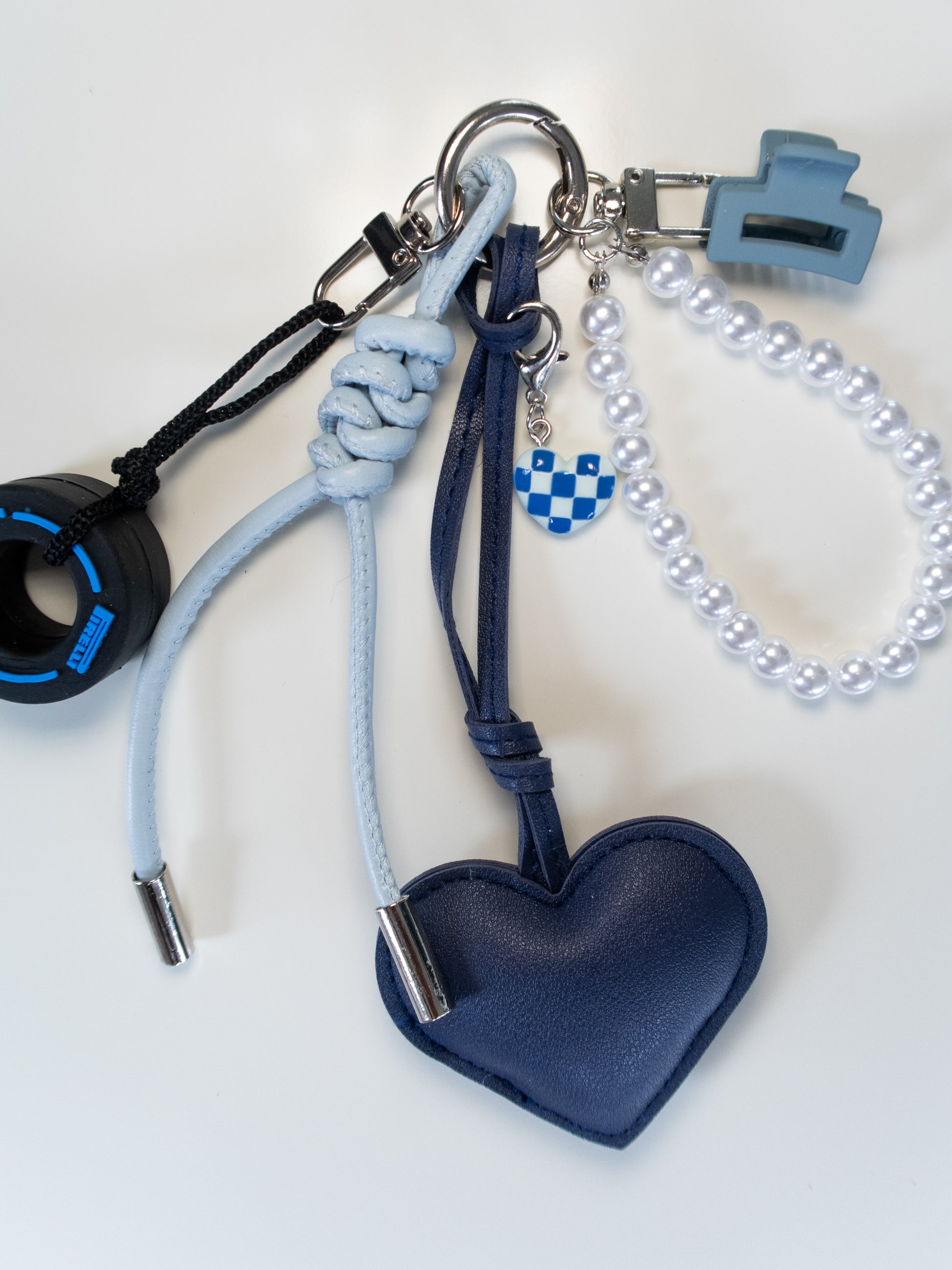 Hand-curated charm with blue chequered heart, PU leather heart, pearl-effect beads and your very own miniature tyre.