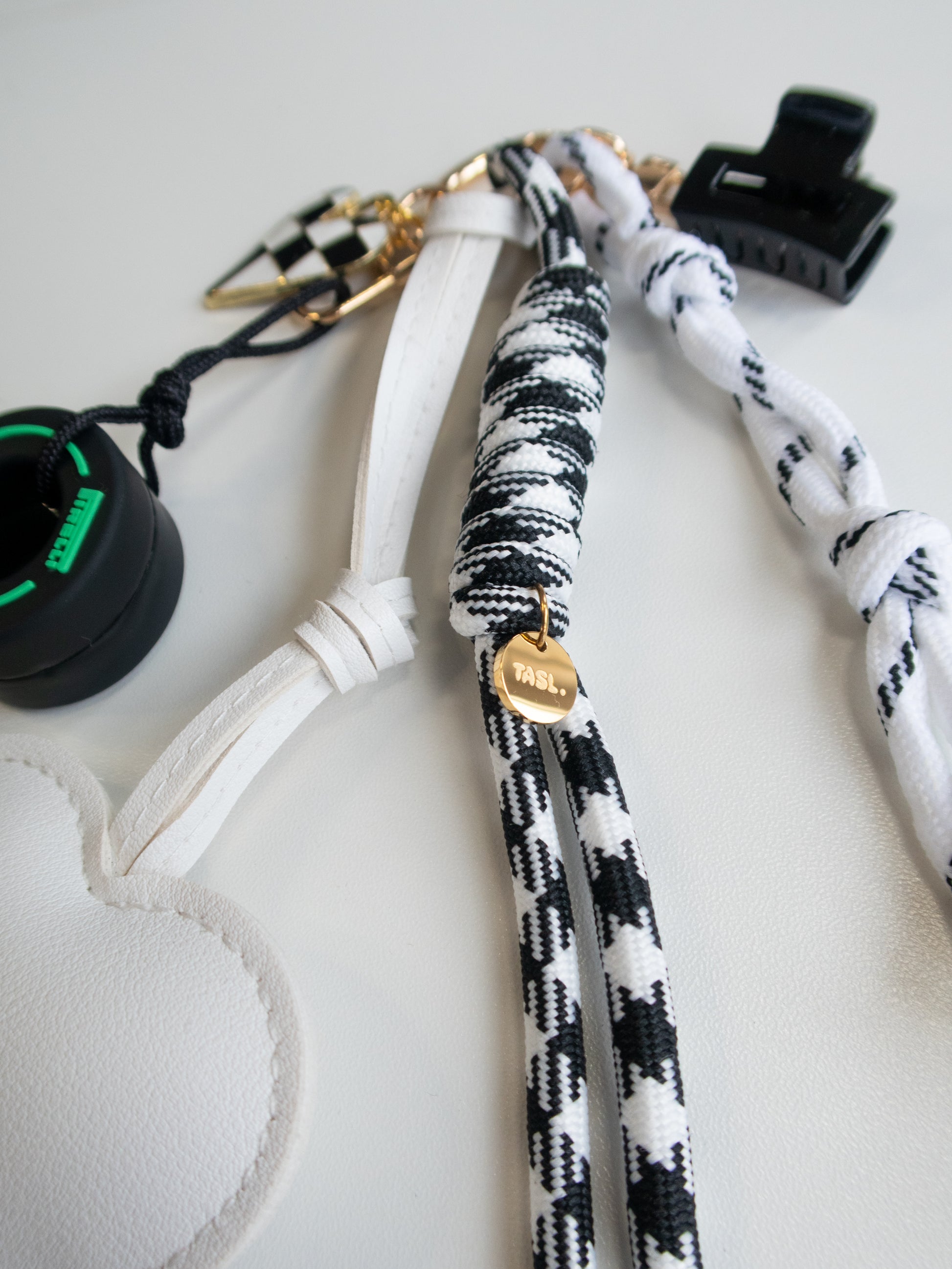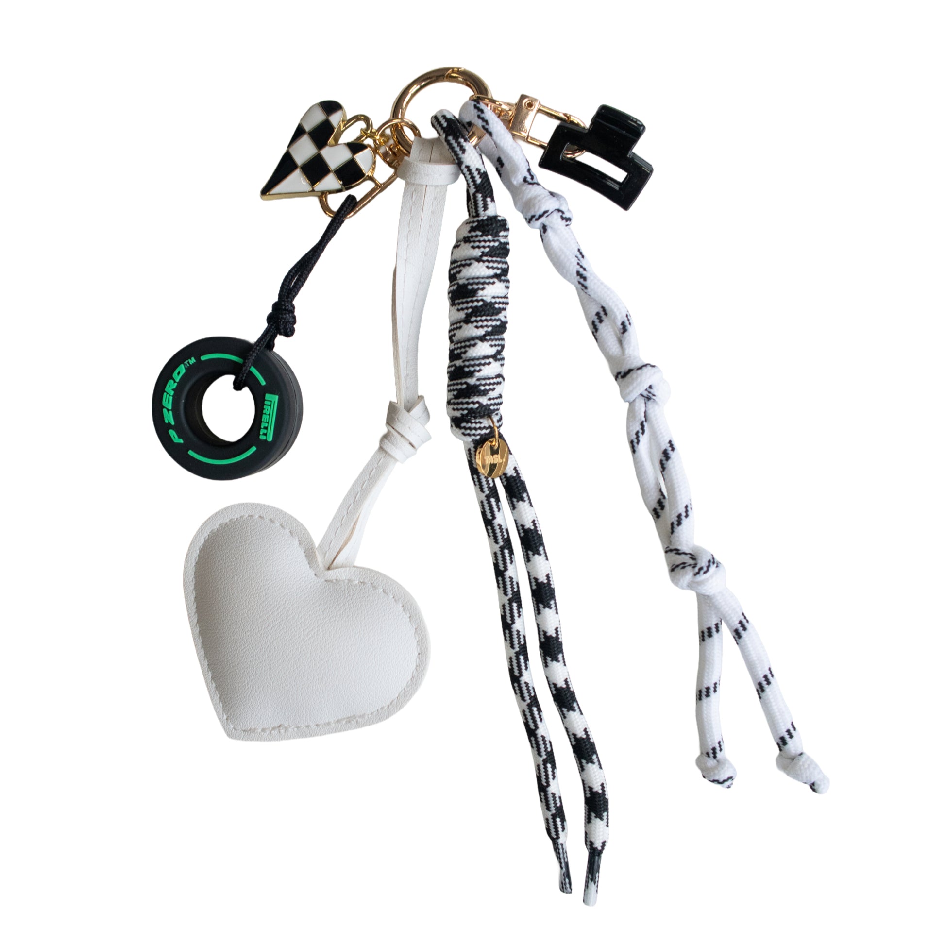 Gold-toned hardware, PU leather heart, miniature tyre and tiny claw clip.